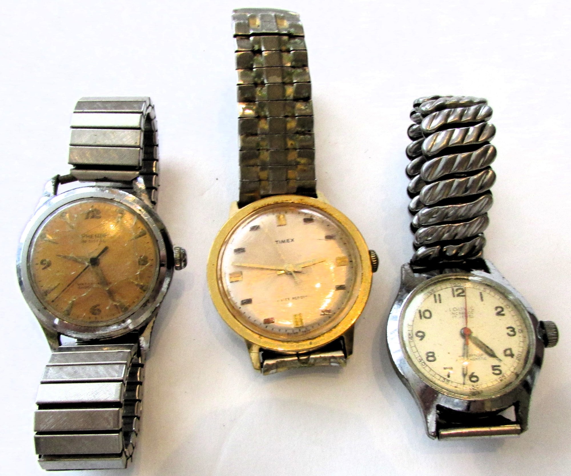 The lot comprised of a Timex, a Phenix Resistal, and a Louvic Incabloc 17 Jewel example. Not currently running.