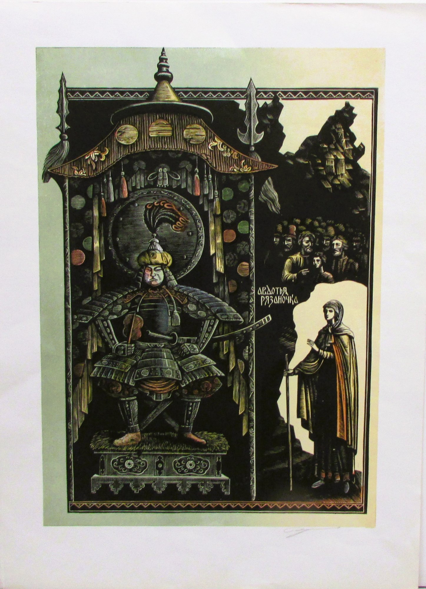 Depicting a samurai warrior with sword. Ink signed in the lower margin. Unframed.