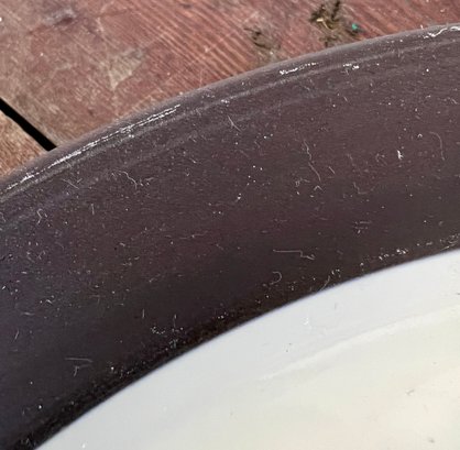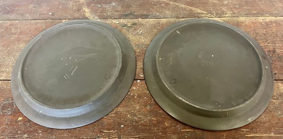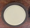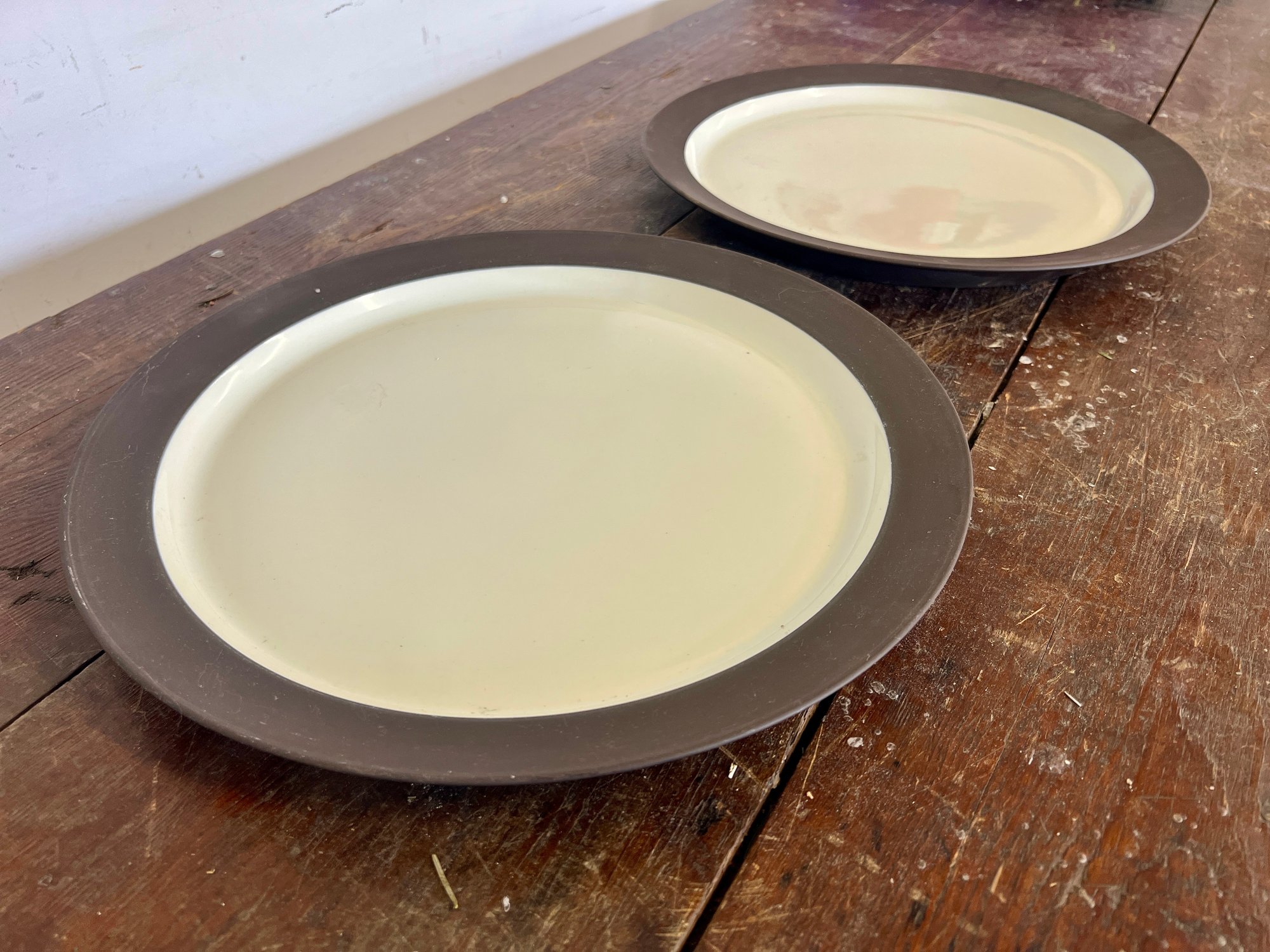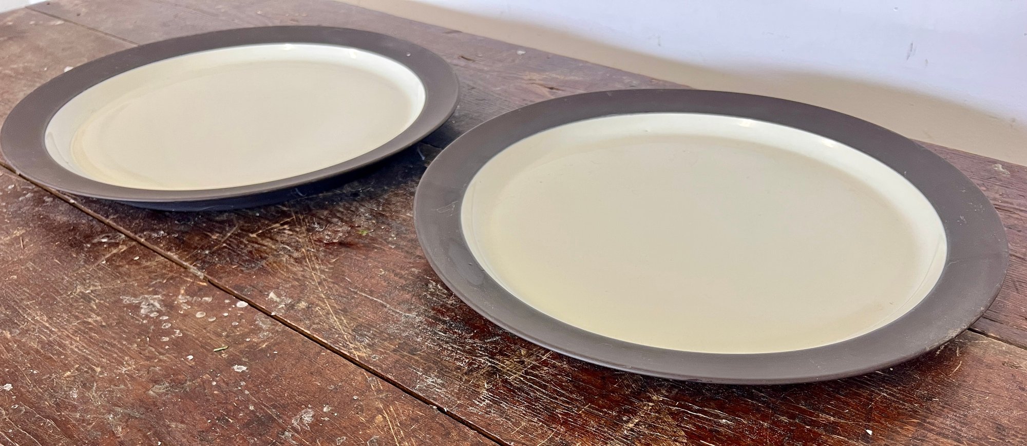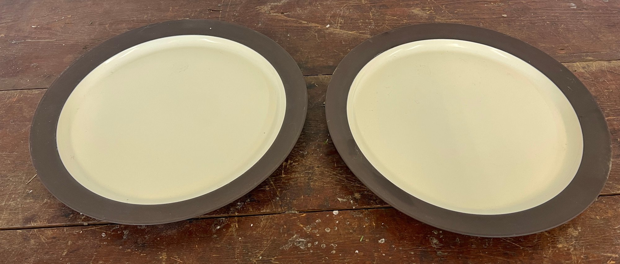 Pair of vintage Dansk Flamestone dinner plates. The matte chocolate brown exterior rim and the underside of the plate have noticeable scratches.