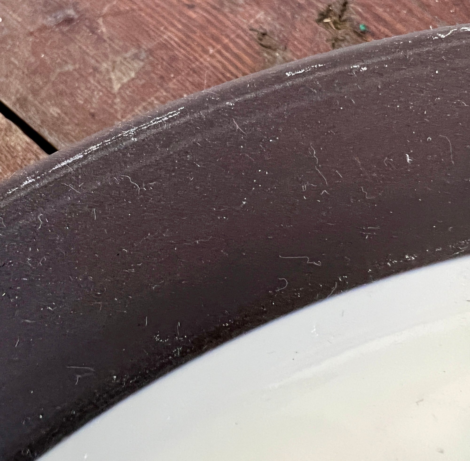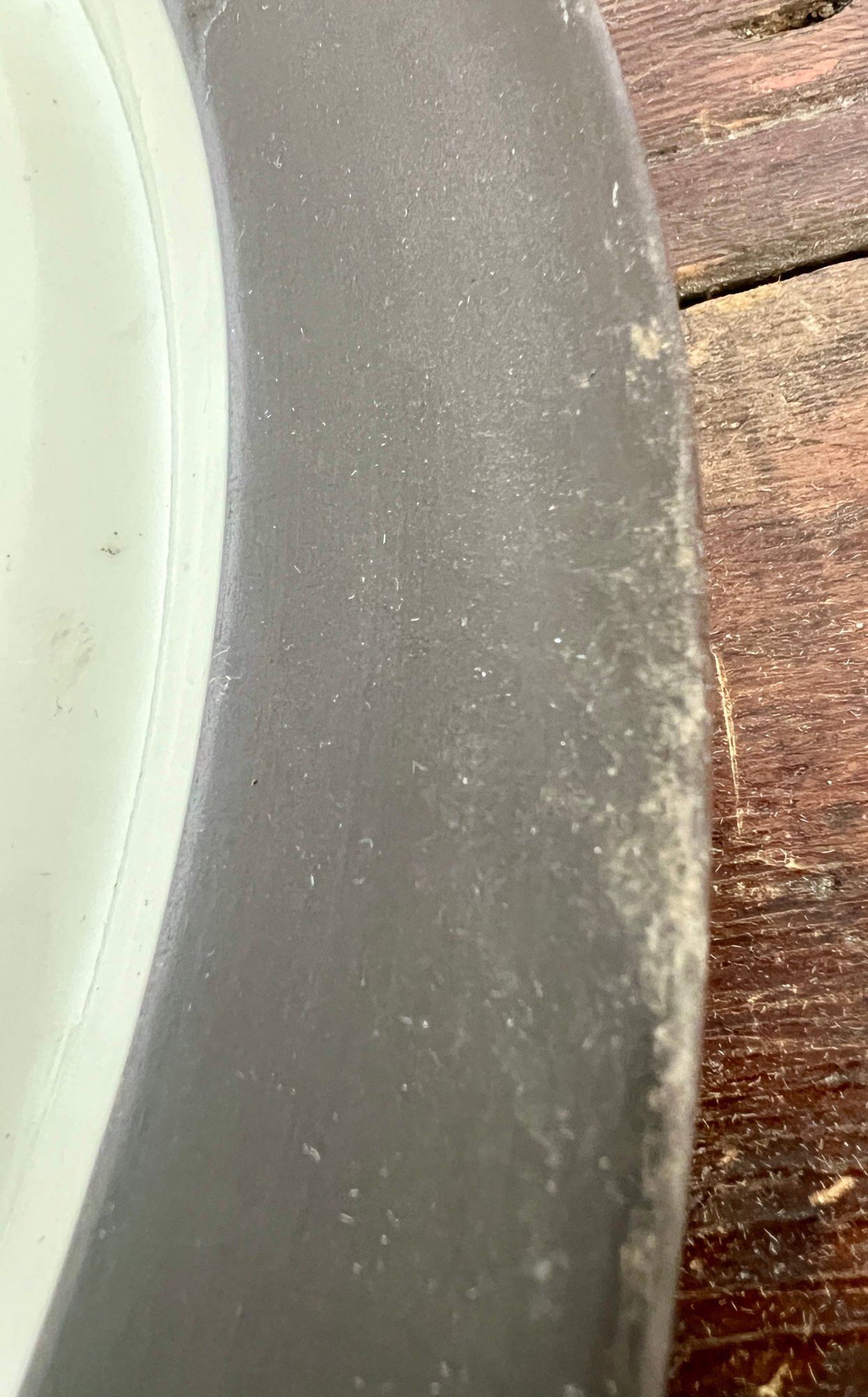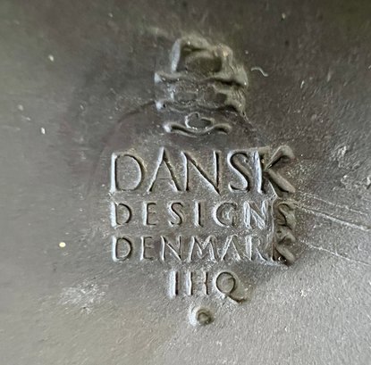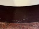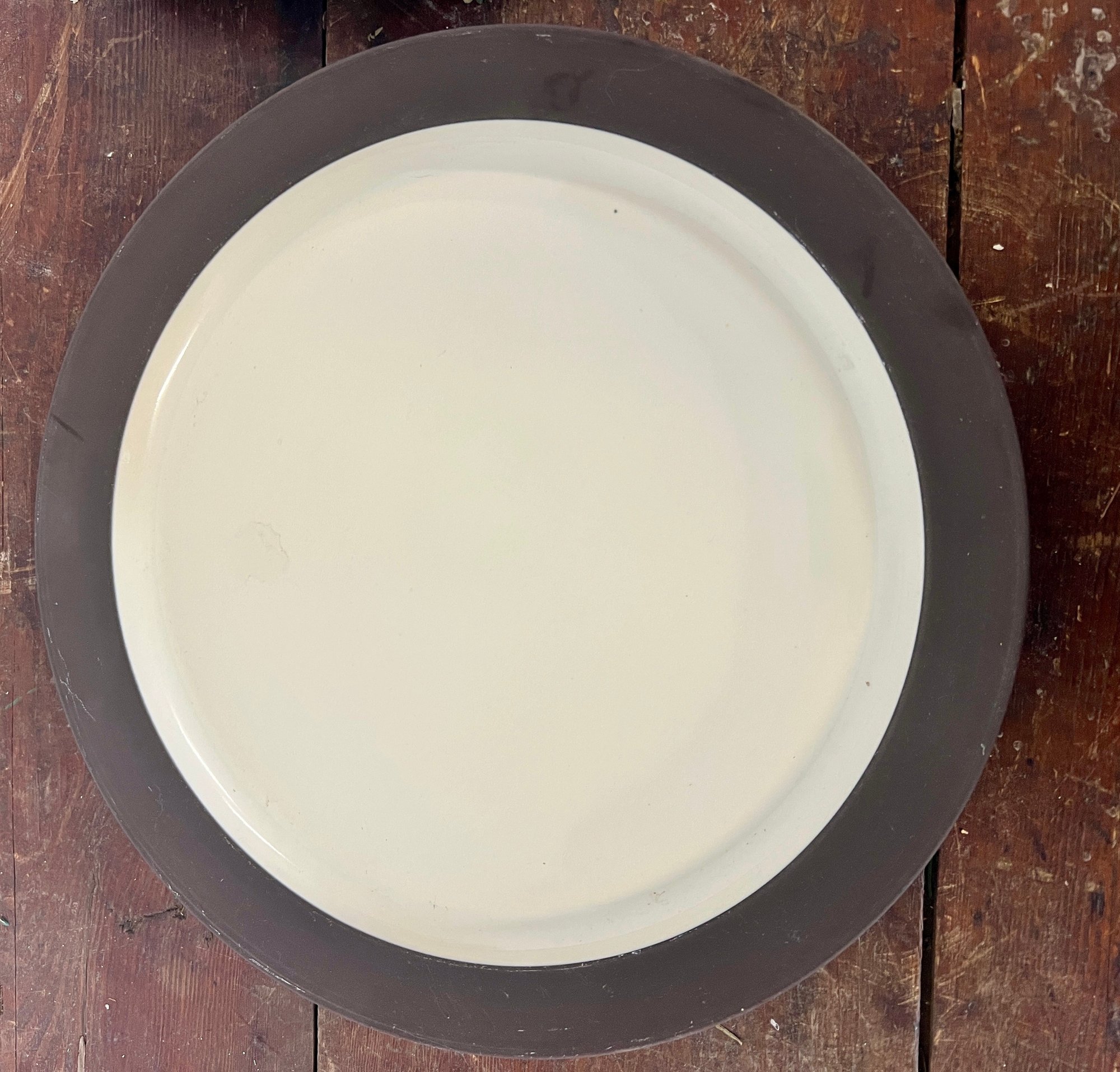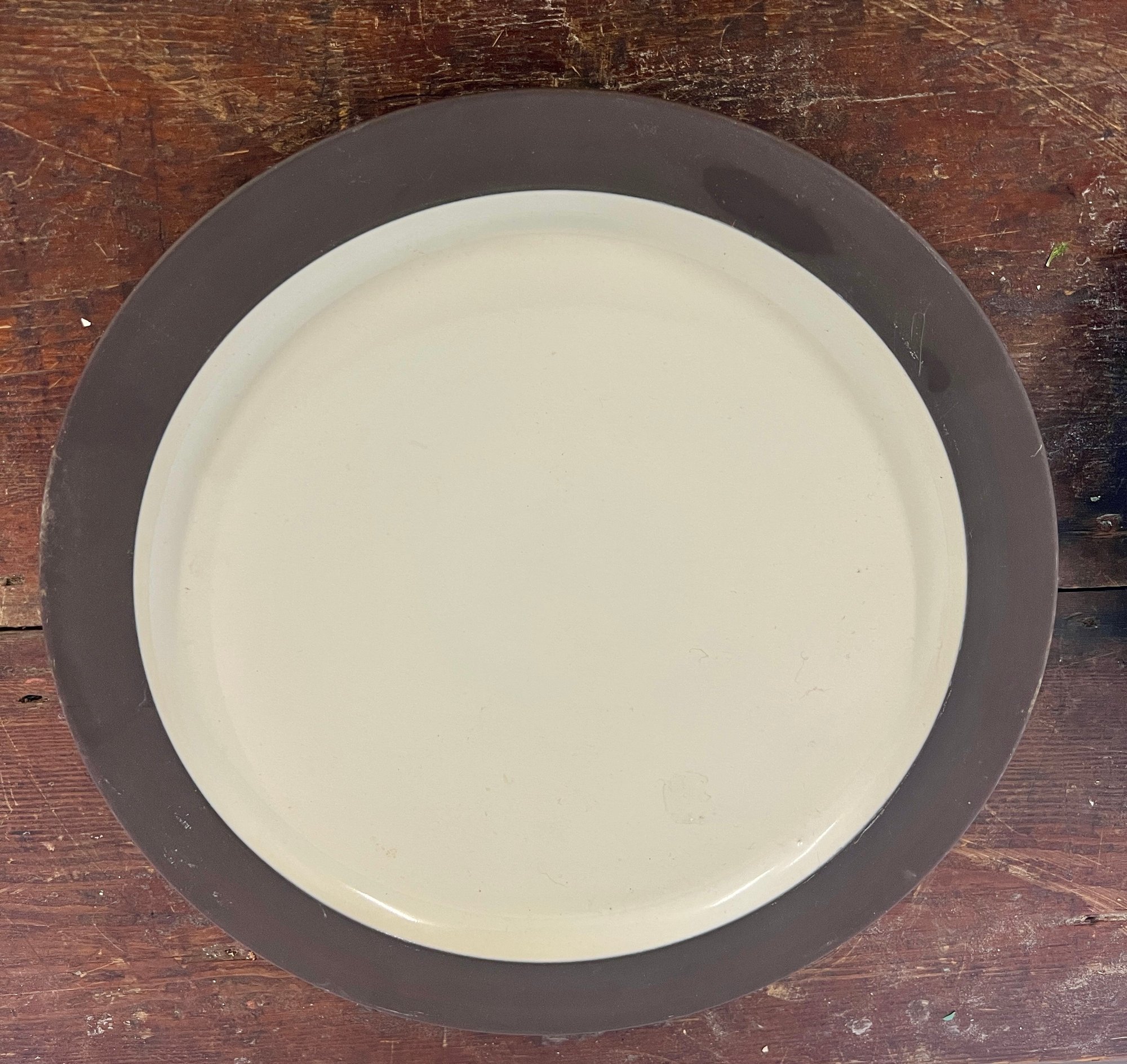 Pair of vintage Dansk Flamestone dinner plates. The matte chocolate brown exterior rim and the underside of the plate have noticeable scratches.