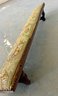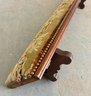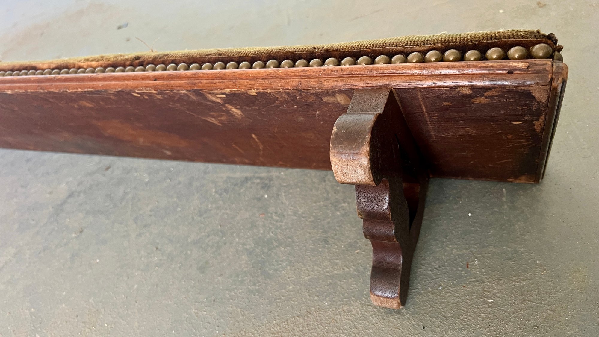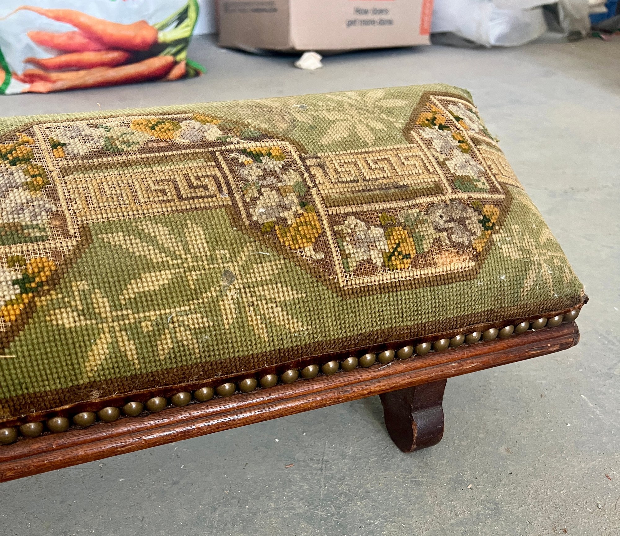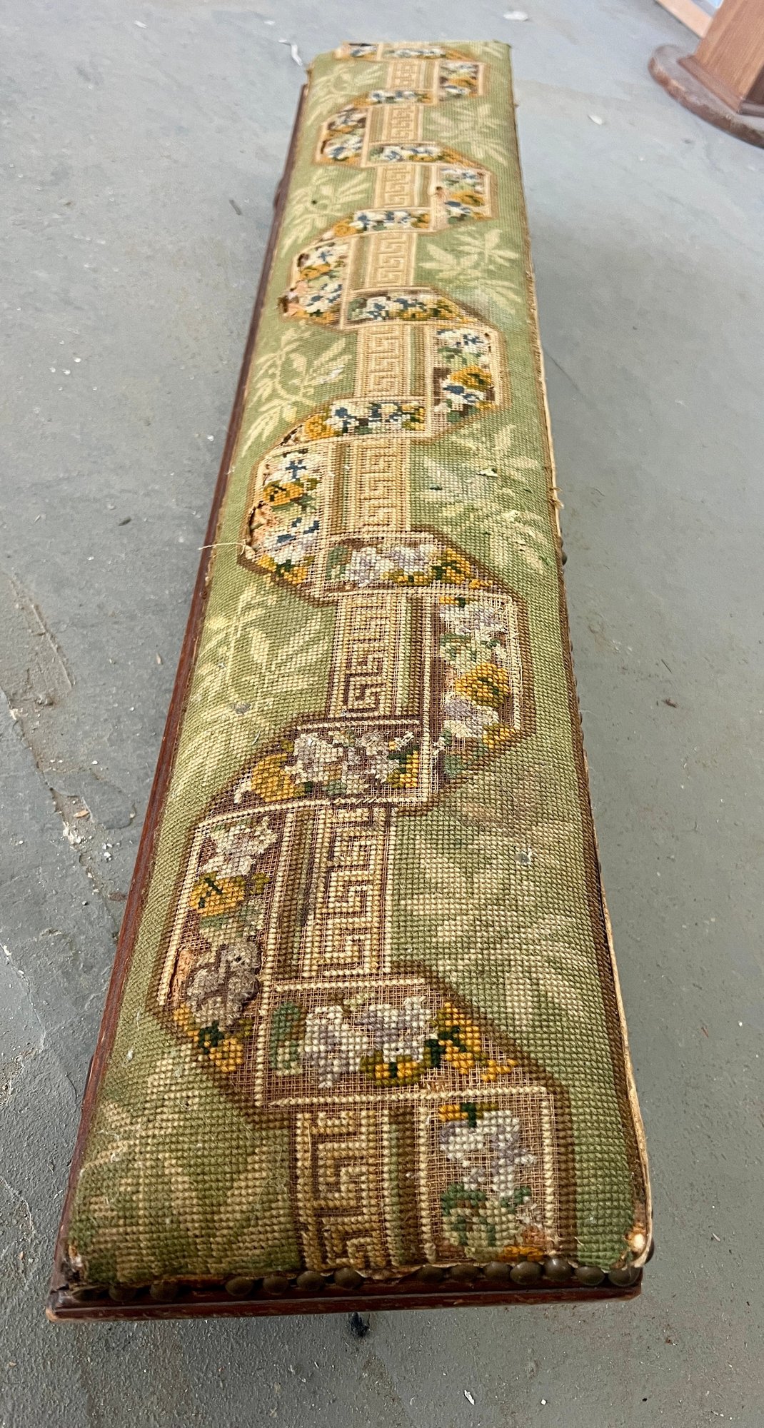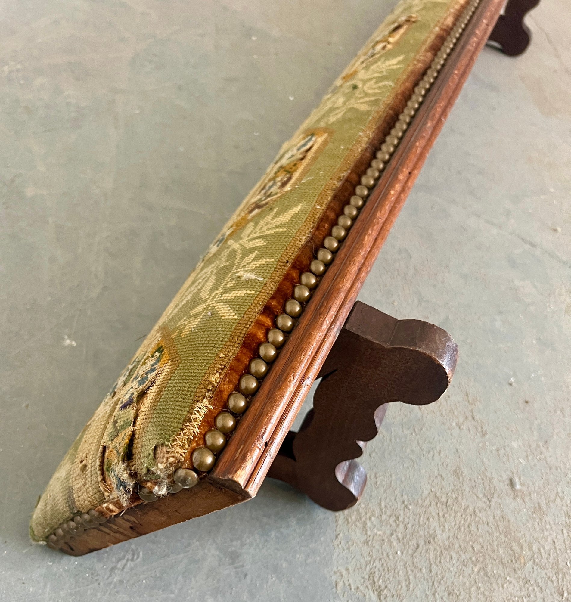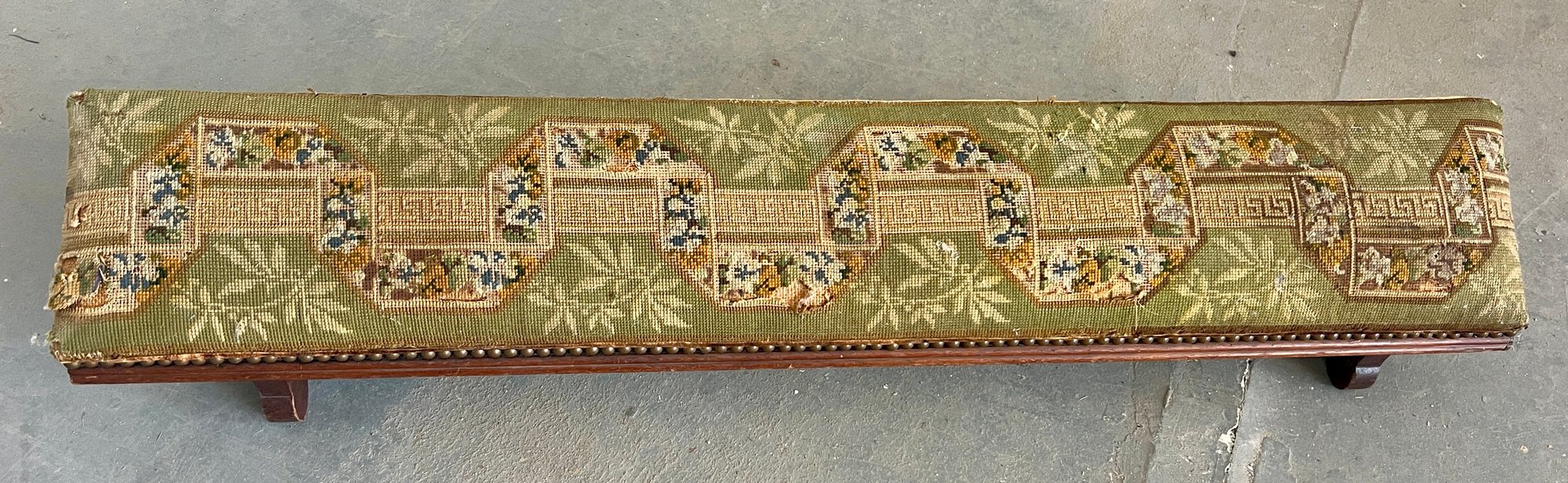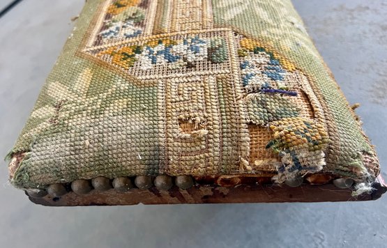 Antique church kneeler with embroidered upholstery, wooden base and brass tacks. There are holes noted in the upholstery.