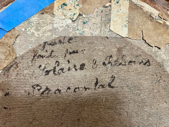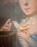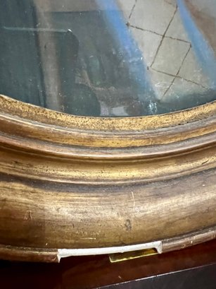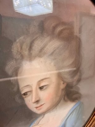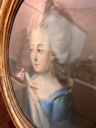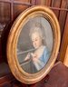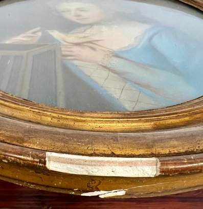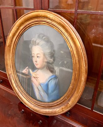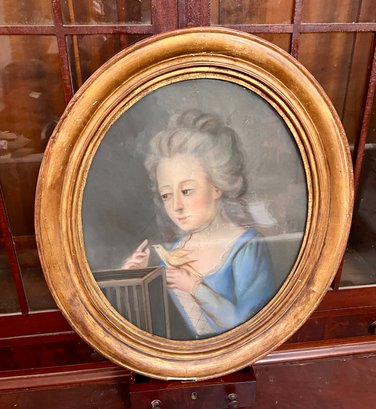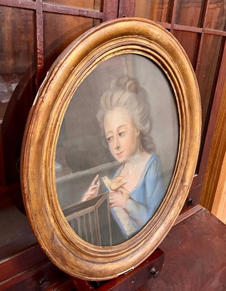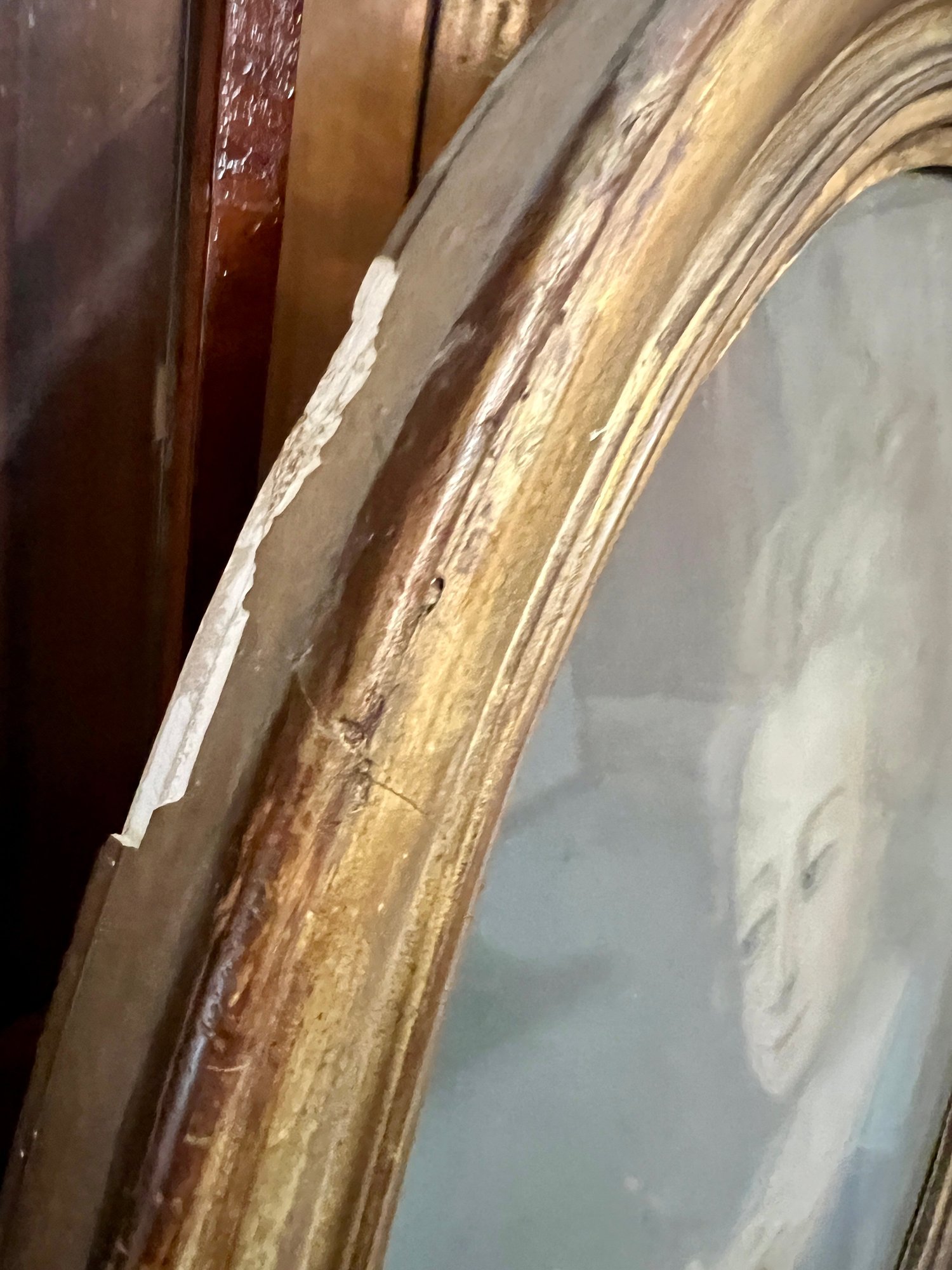 Antique French pastel drawing on paper in oval frame. Frame is chipped and worn.