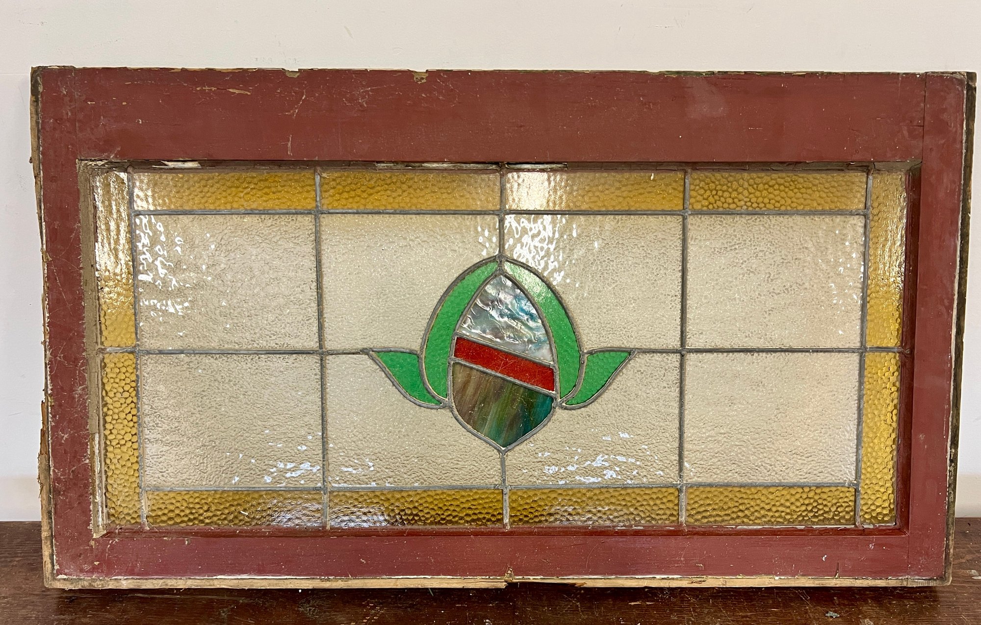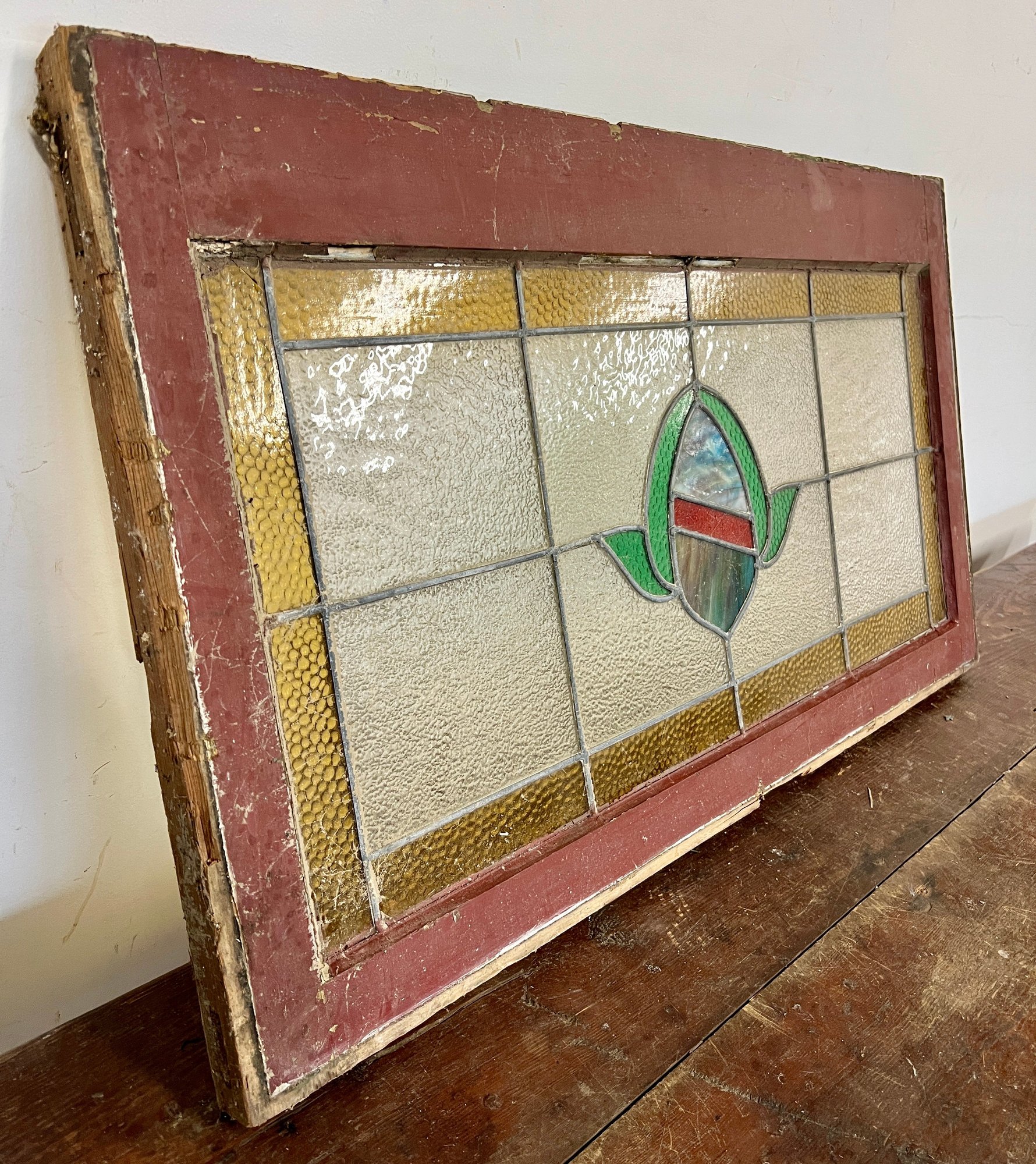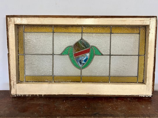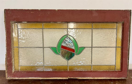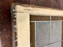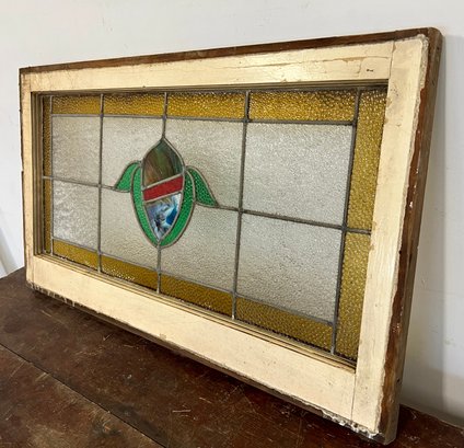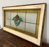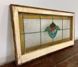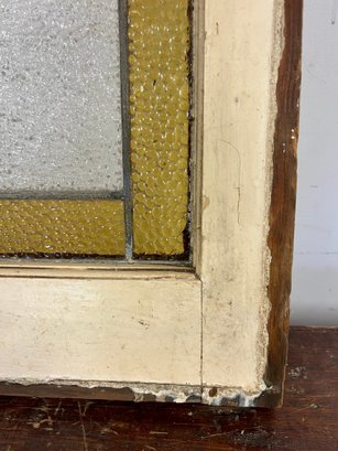 Antique stained glass window. Frame and painted finish are weather worn.