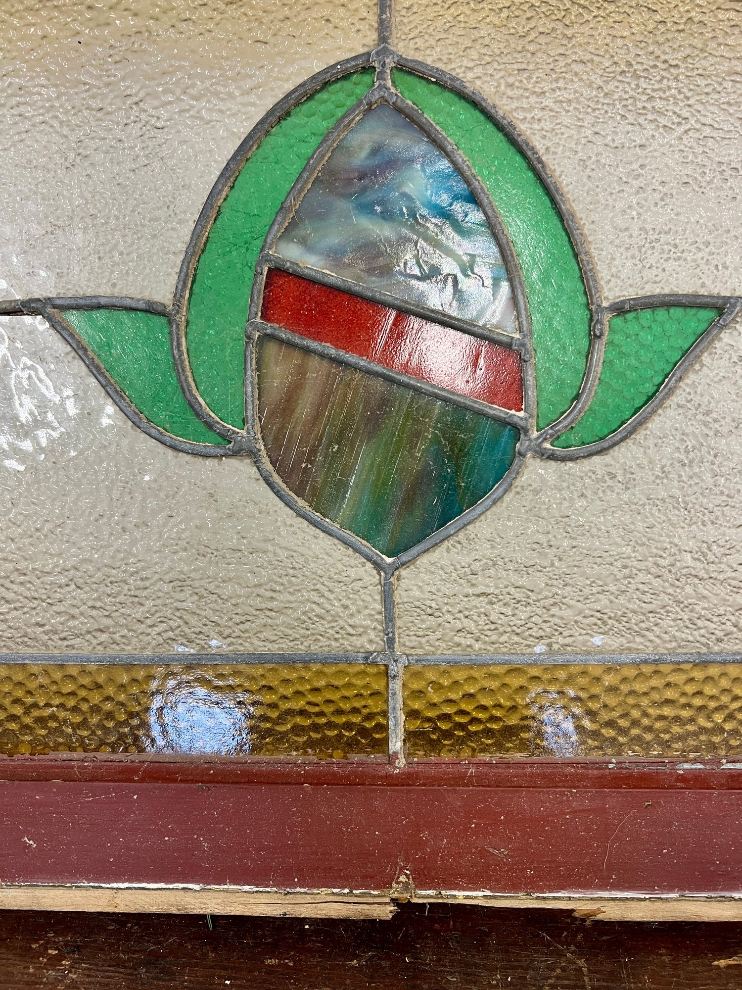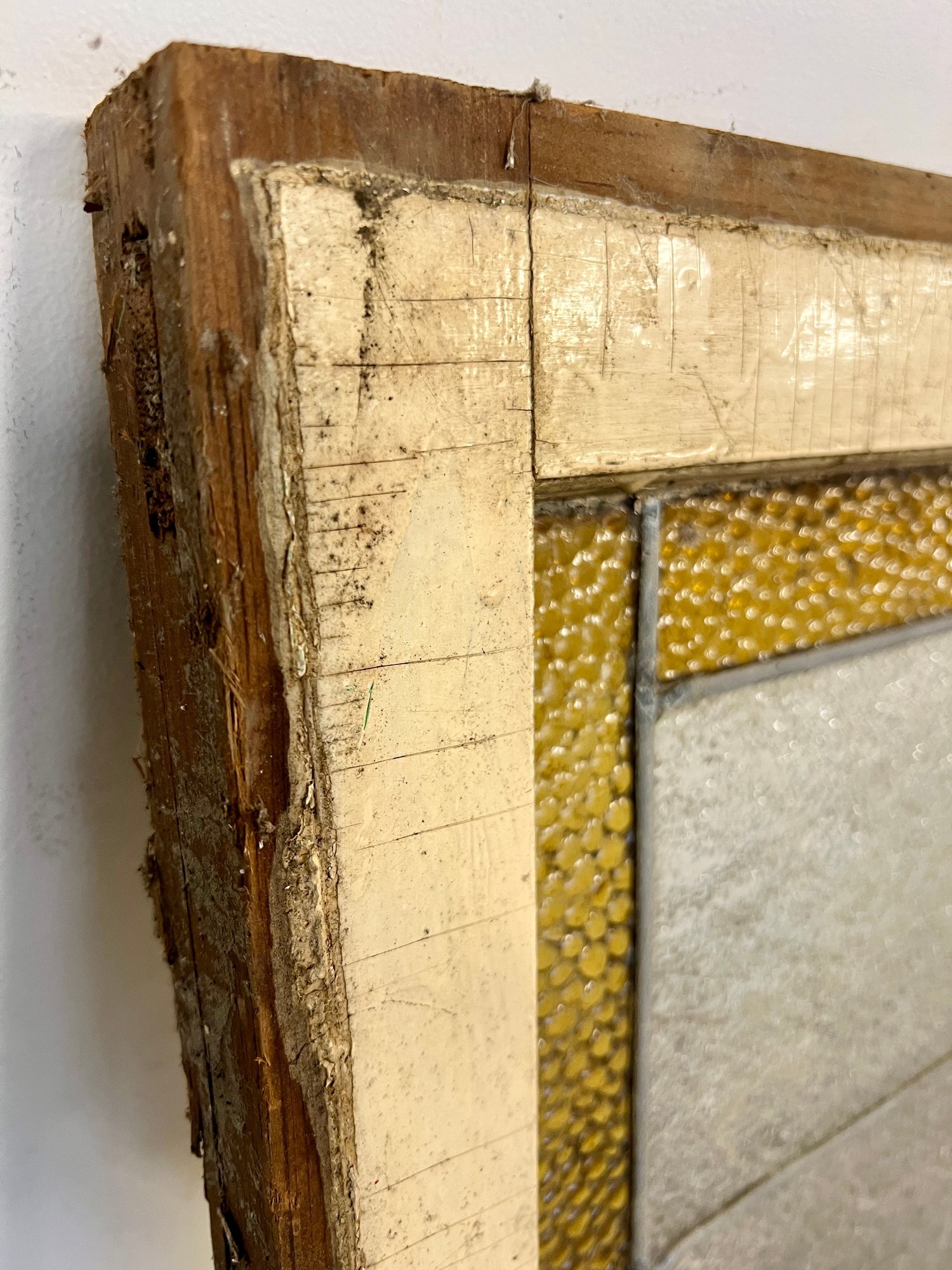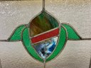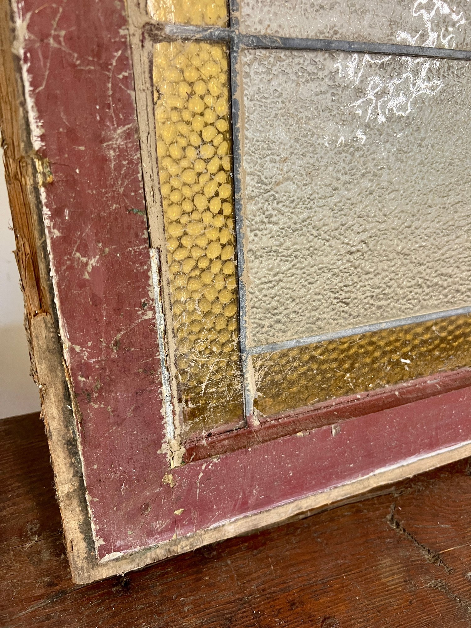 Antique stained glass window. Frame and painted finish are weather worn.