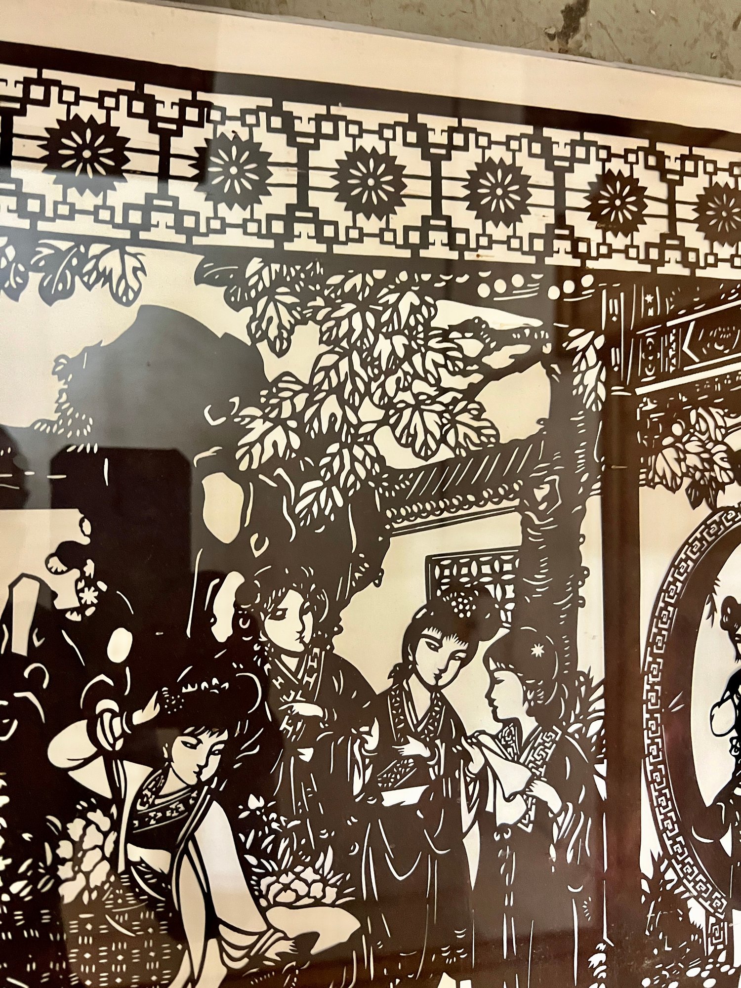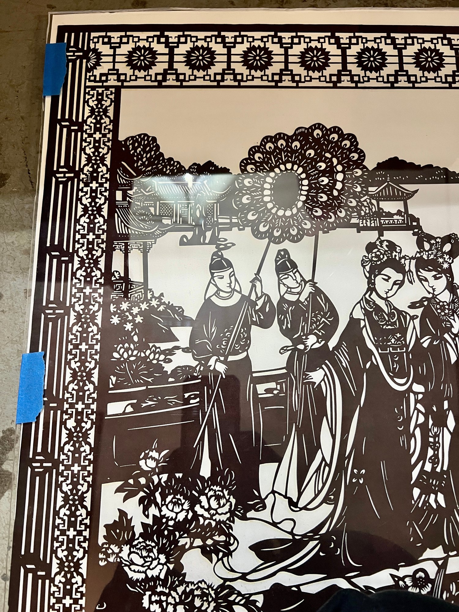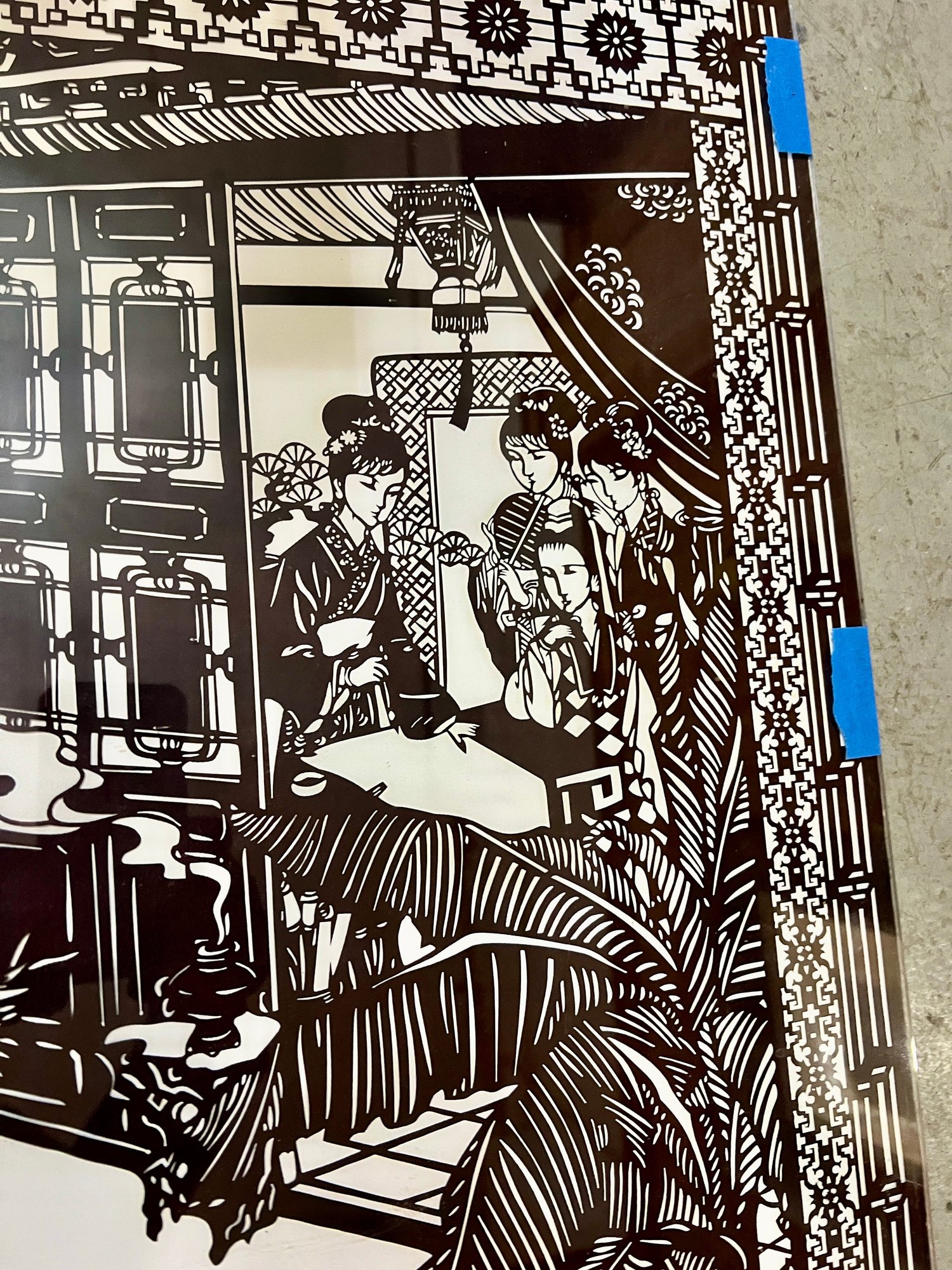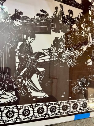 Chinese cut-paper artwork. The black paper is sandwiched between foam board and plexiglass