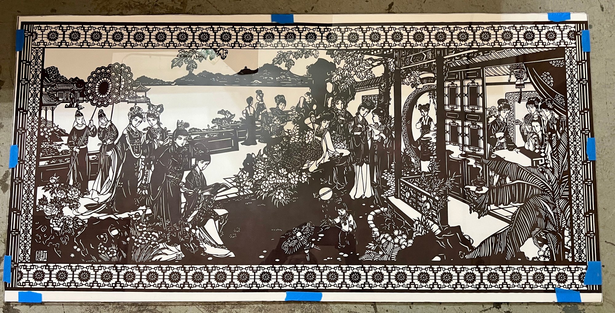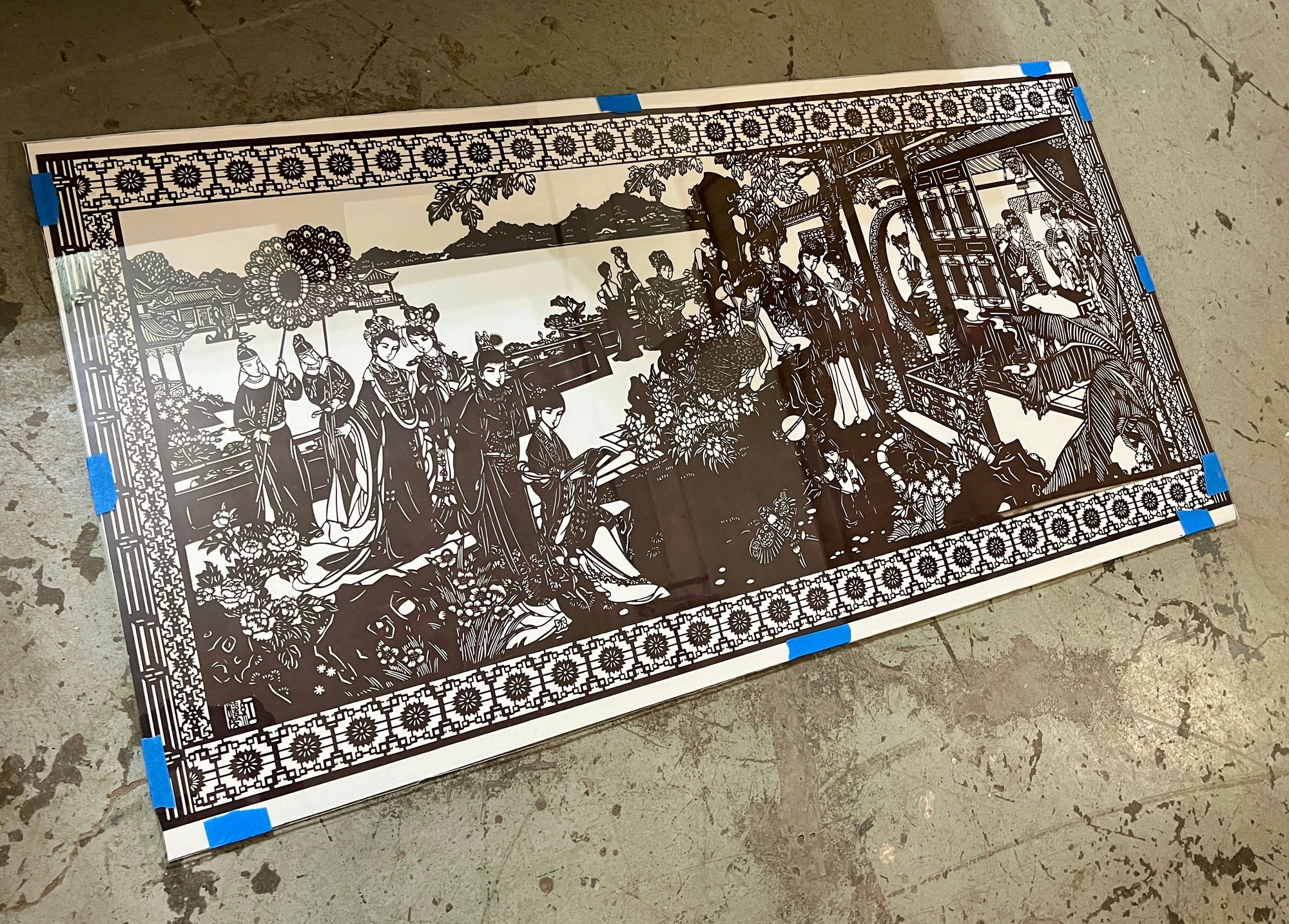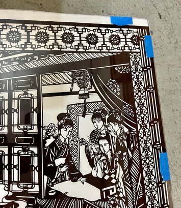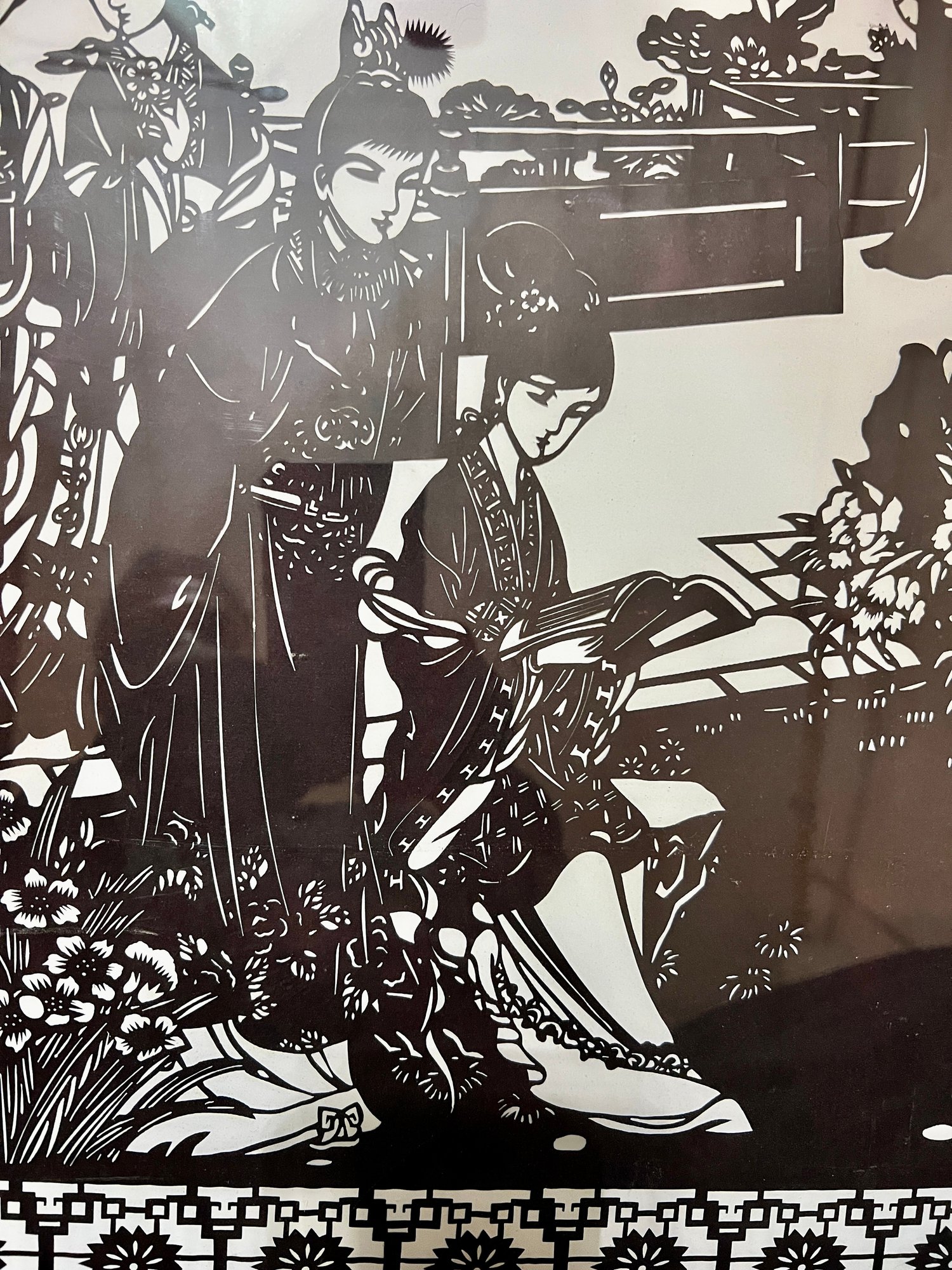 Chinese cut-paper artwork. The black paper is sandwiched between foam board and plexiglass