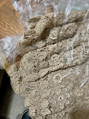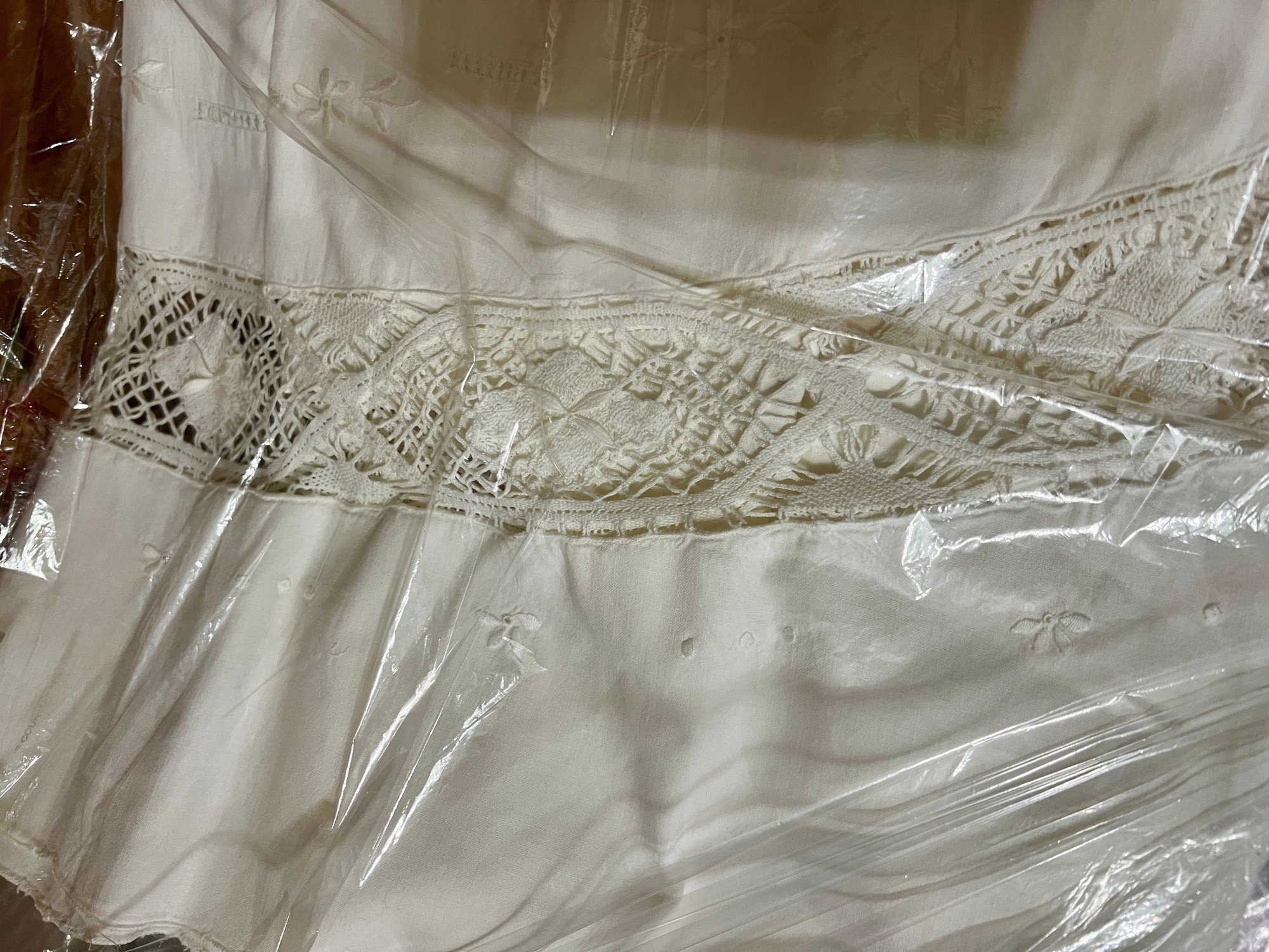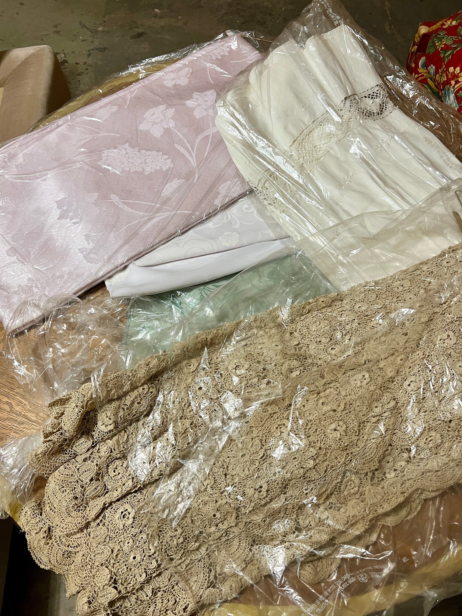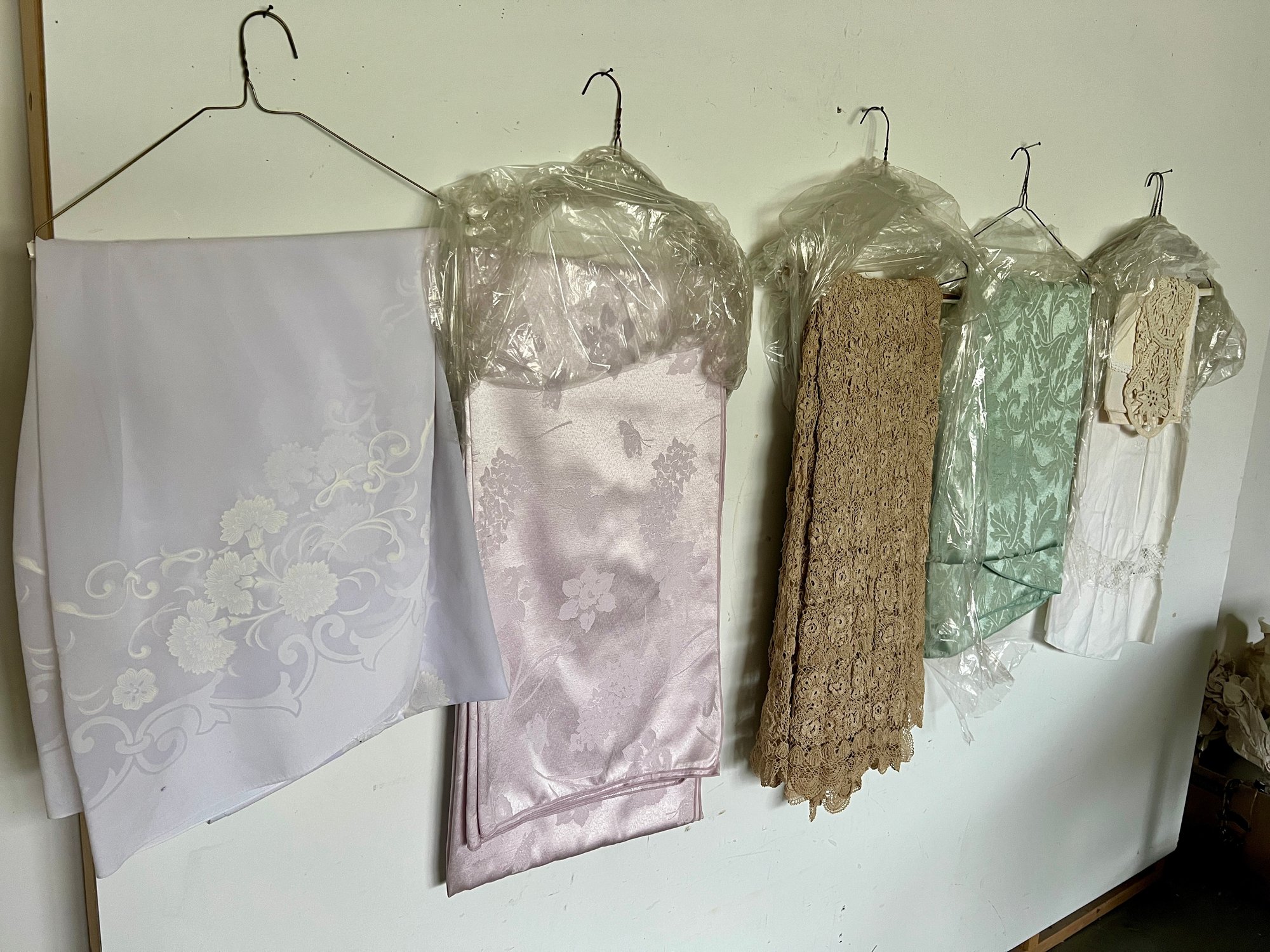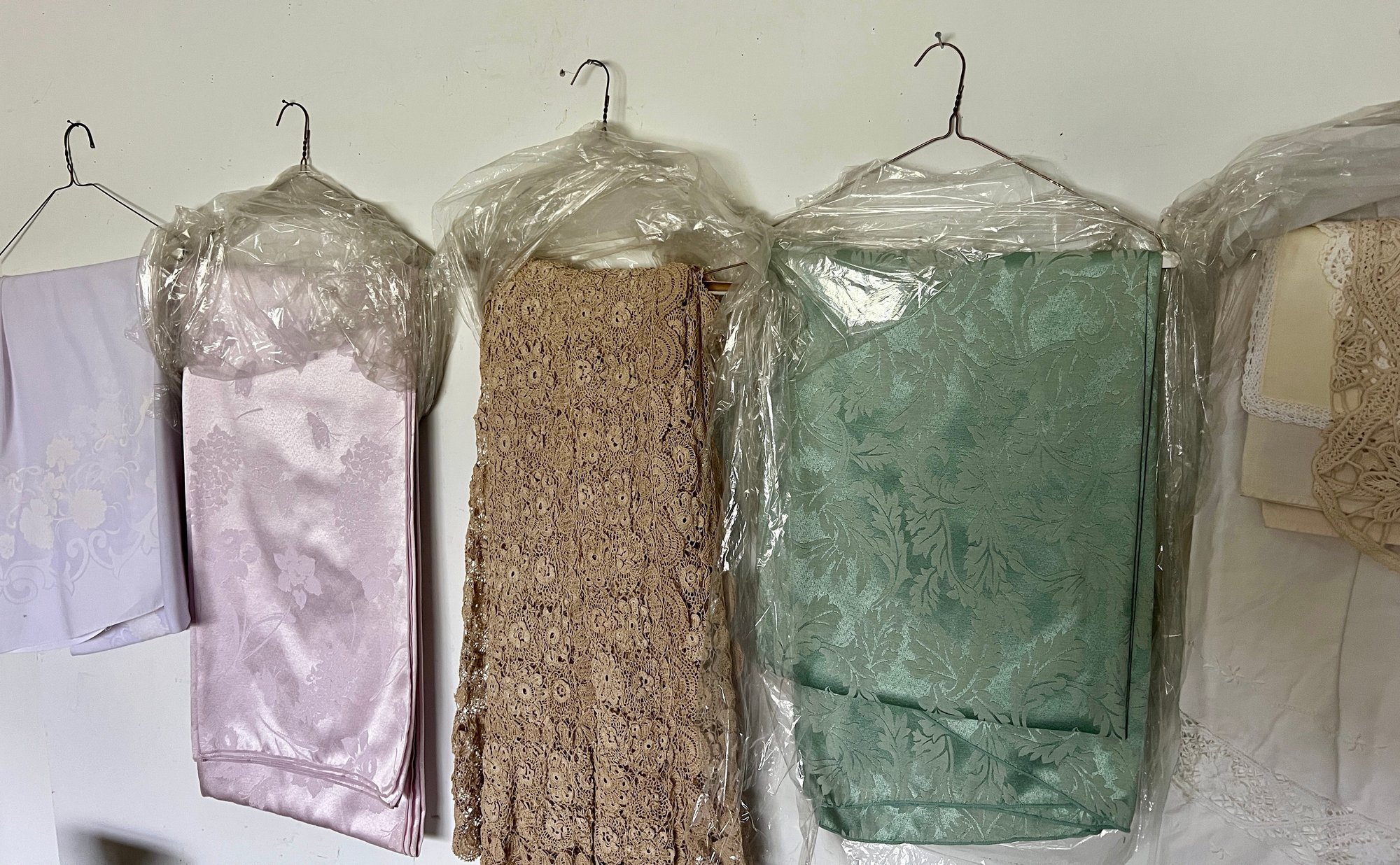 Collection of tablecloths and linens. Various fabrics including lace and damask. Exact shapes and dimensions are unknown. These were in sealed dry cleaning bags.