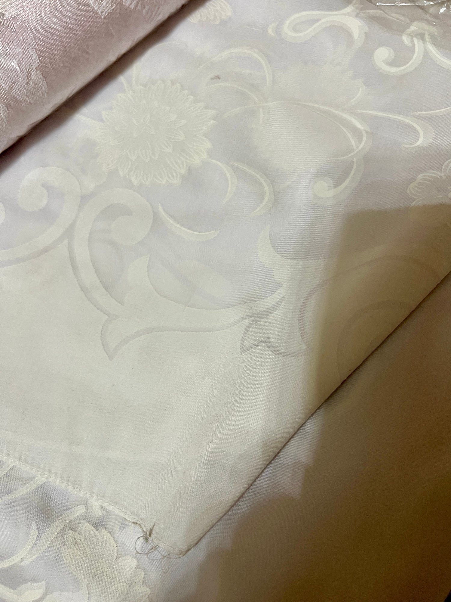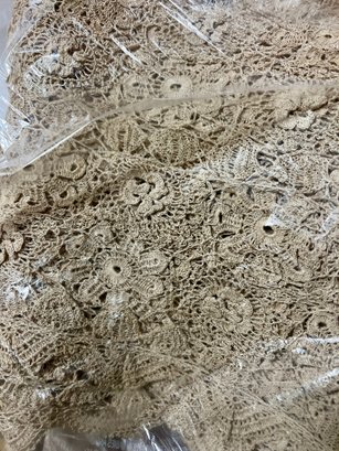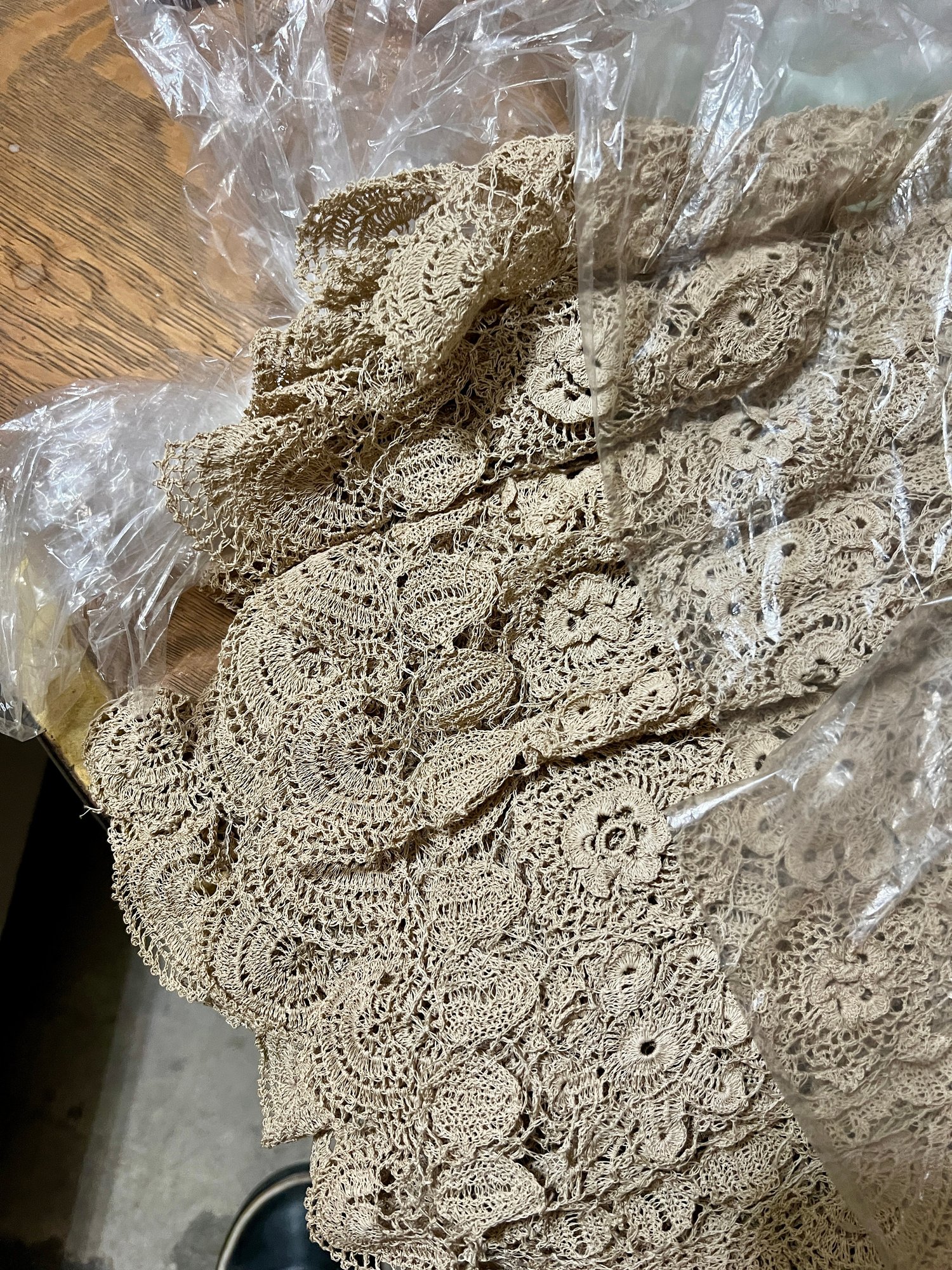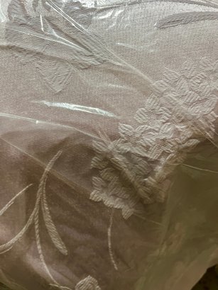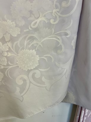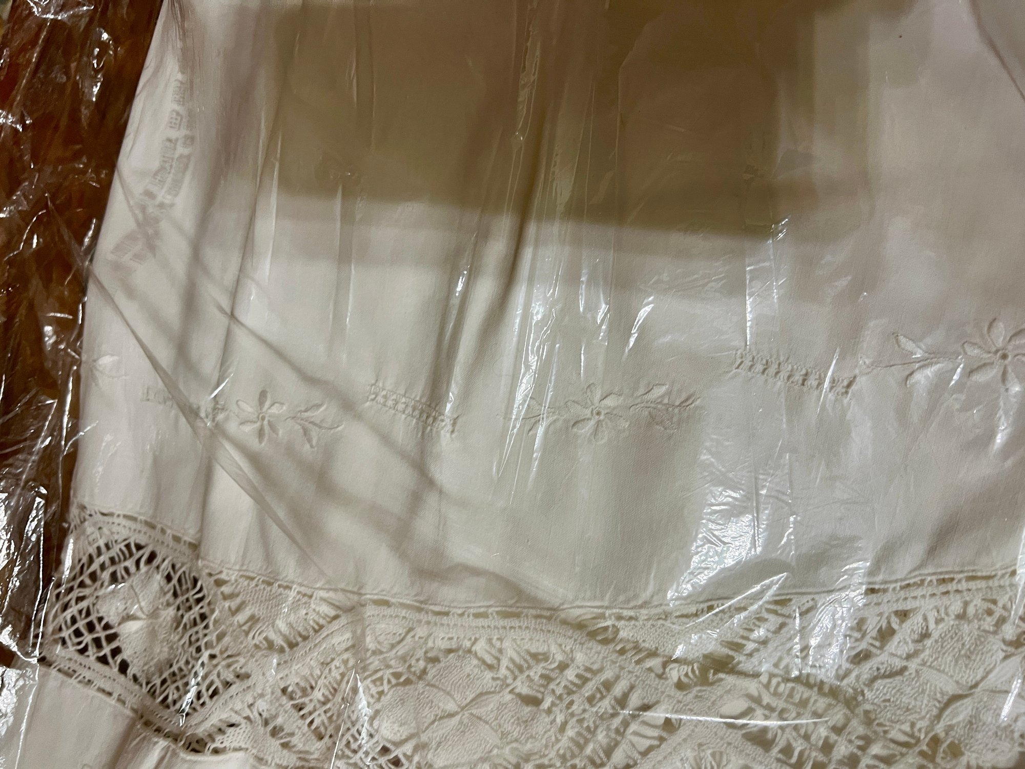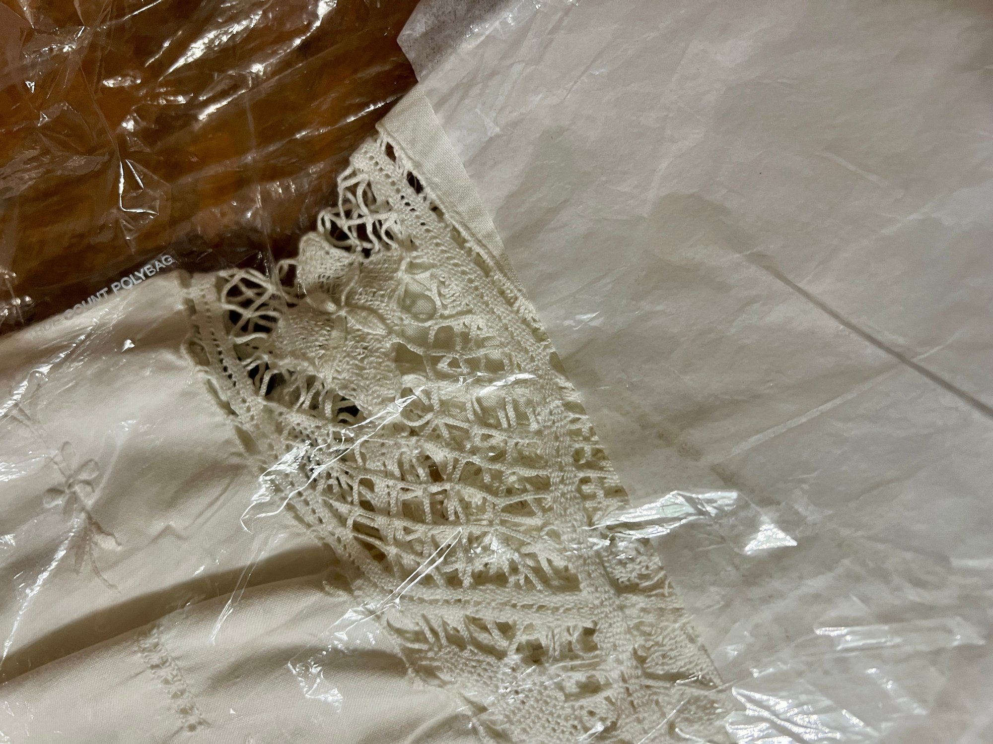 Collection of tablecloths and linens. Various fabrics including lace and damask. Exact shapes and dimensions are unknown. These were in sealed dry cleaning bags.