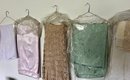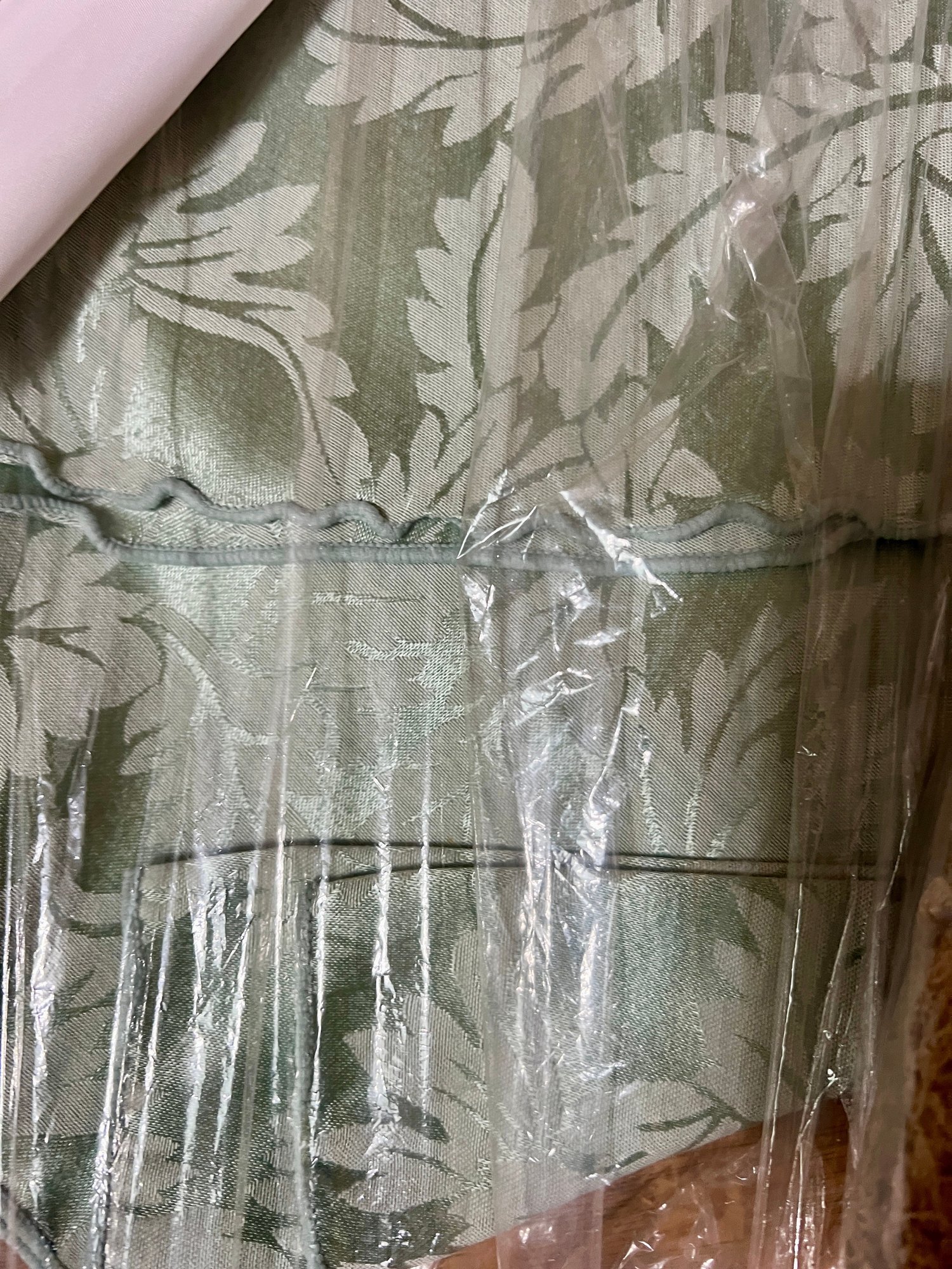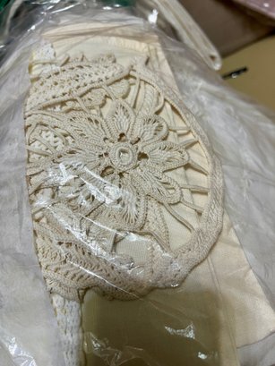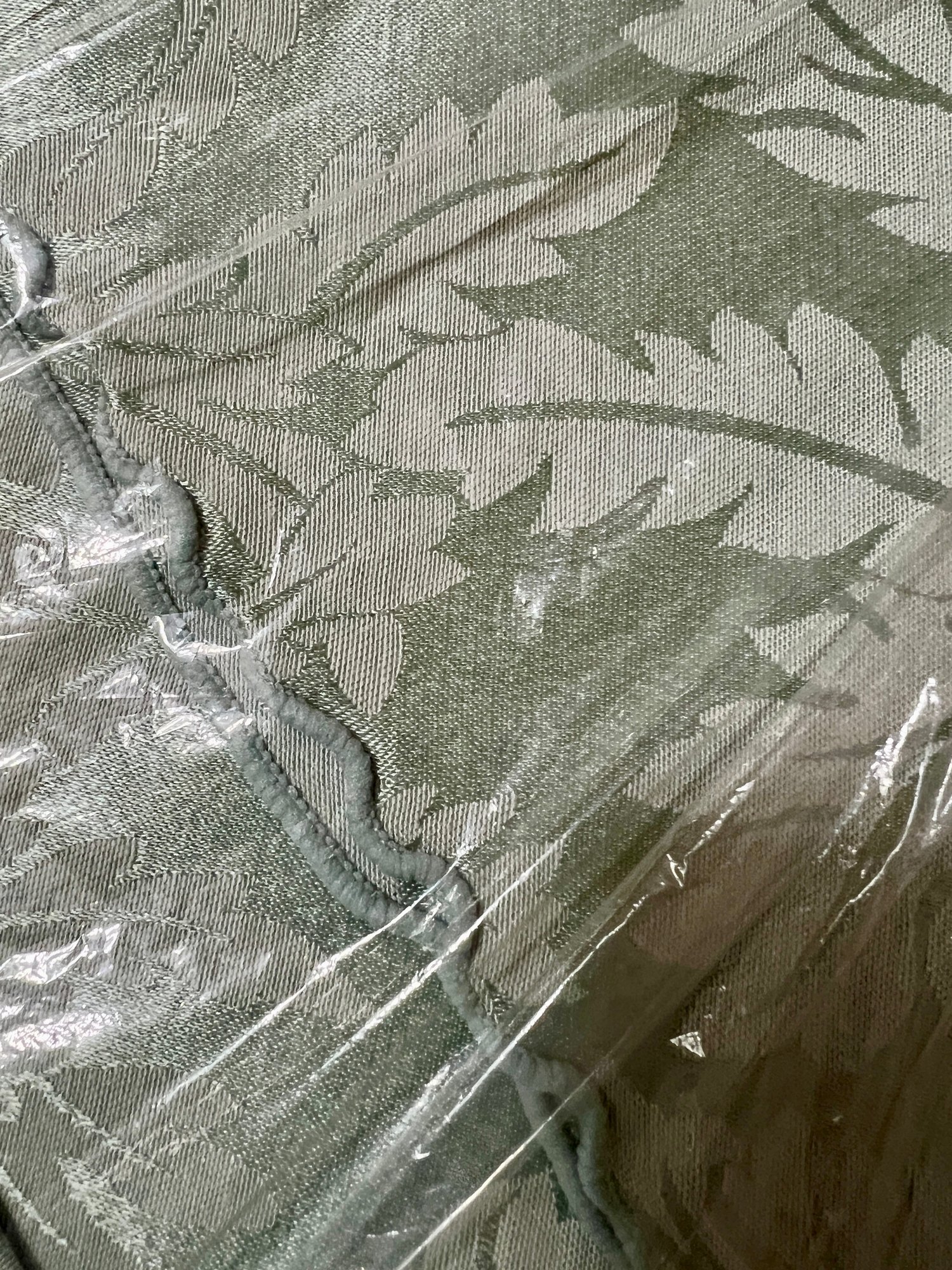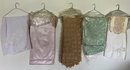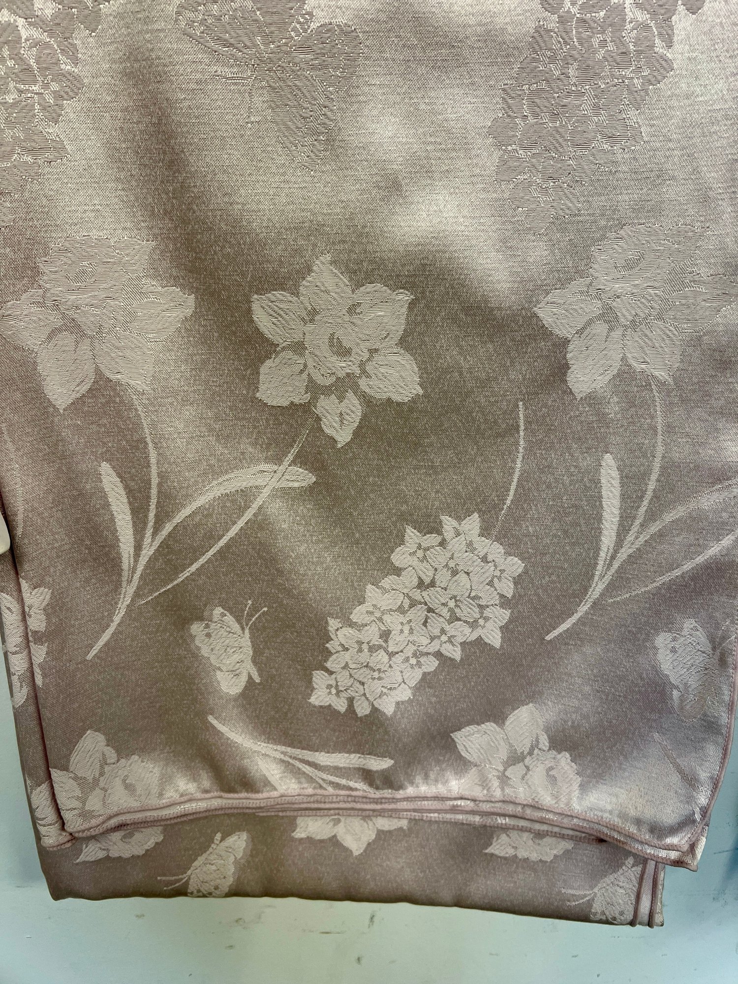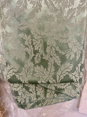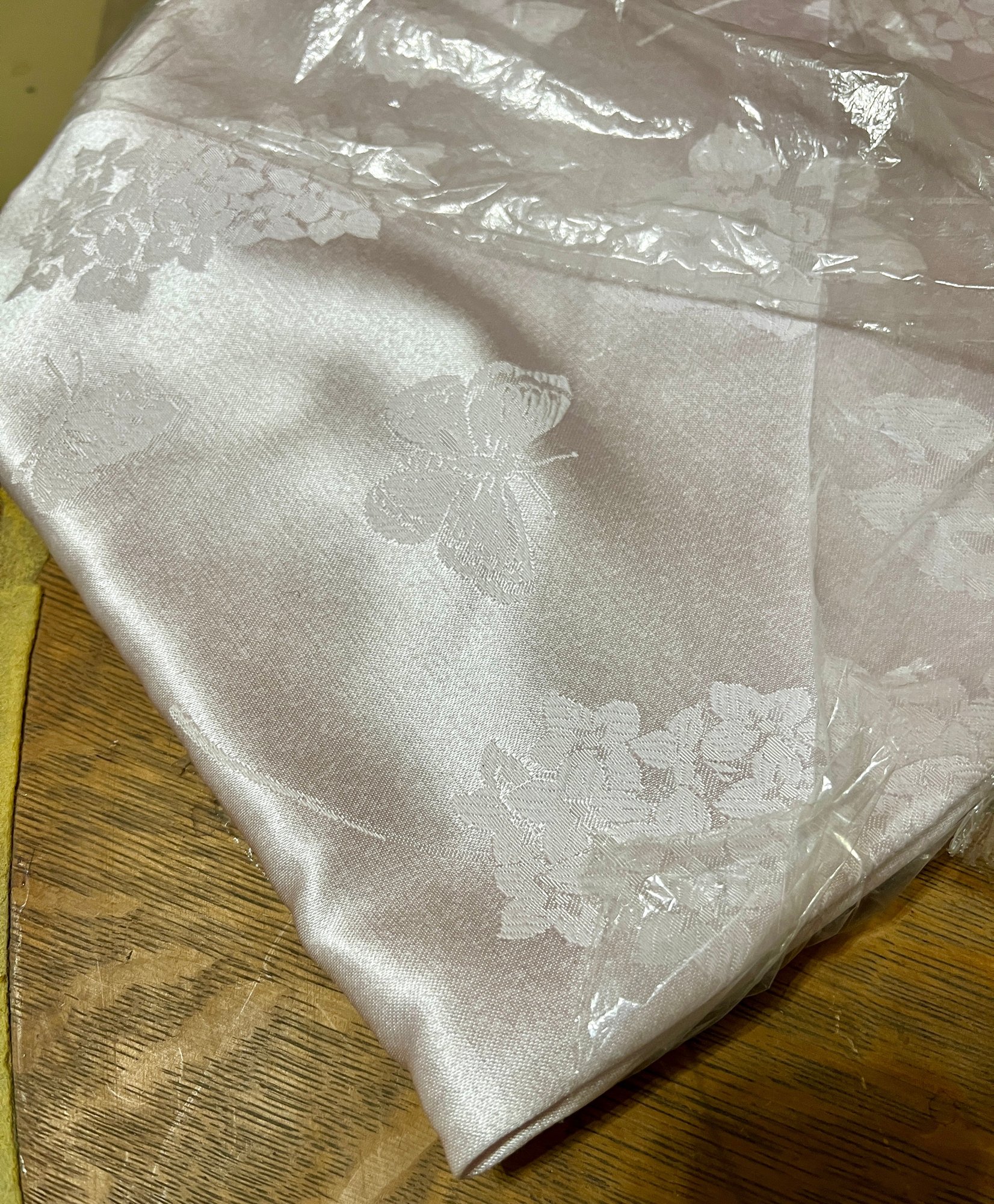 Collection of tablecloths and linens. Various fabrics including lace and damask. Exact shapes and dimensions are unknown. These were in sealed dry cleaning bags.