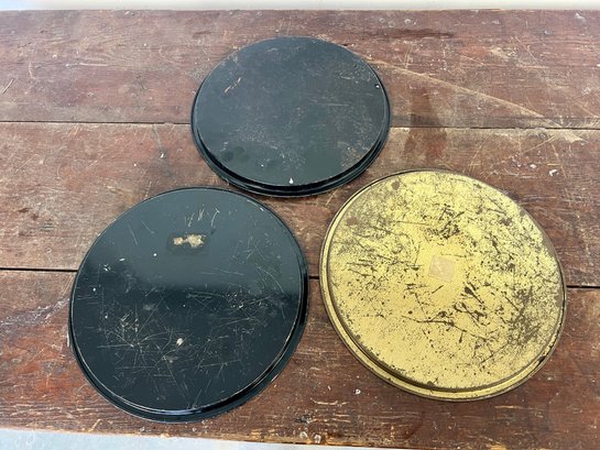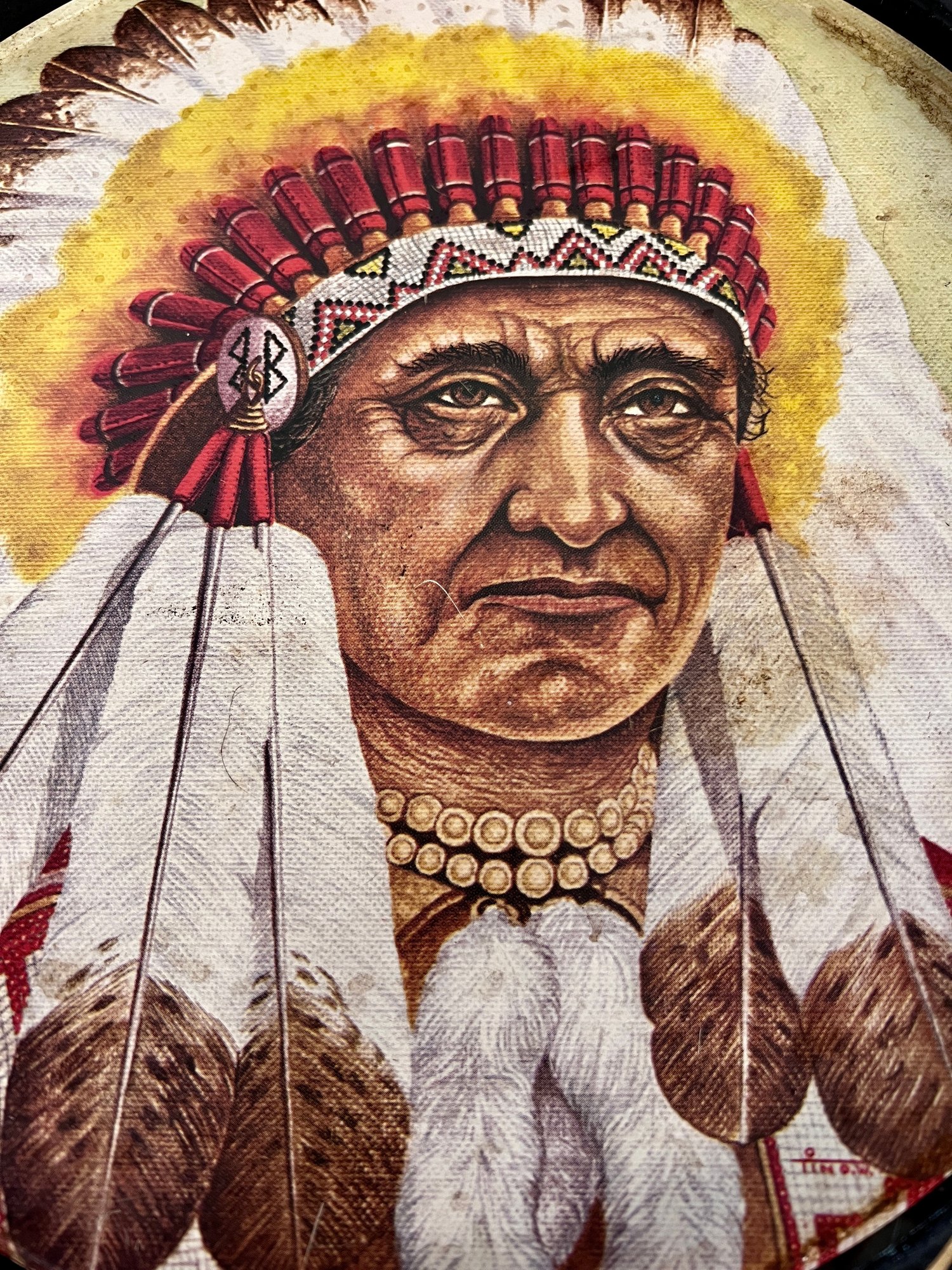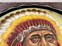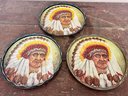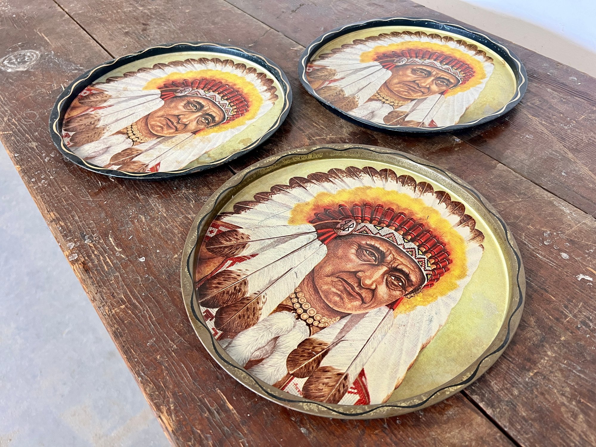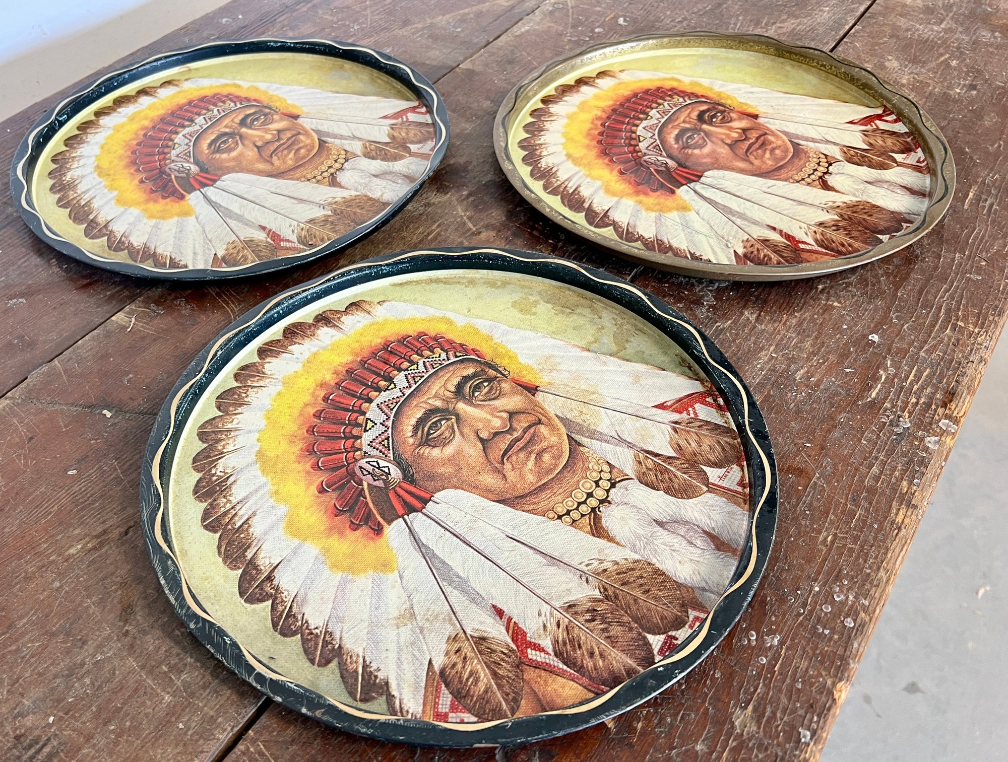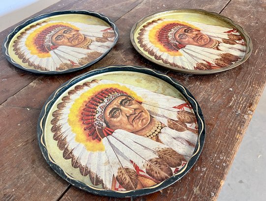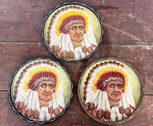 Collection of vintage metal serving trays with a Native American image.
