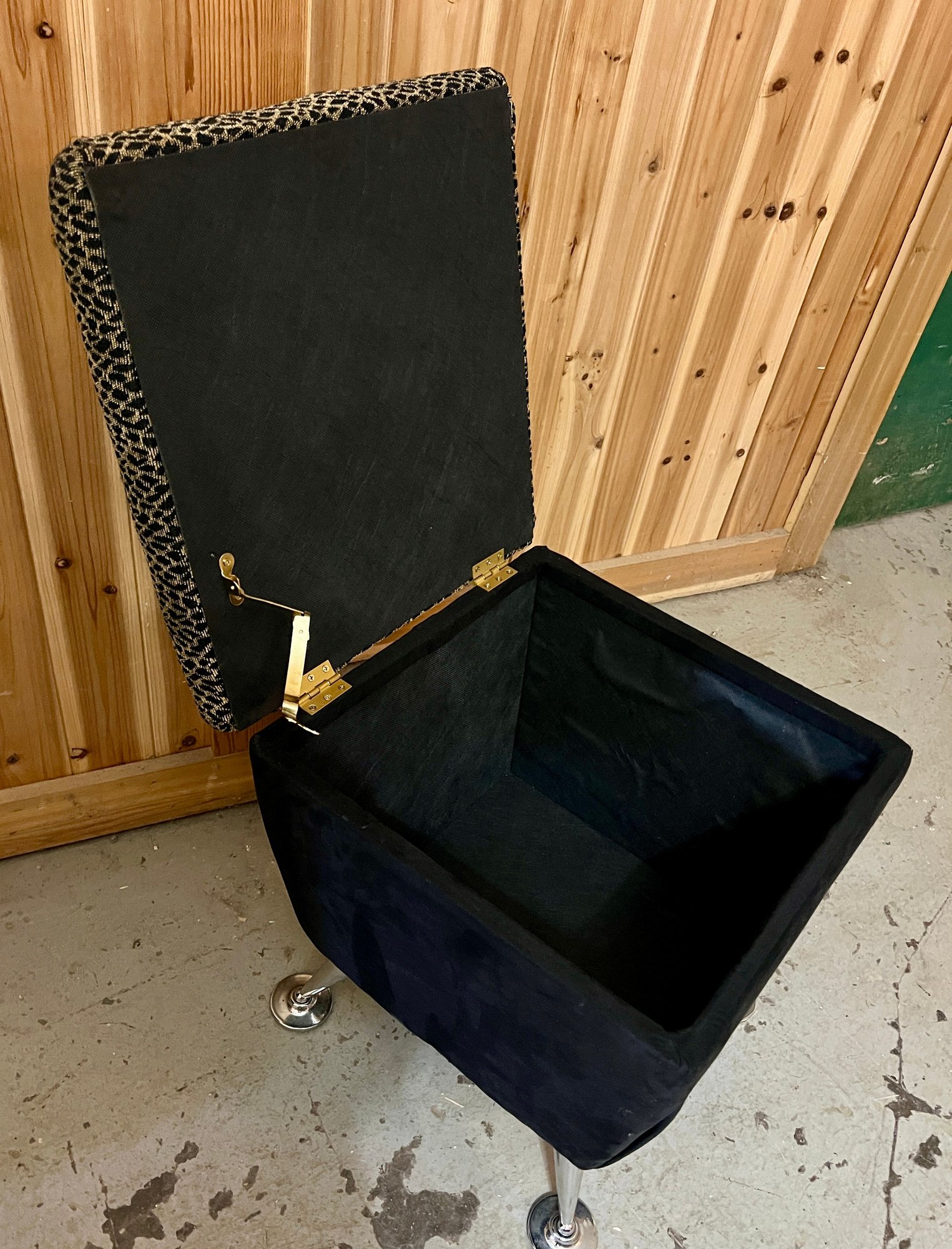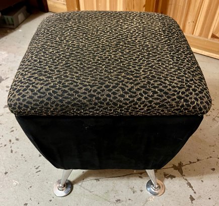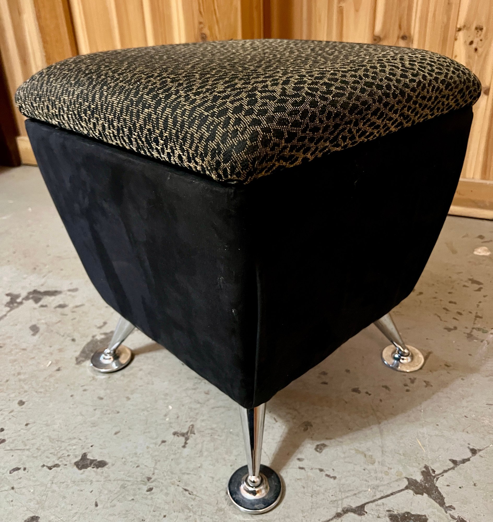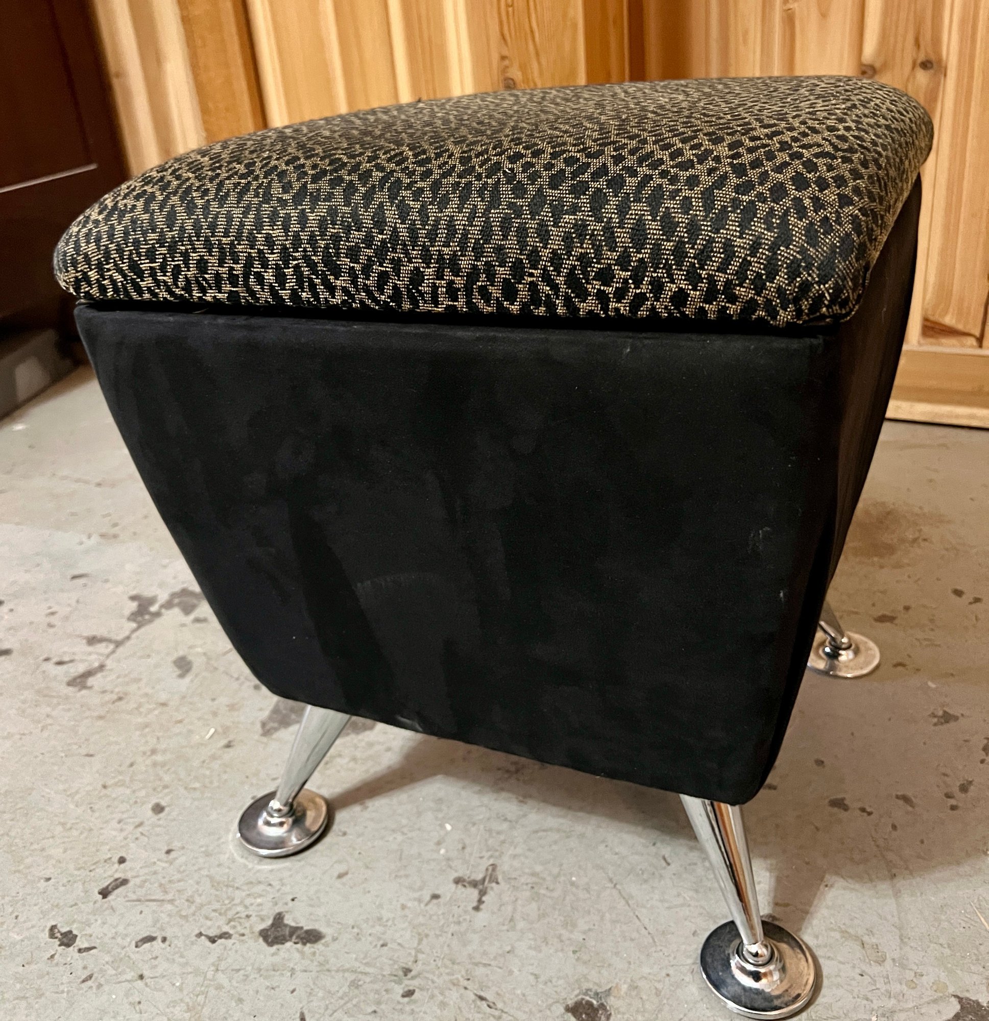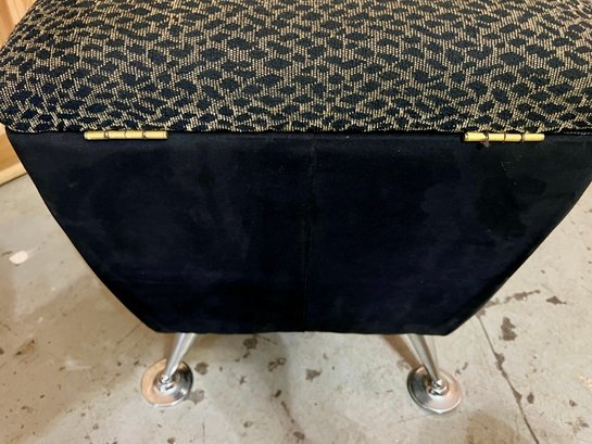 Storage ottoman with animal print upholstery and chrome legs. The hinge is bent and does not function correctly.