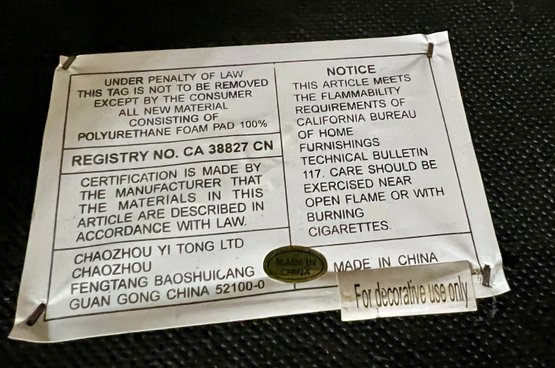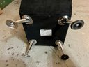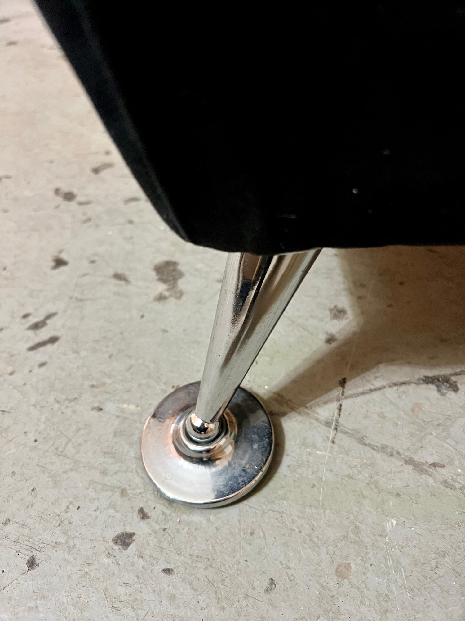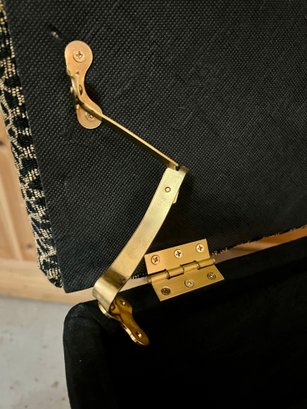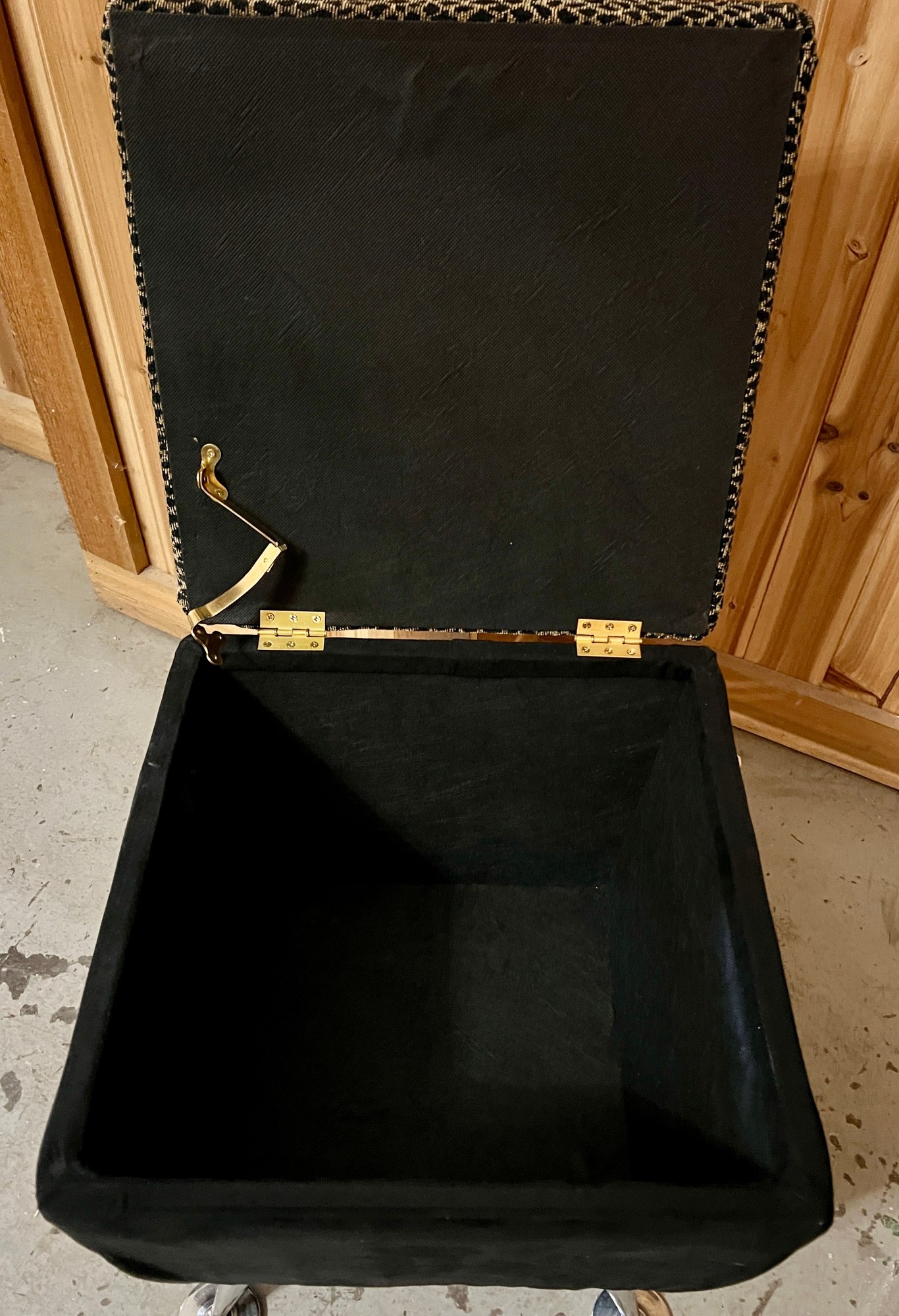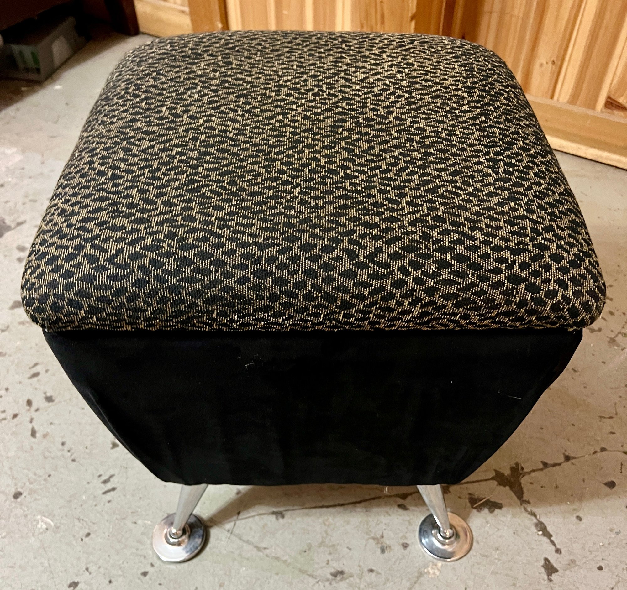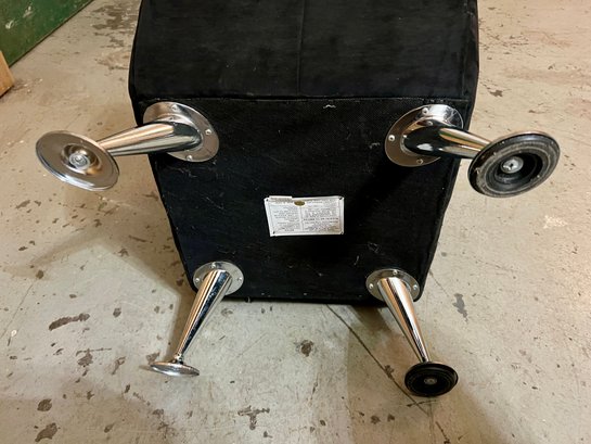 Storage ottoman with animal print upholstery and chrome legs. The hinge is bent and does not function correctly.