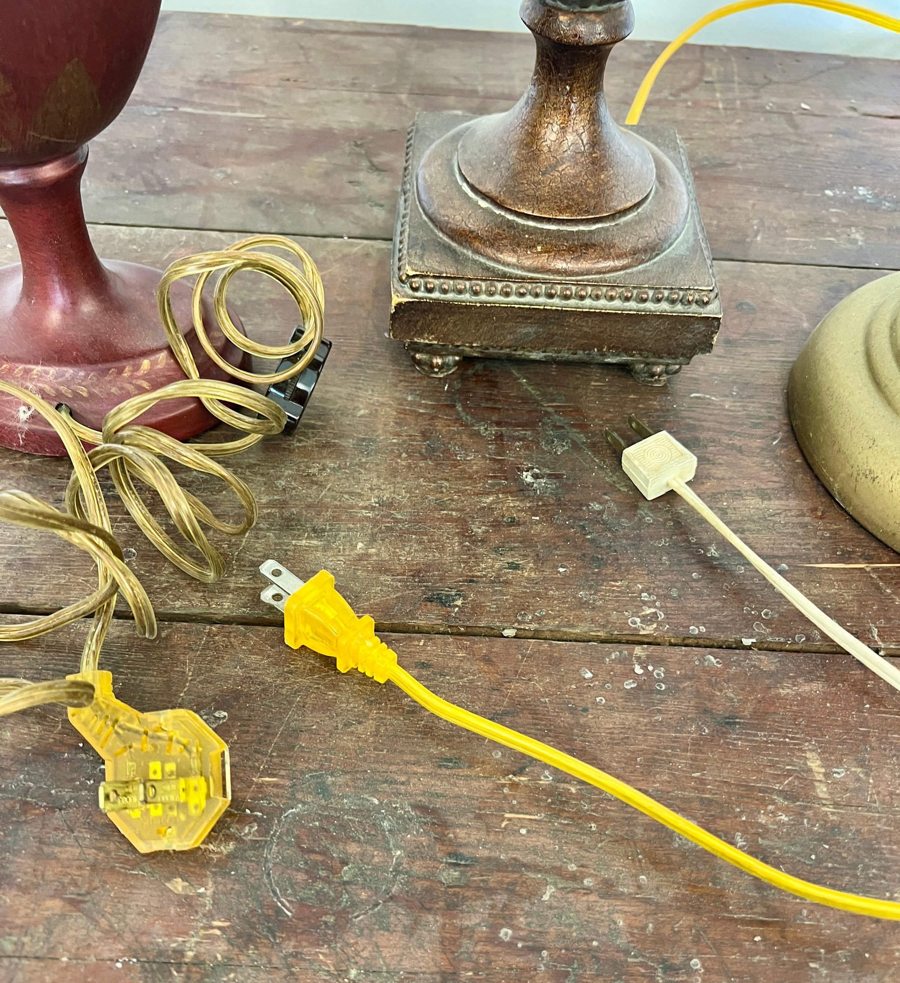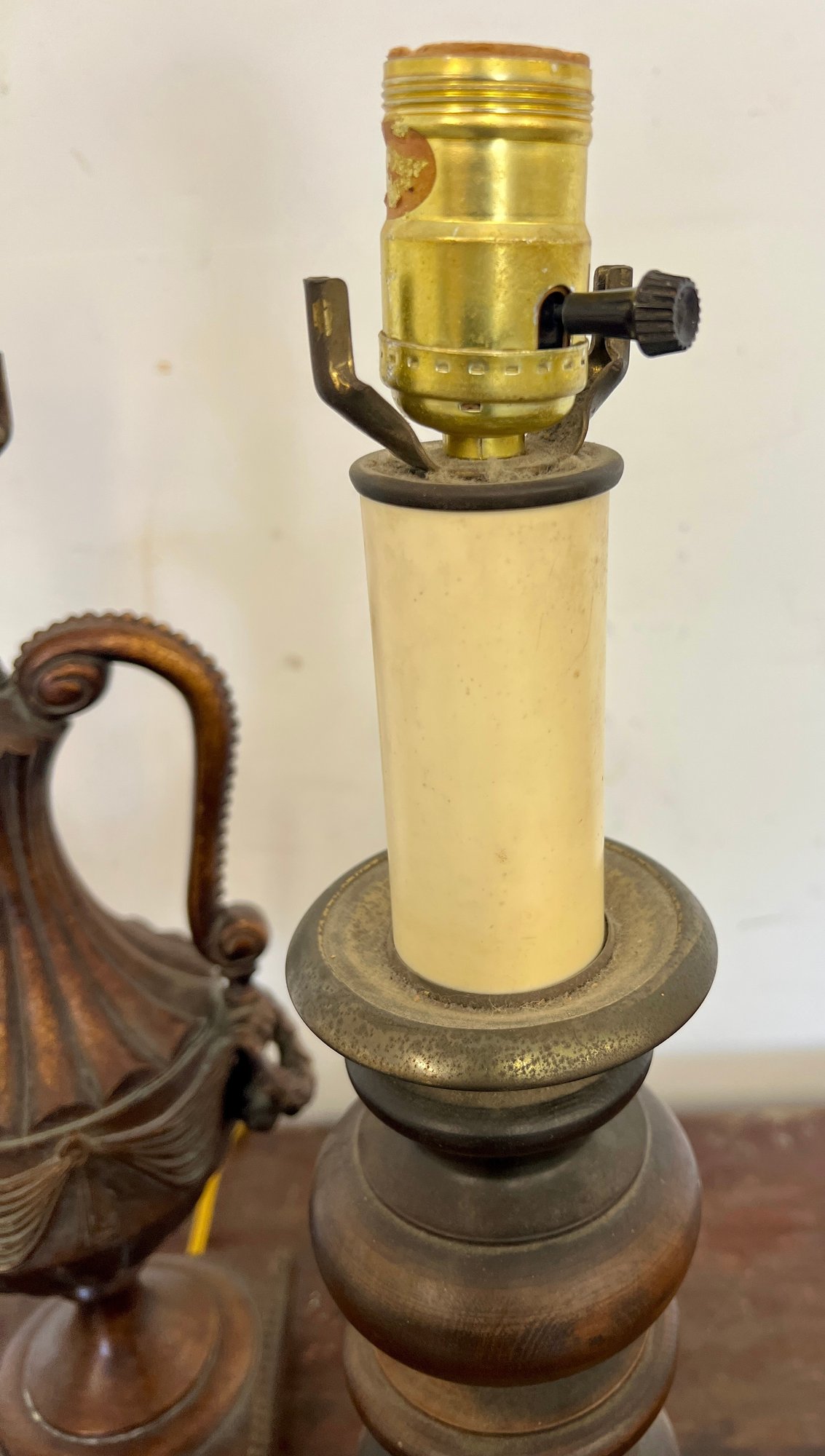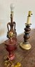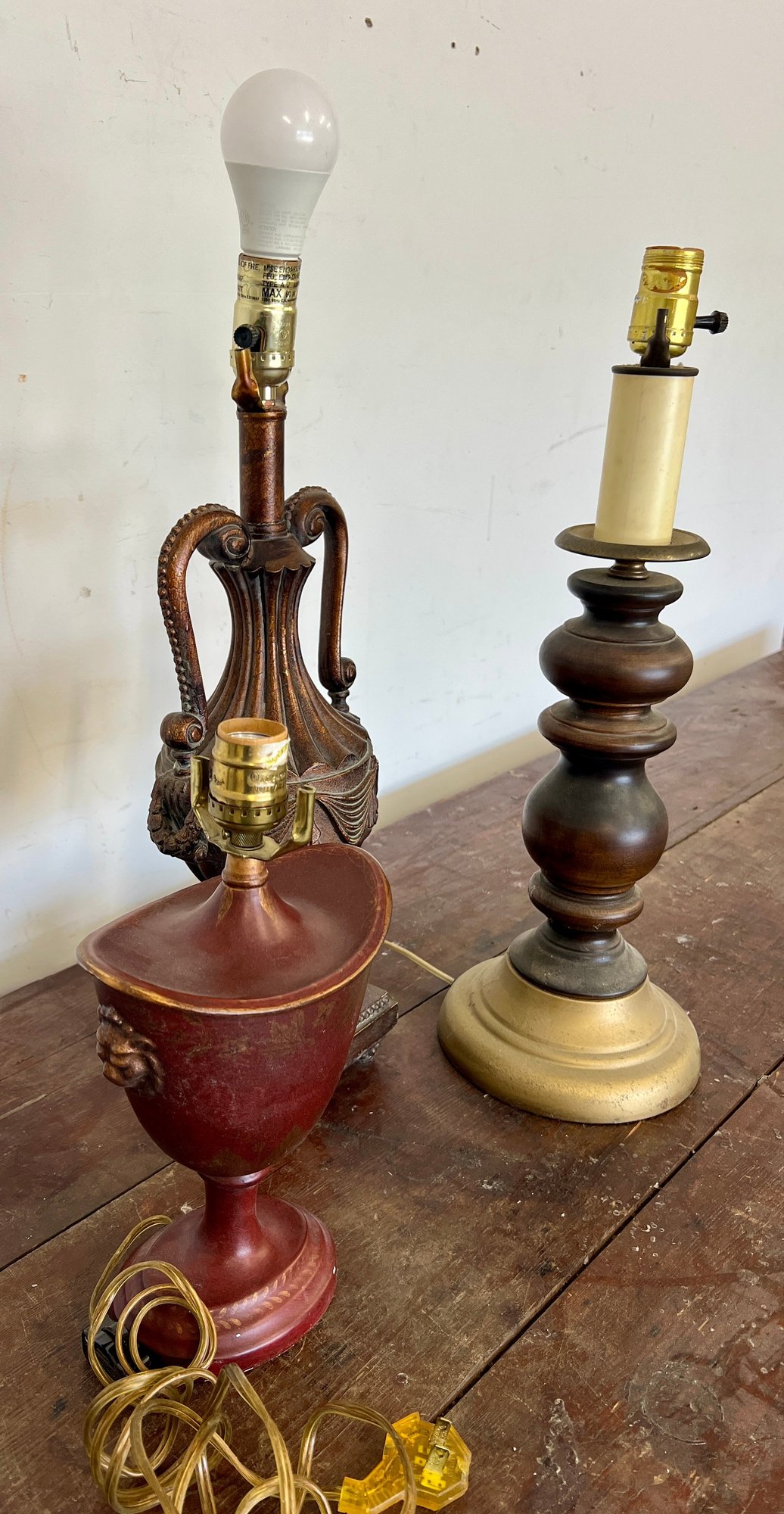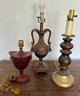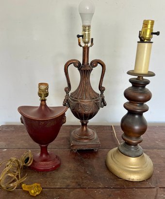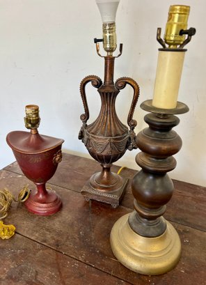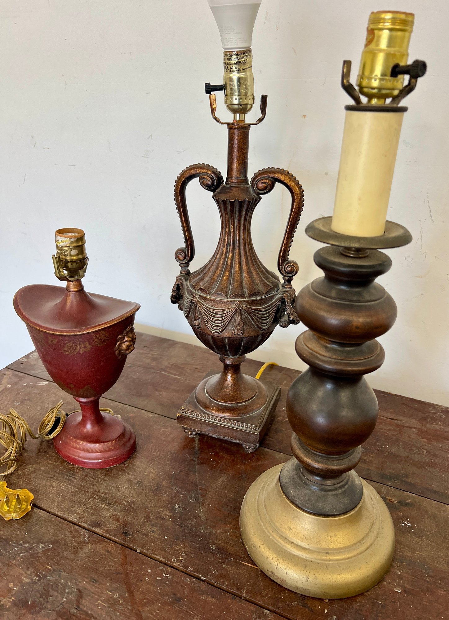 Three decorative tabletop lamps. Tallest lamp is 20"H. All harps are missing.