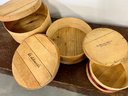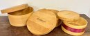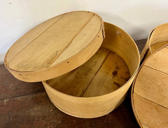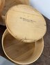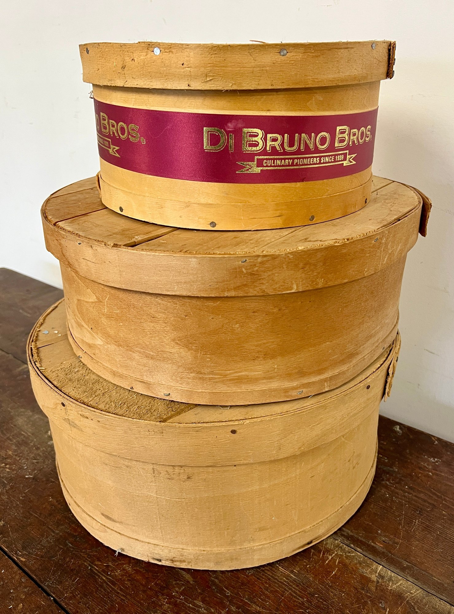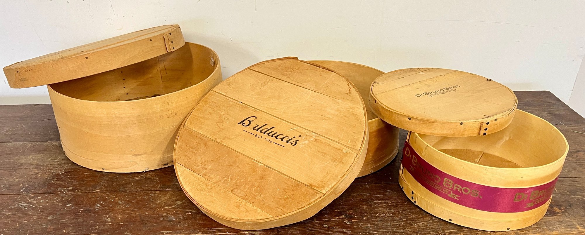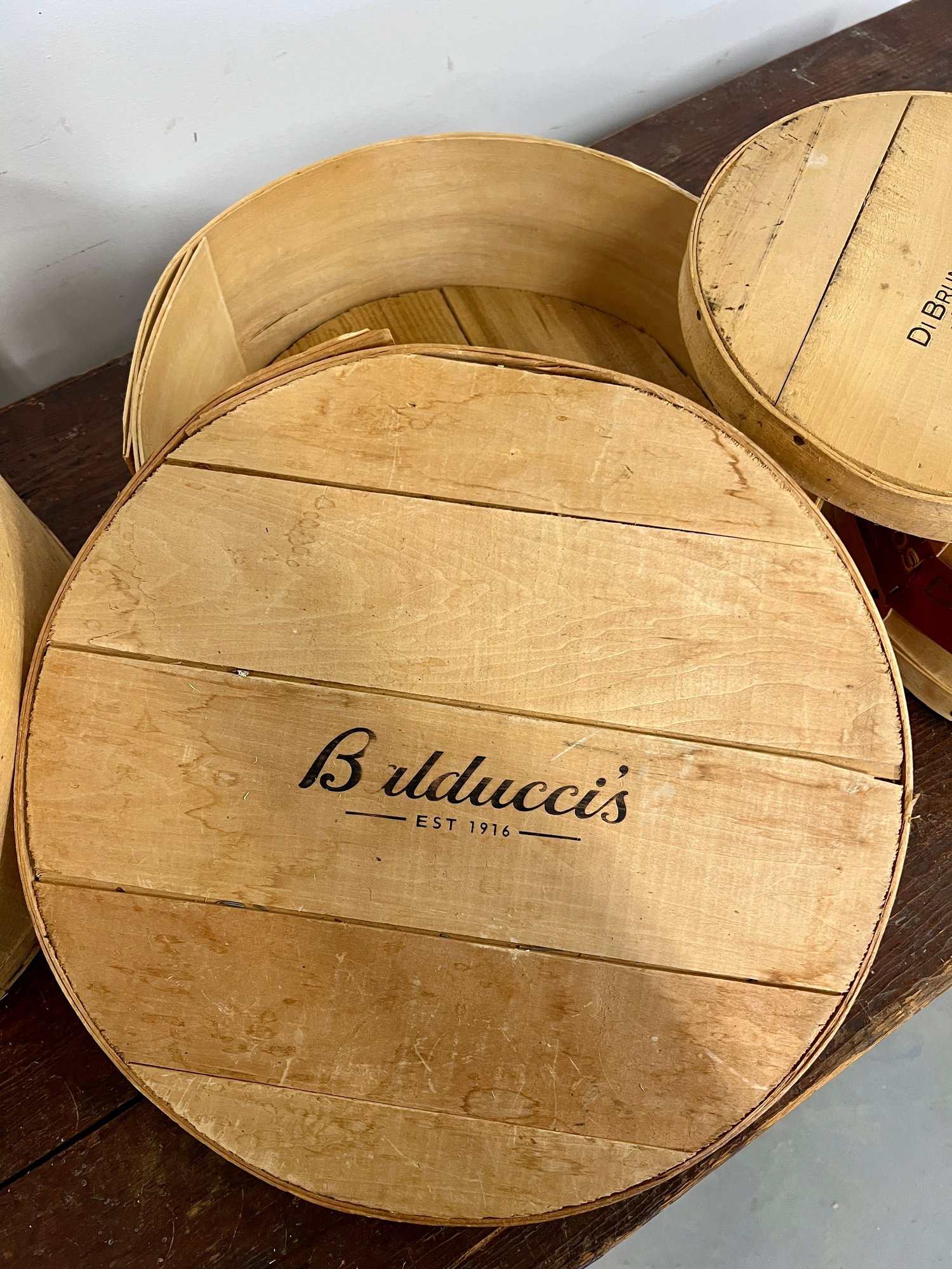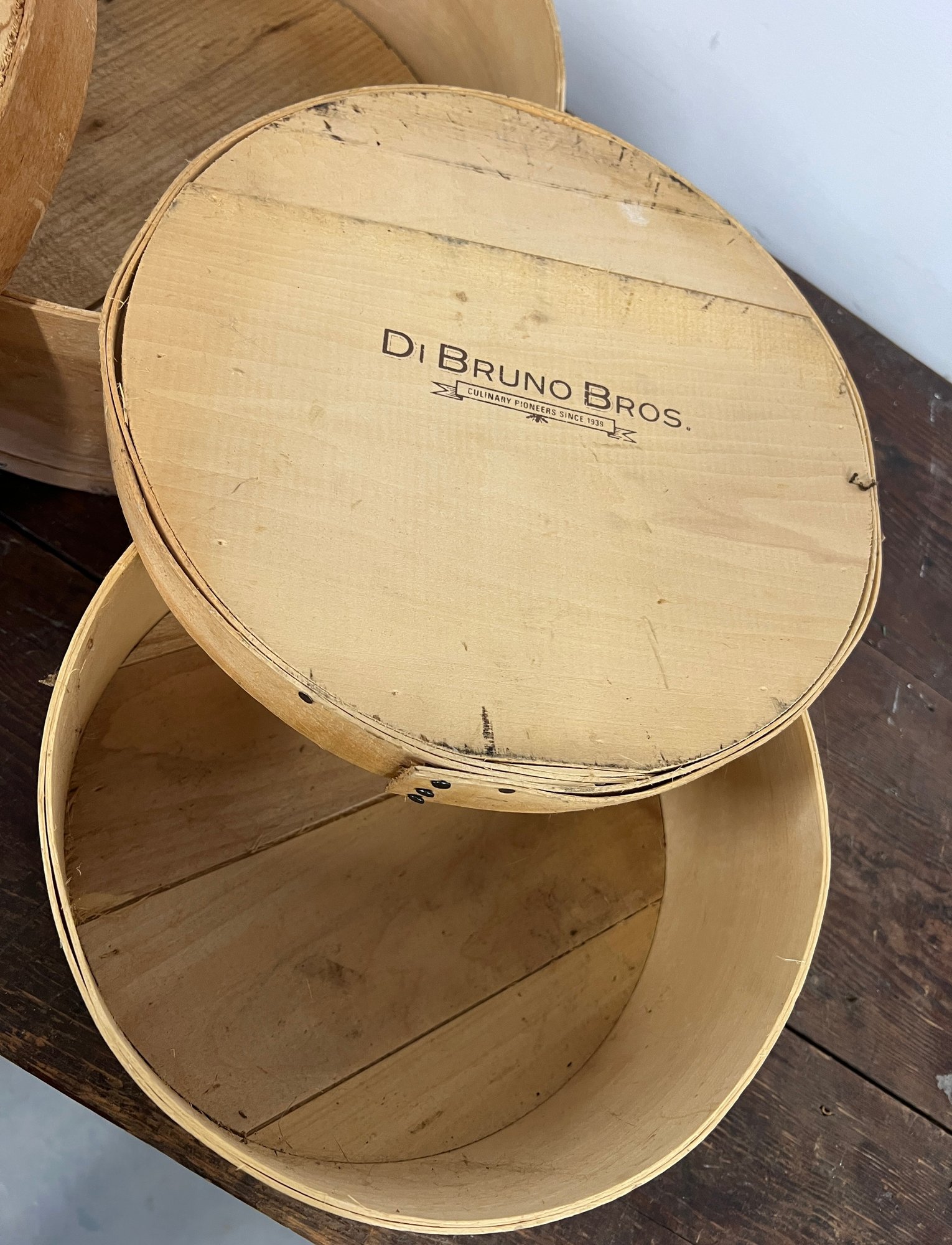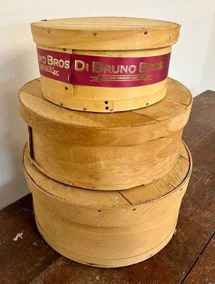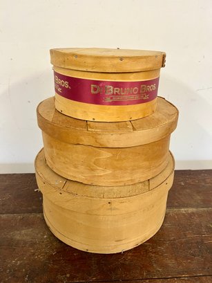 Three round wooden cheese boxes. One from Balduccis and one from DiBruno Brothers.