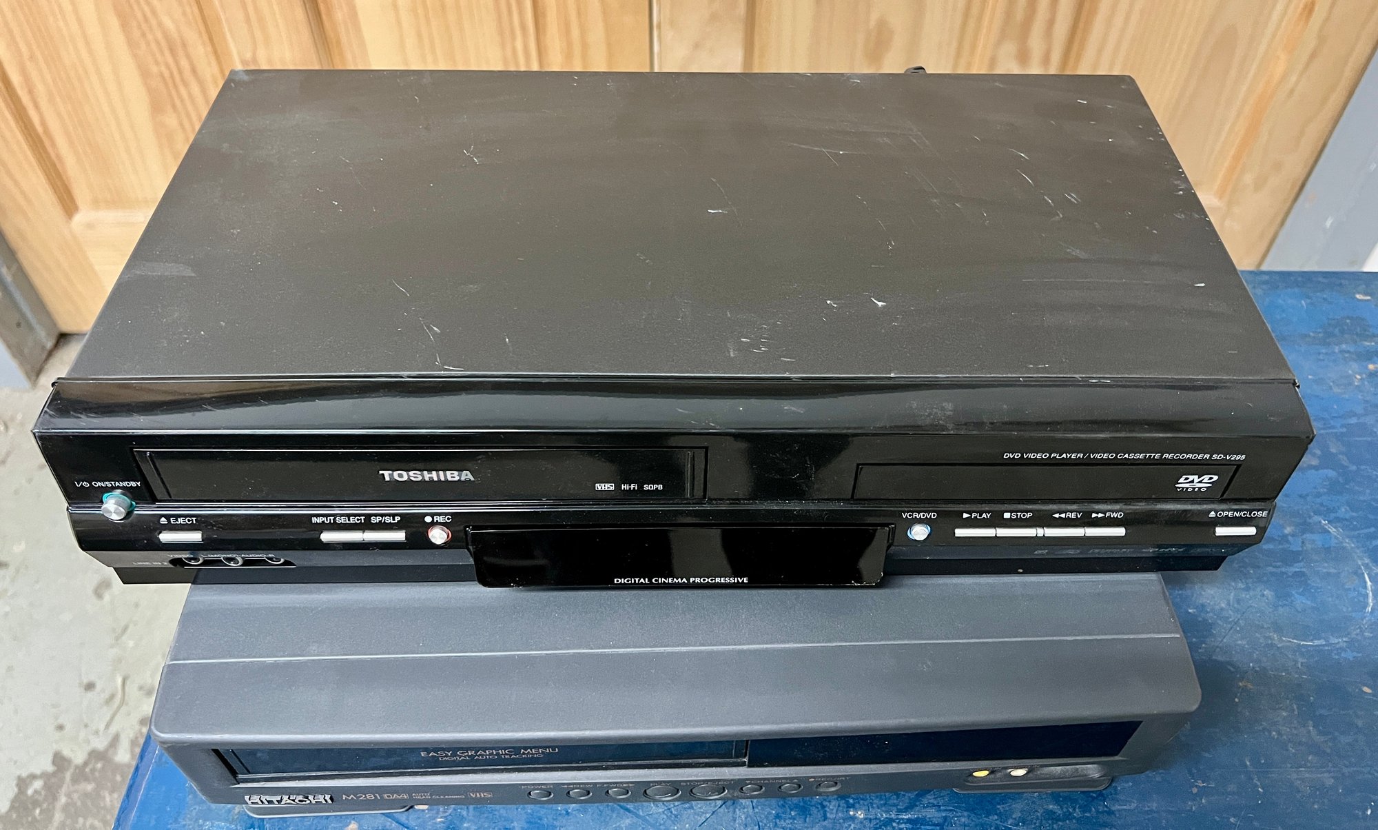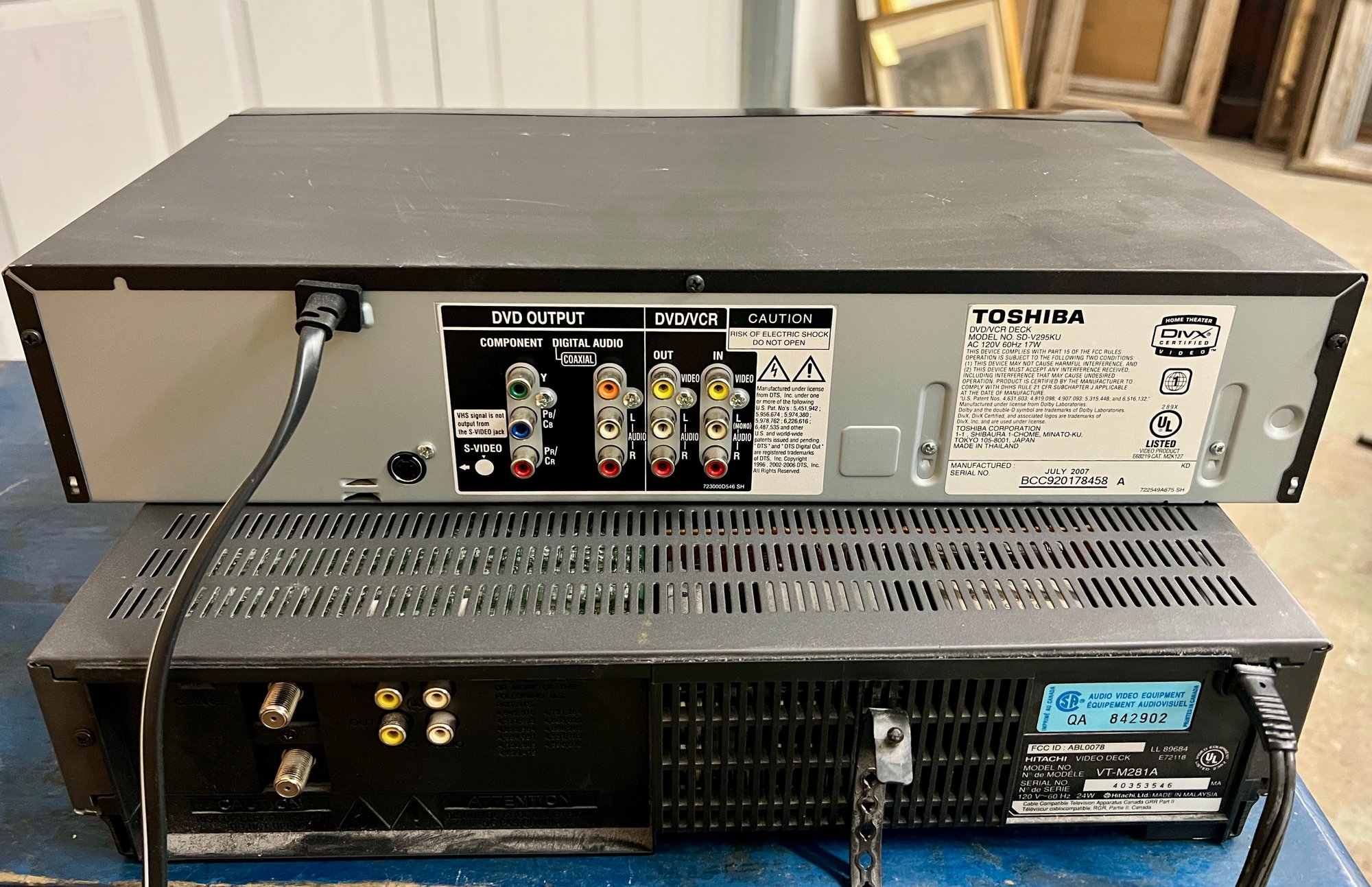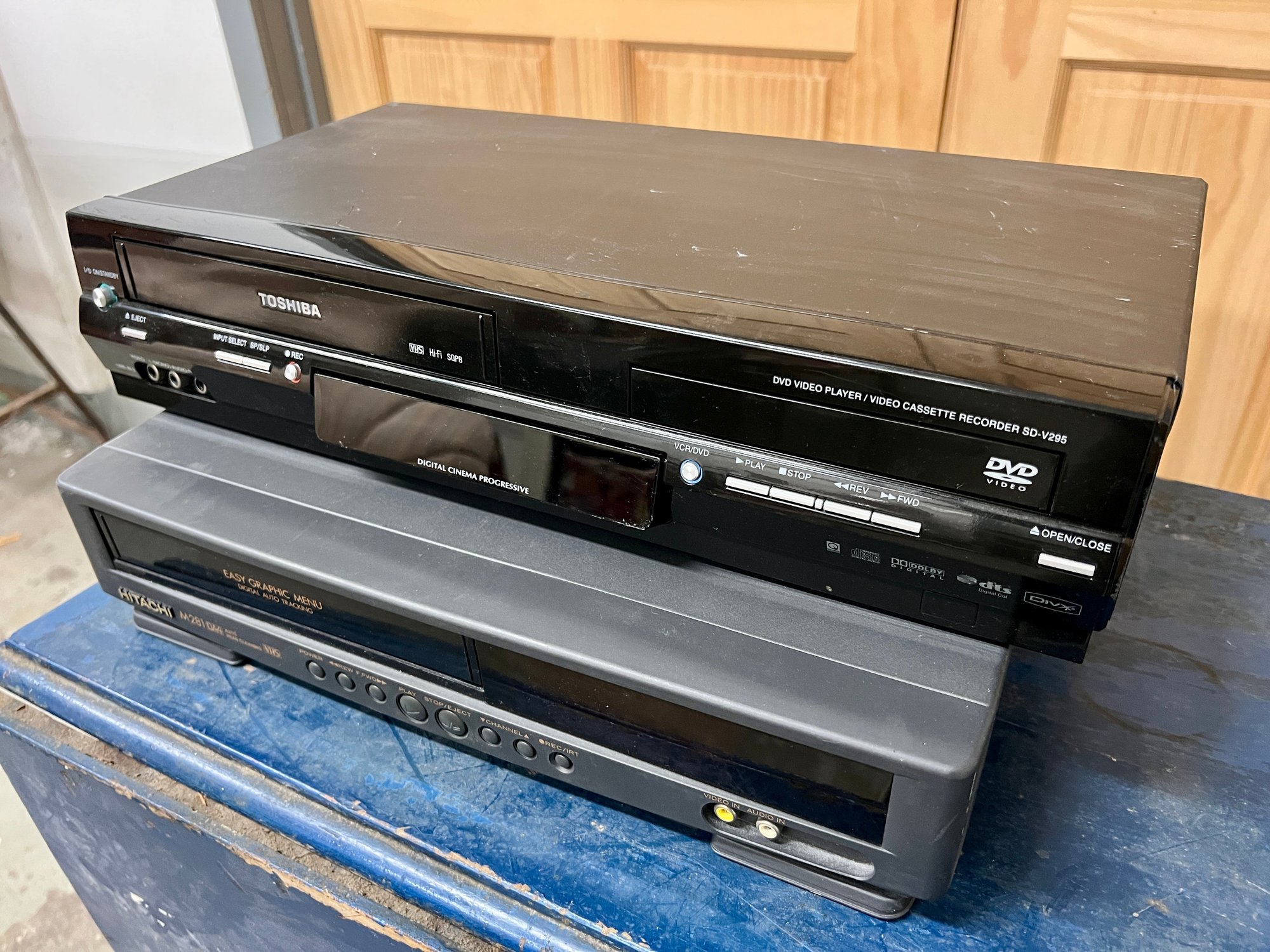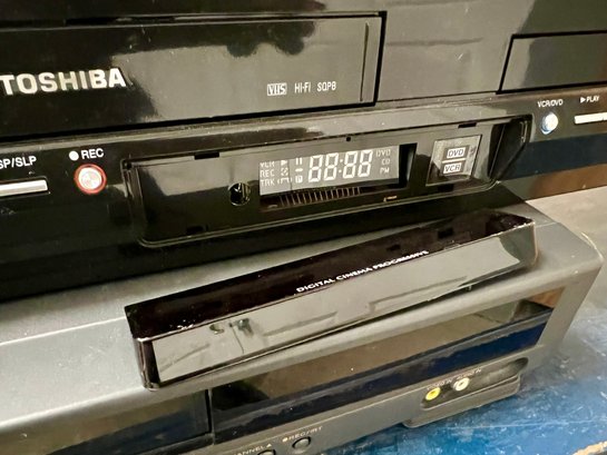 Toshiba and Hitachi DVD/VCR players. The plastic cover in front of the digital display on the Toshiba does not stay in place securely. Both units light up when plugged in, but no guarantee of full functionality.