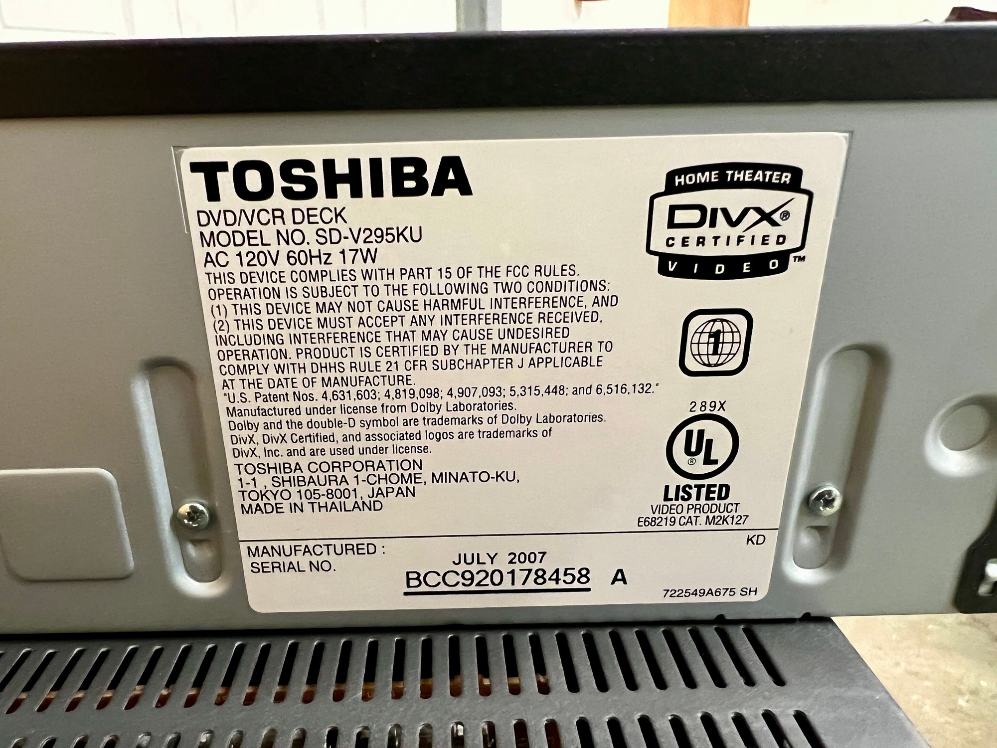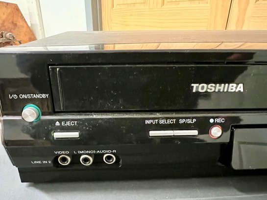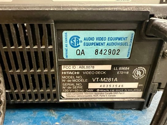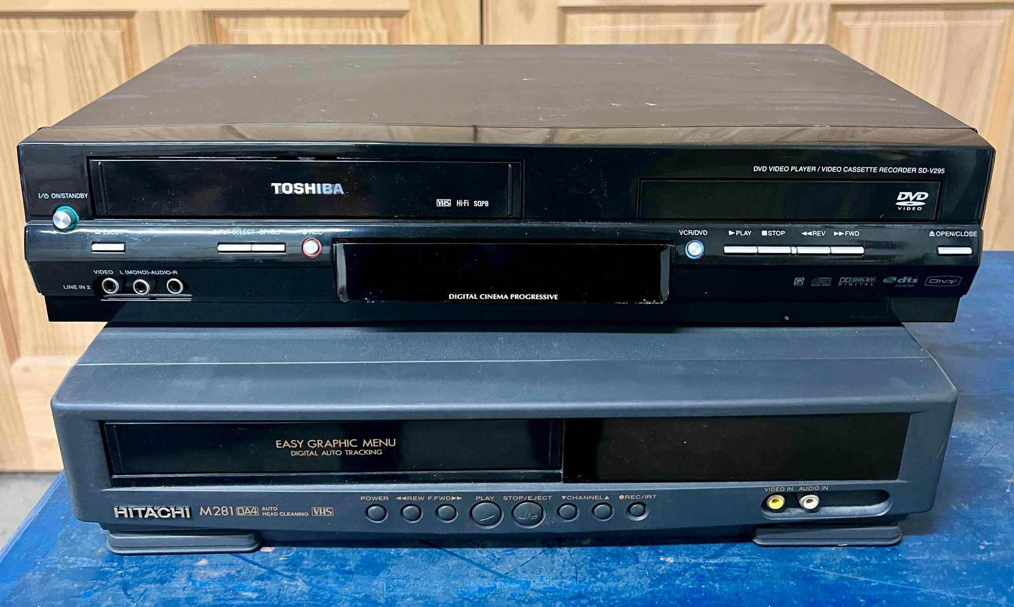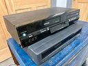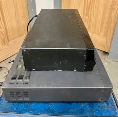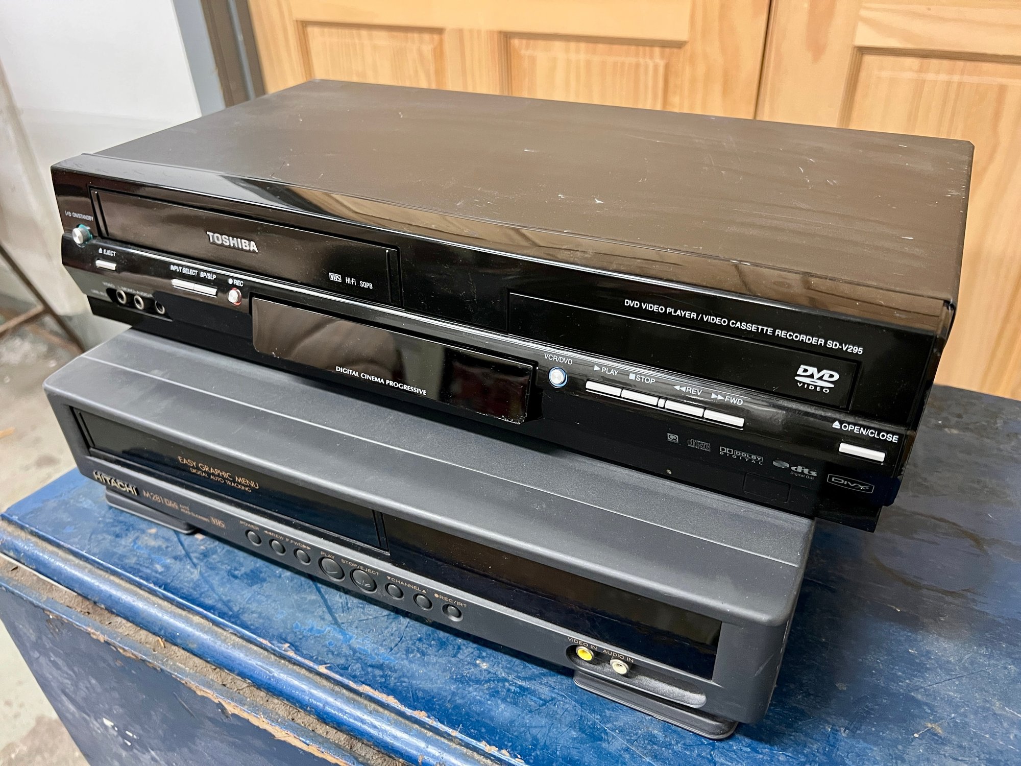 Toshiba and Hitachi DVD/VCR players. The plastic cover in front of the digital display on the Toshiba does not stay in place securely. Both units light up when plugged in, but no guarantee of full functionality.