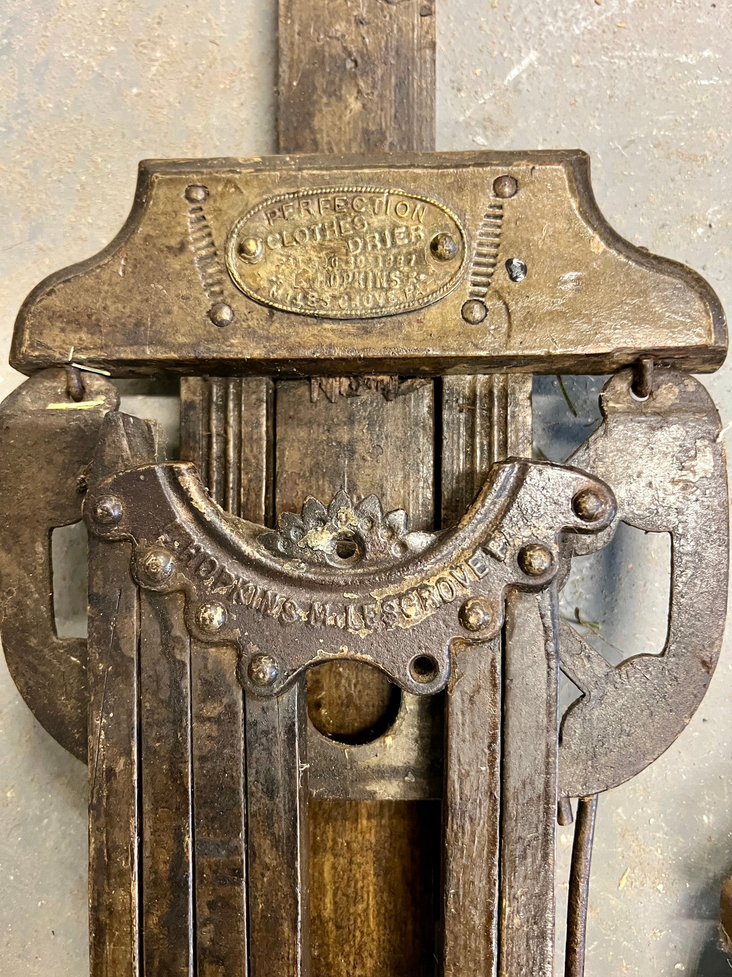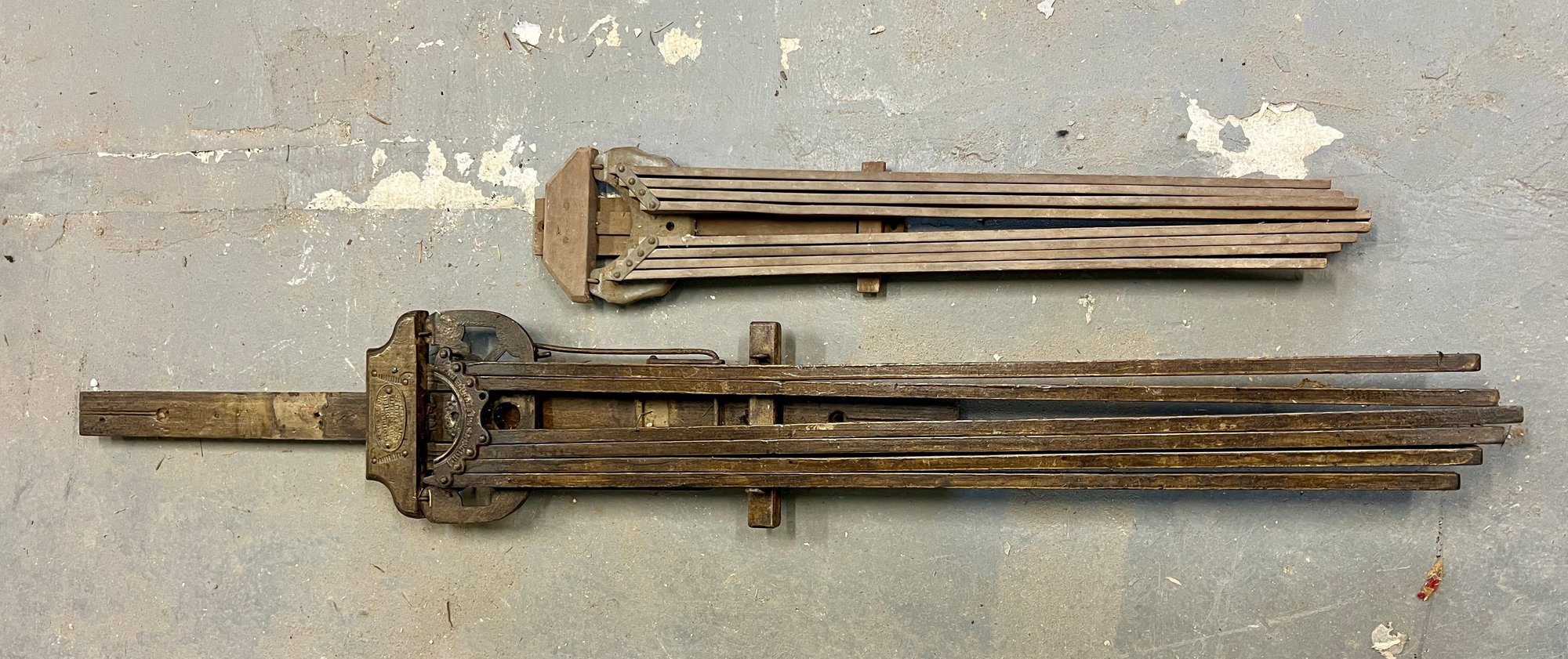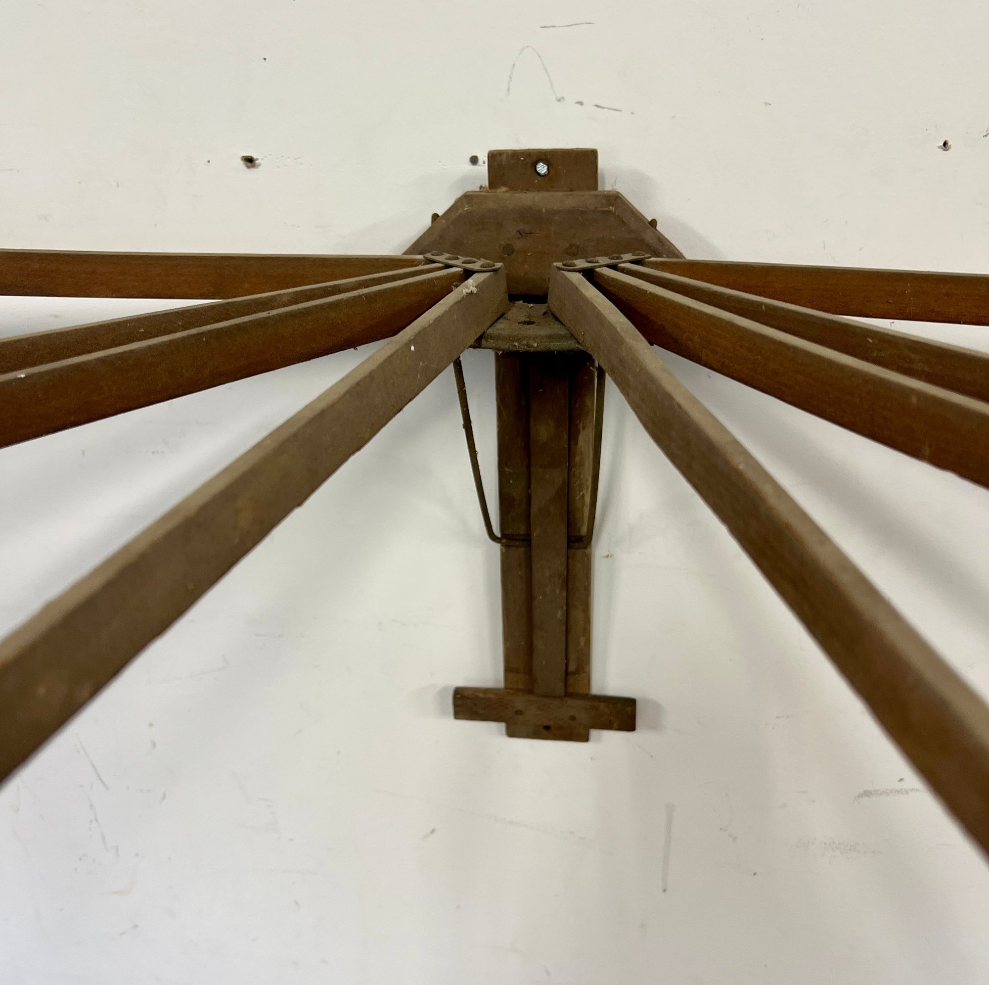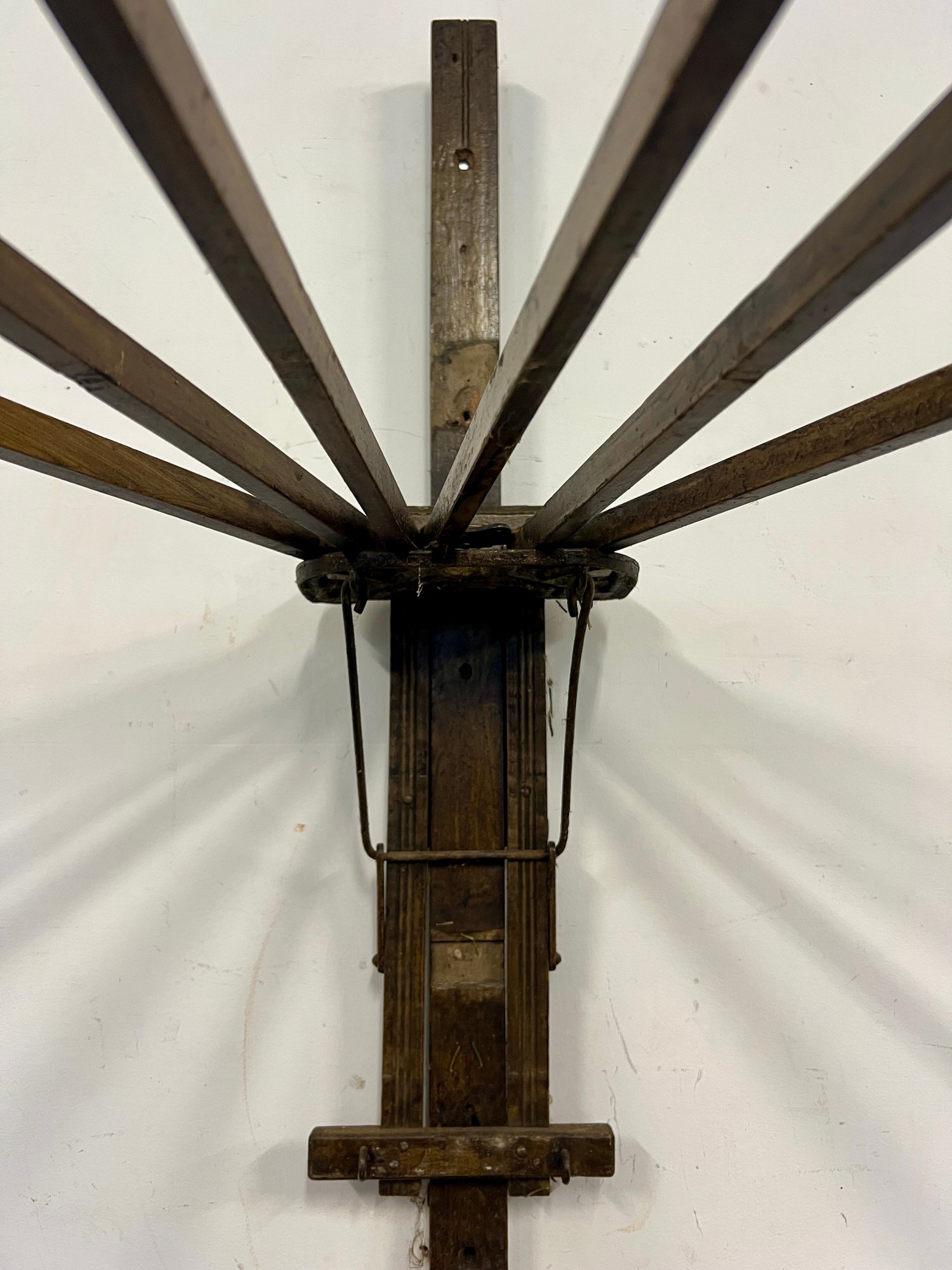 Two antique wooden clothes drying racks. One is missing a spoke.