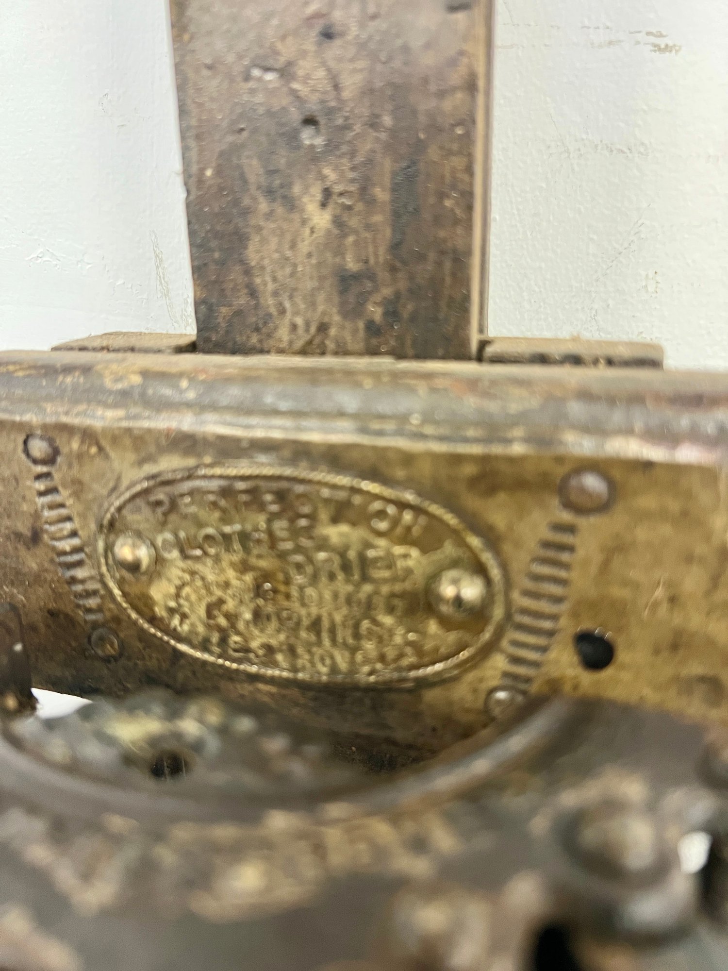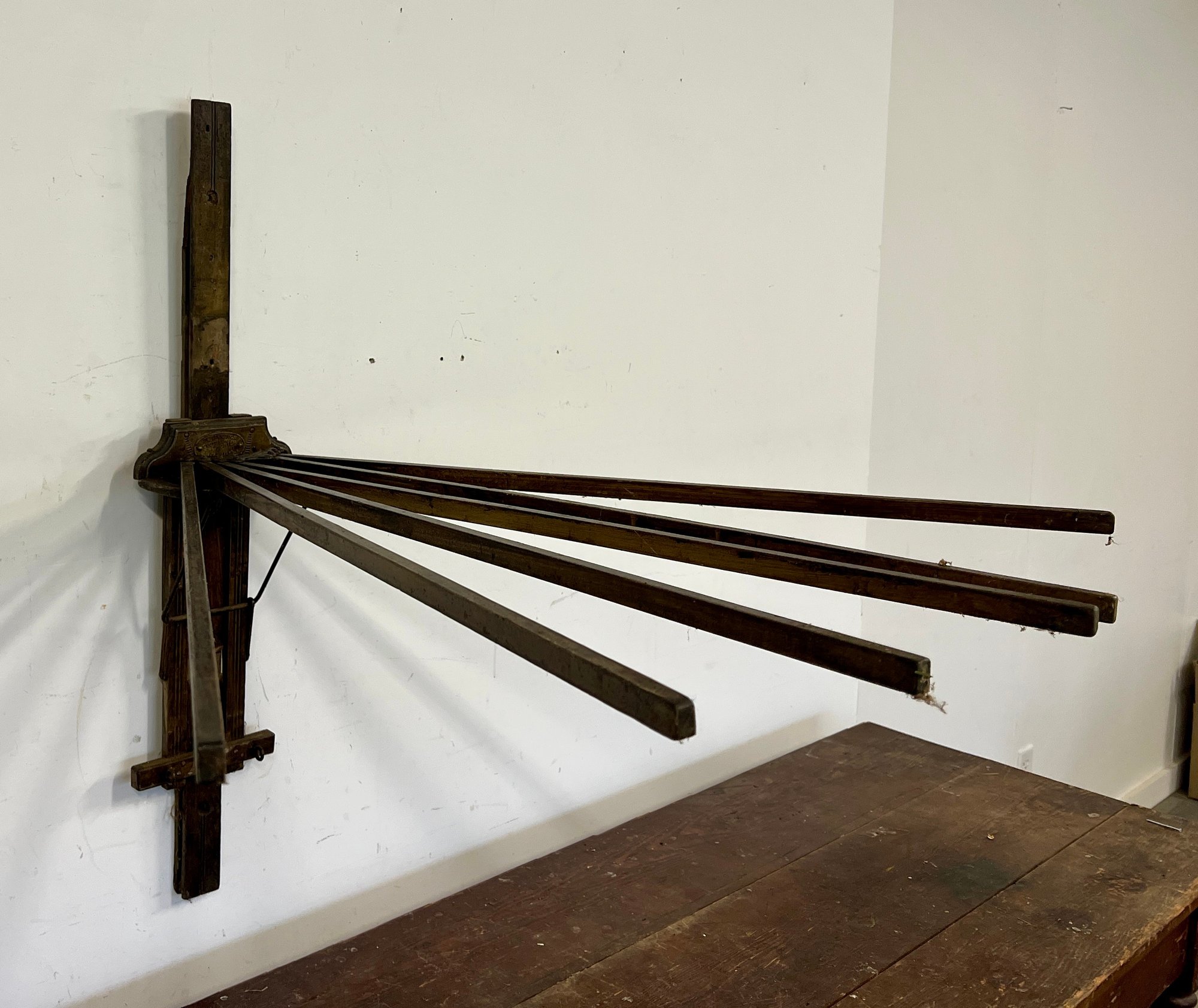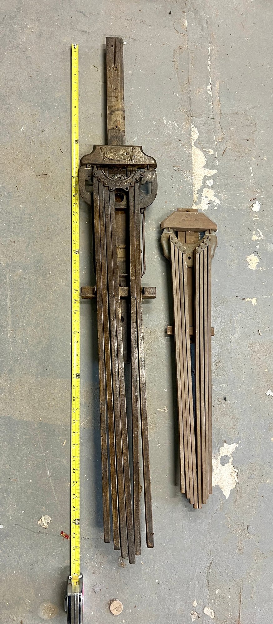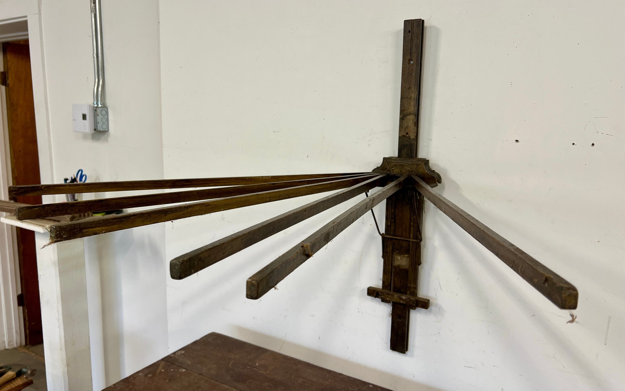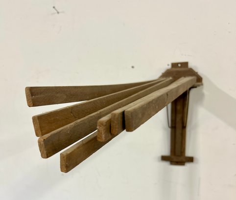 Two antique wooden clothes drying racks. One is missing a spoke.