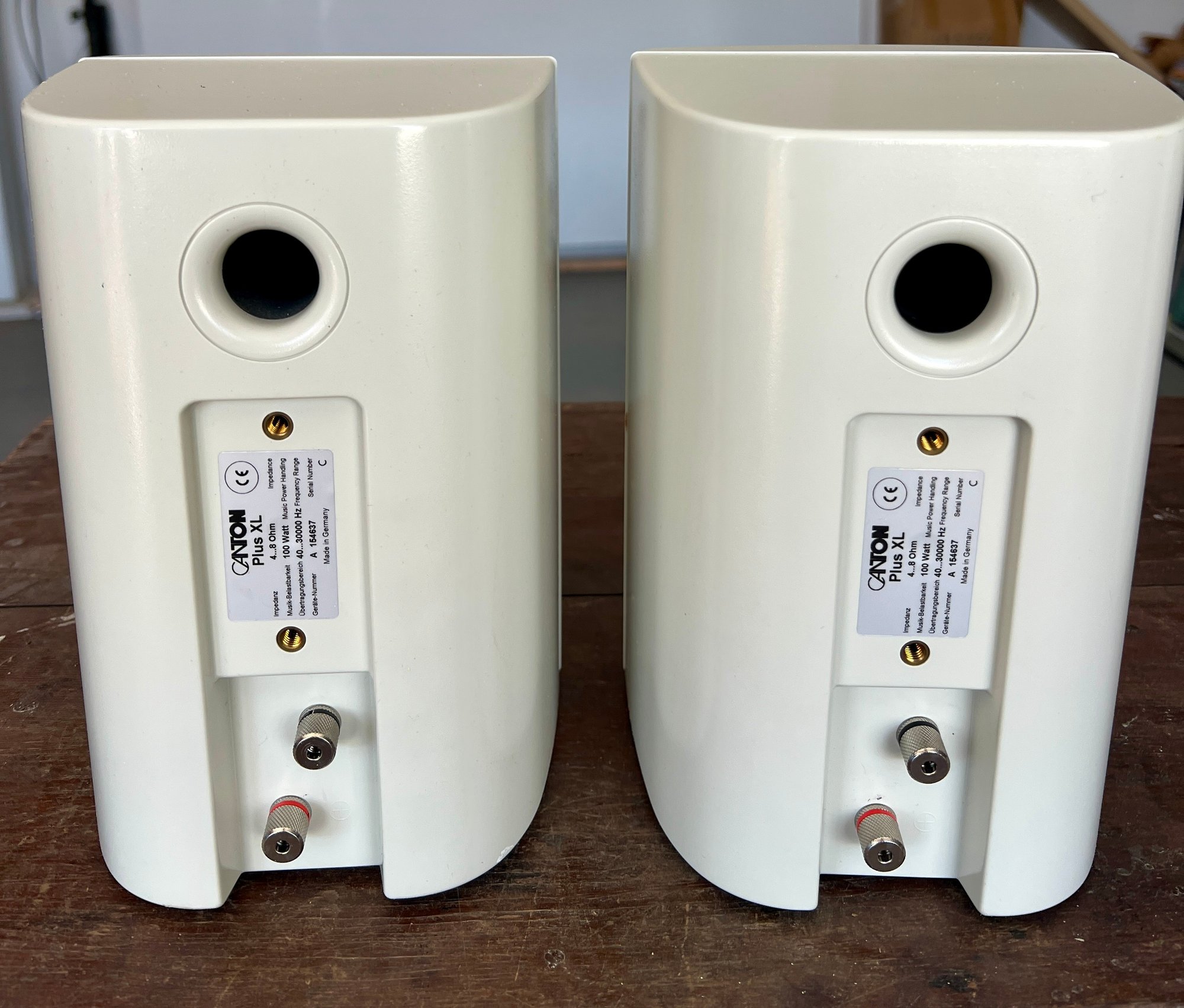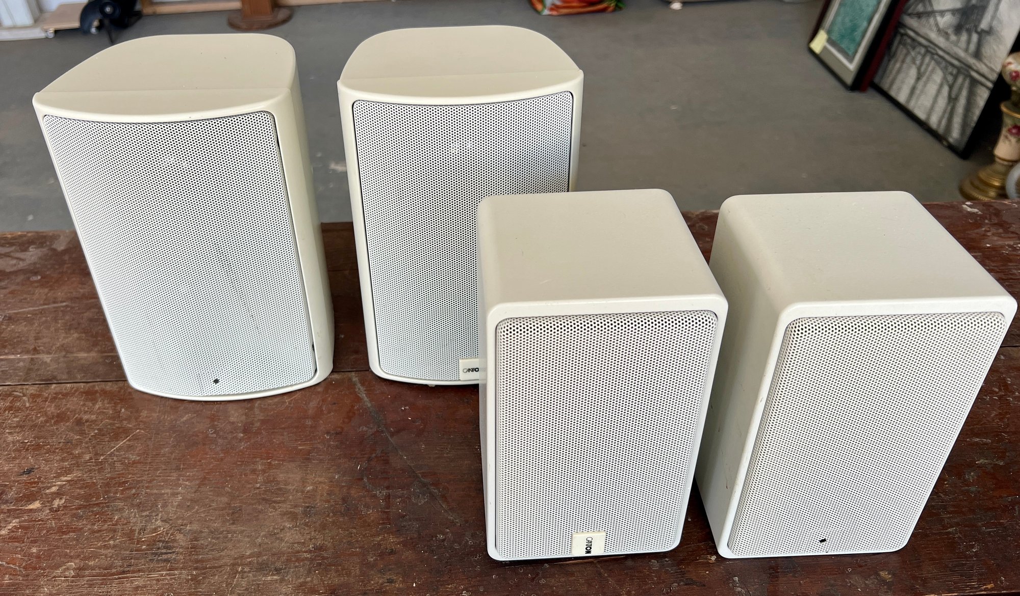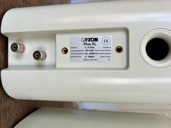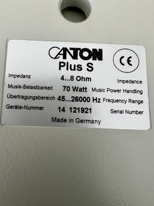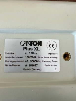 Two pair of Canton bookshelf speakers, model XL and Model S. Made in Germany. No cords are provided. Functionality is unknown. There are two missing logo plates and one XL speaker grill is dented.