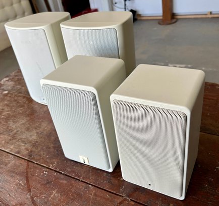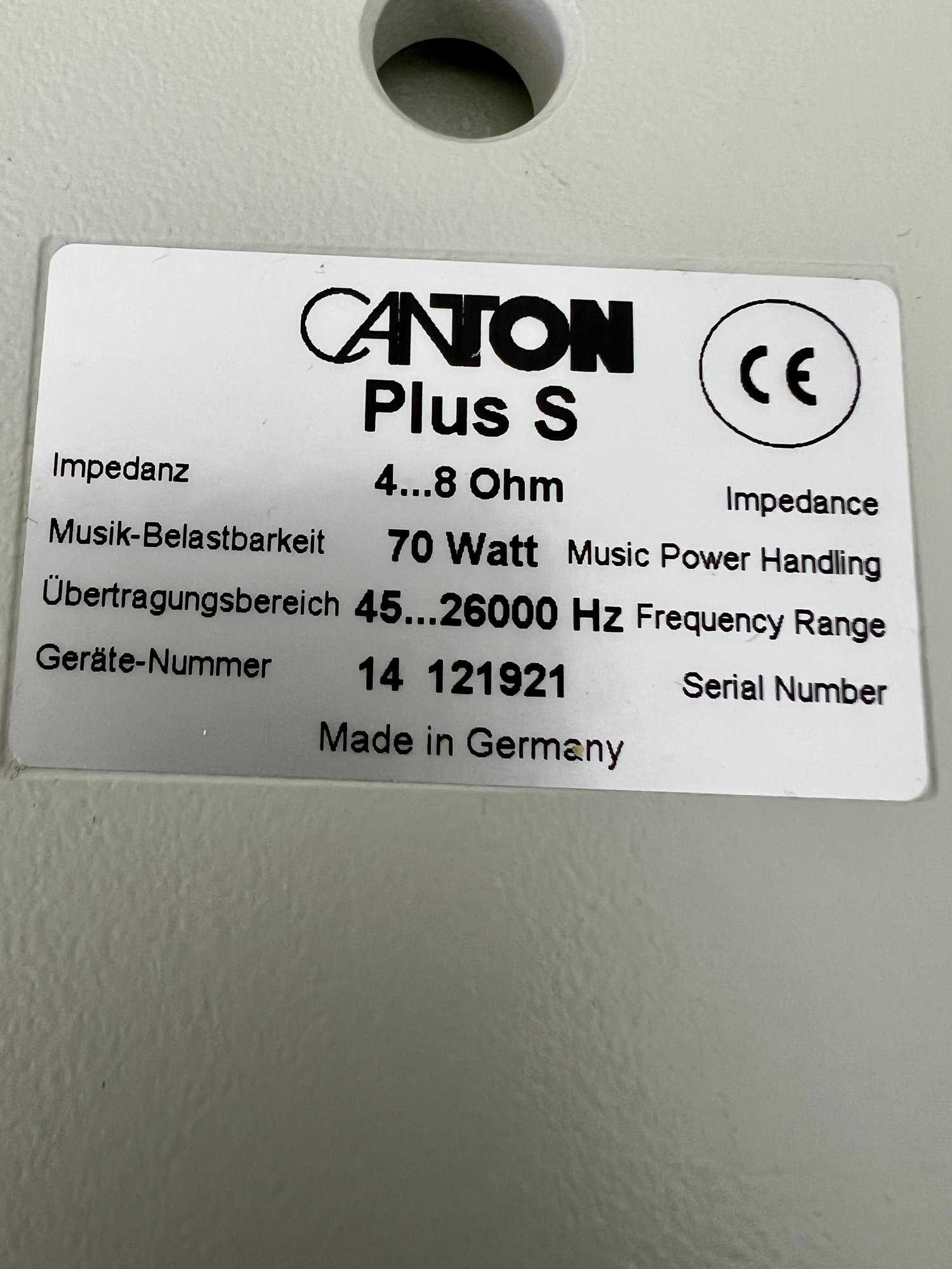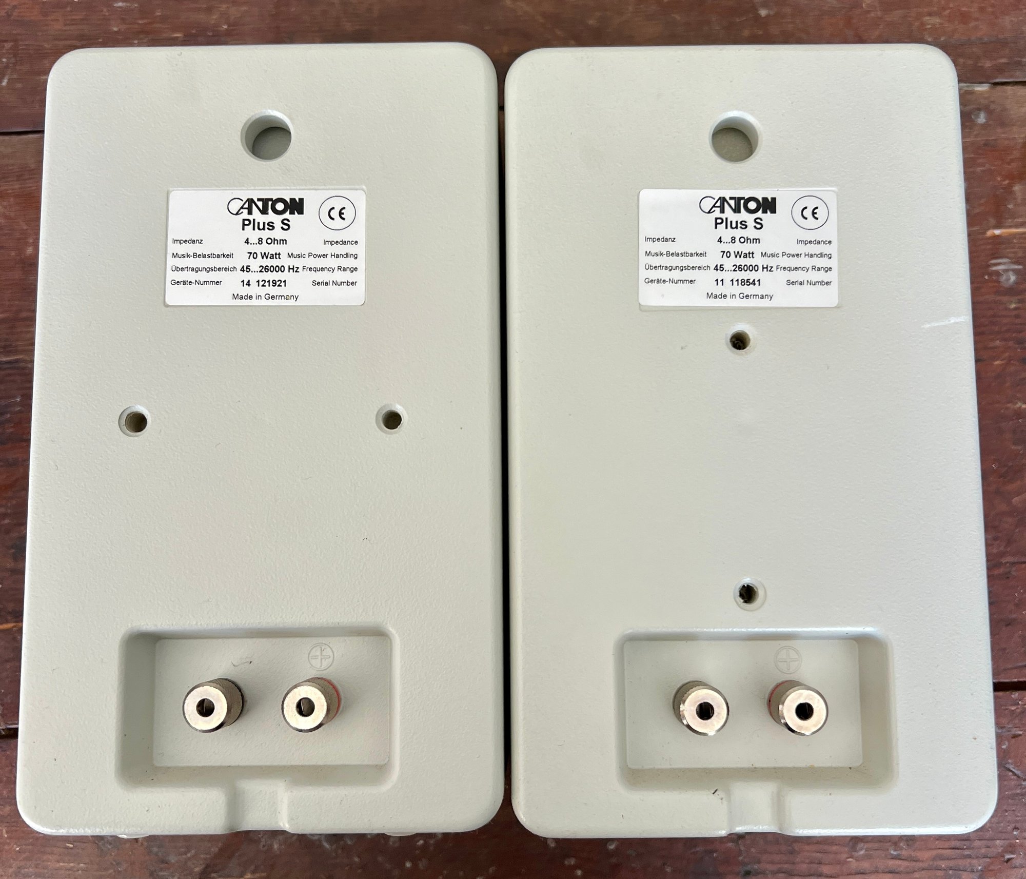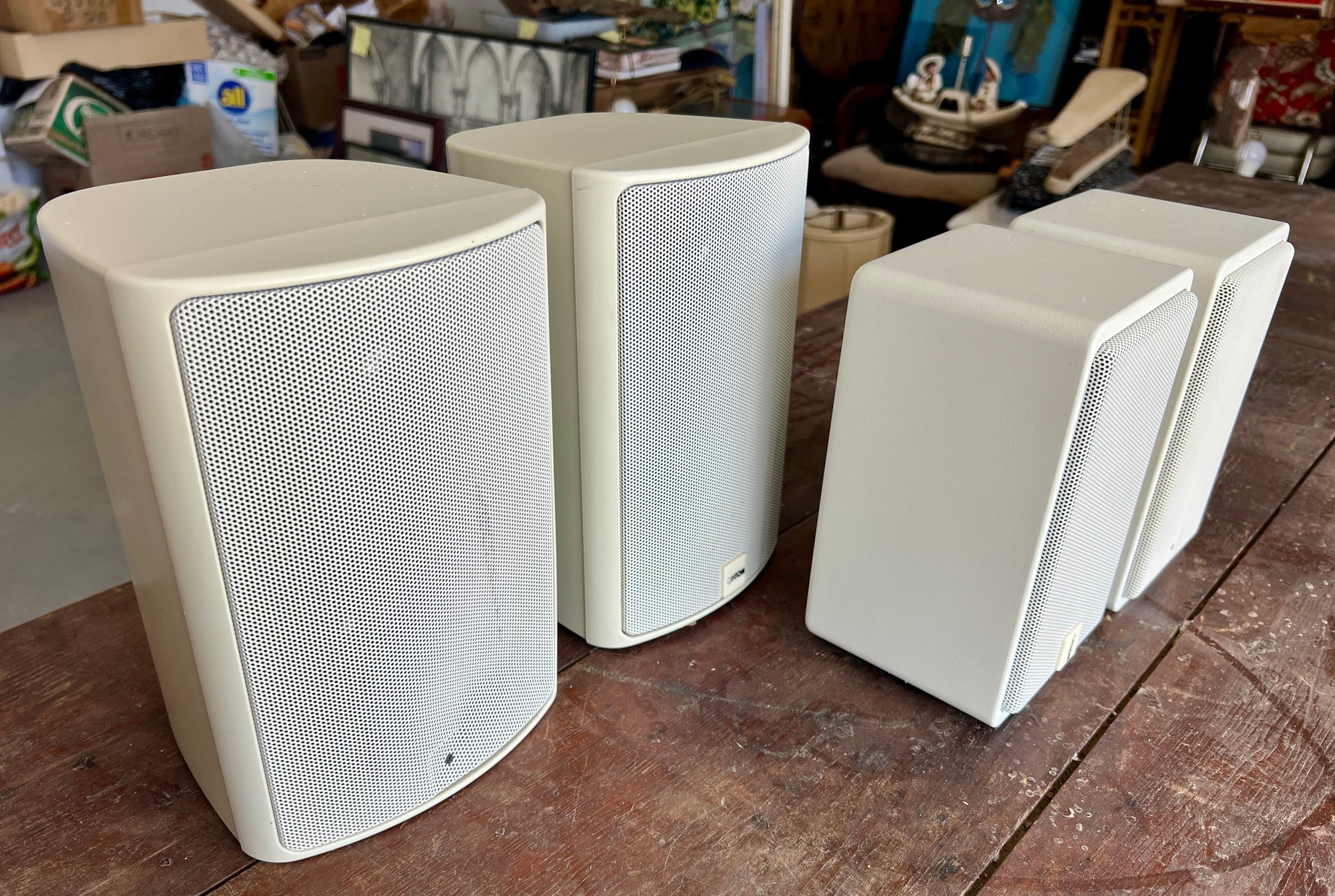 Two pair of Canton bookshelf speakers, model XL and Model S. Made in Germany. No cords are provided. Functionality is unknown. There are two missing logo plates and one XL speaker grill is dented.