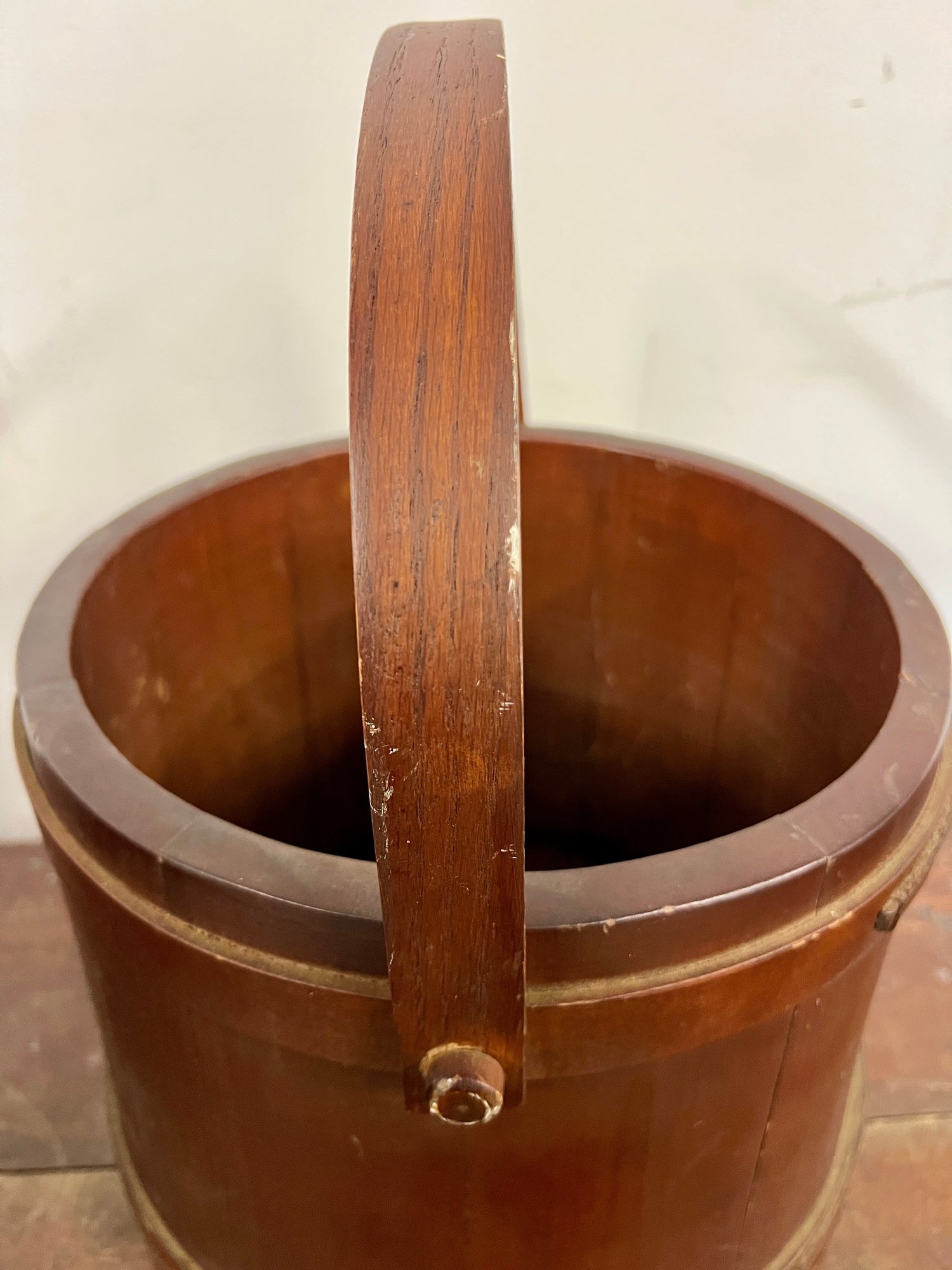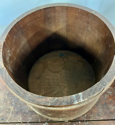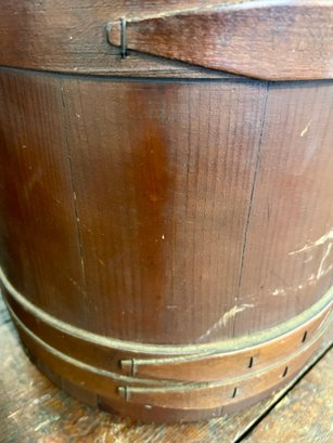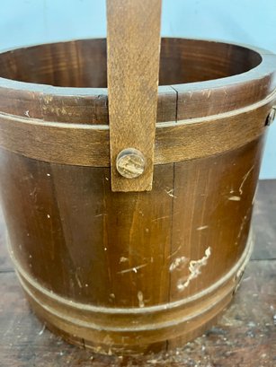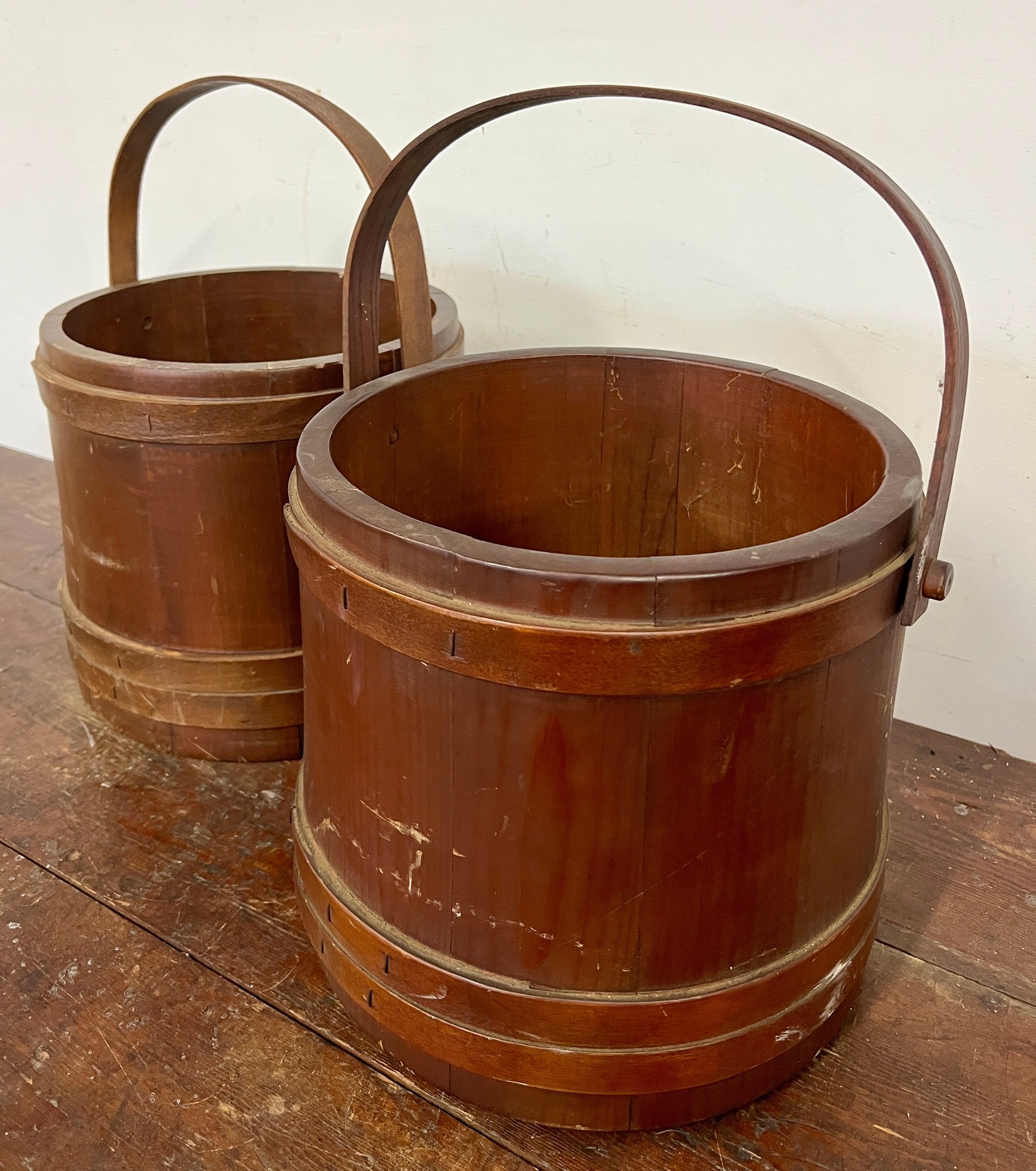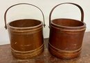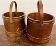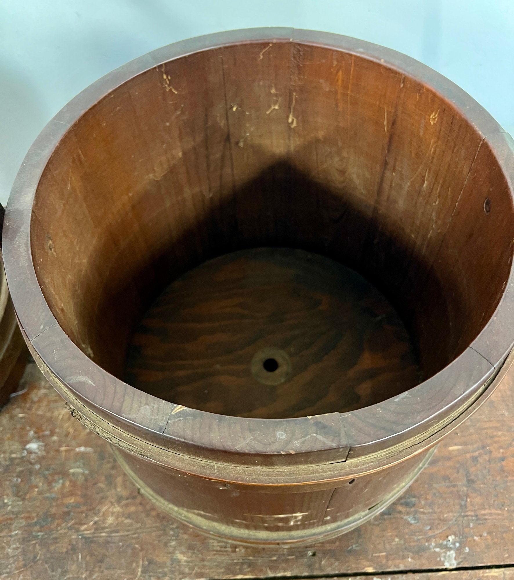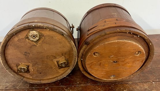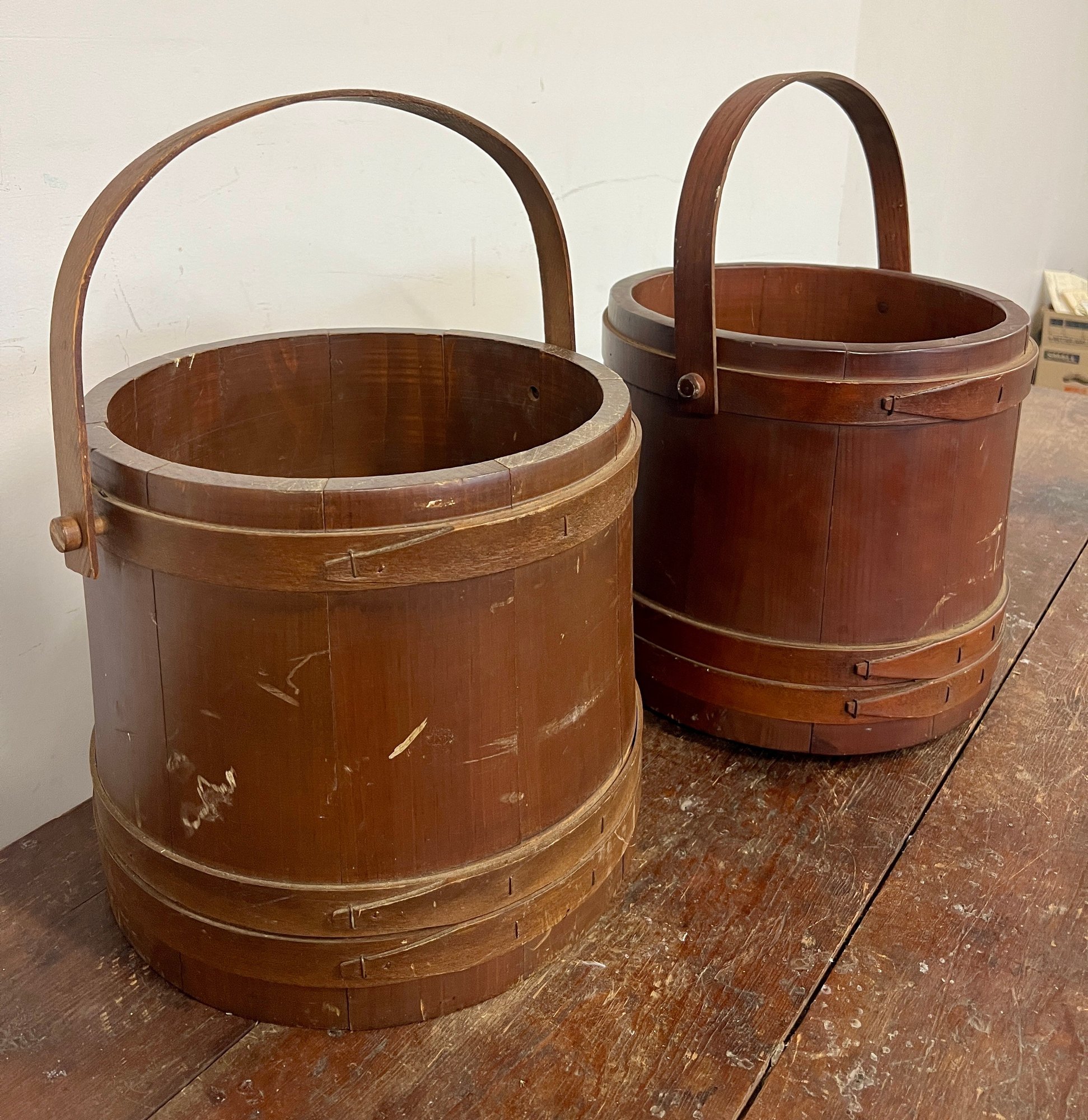 Two vintage wooden firkin buckets. There are scratches and discolorations on the wood finish.