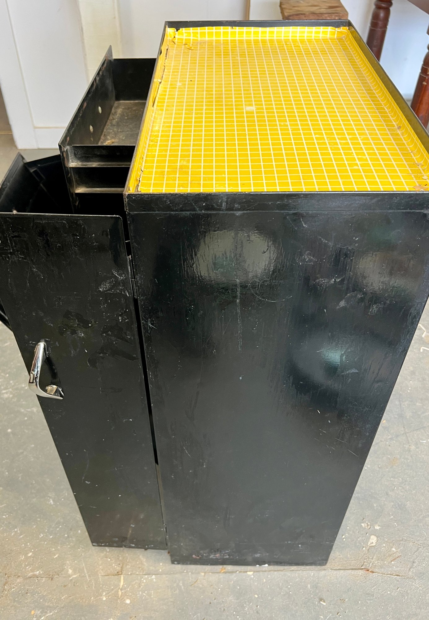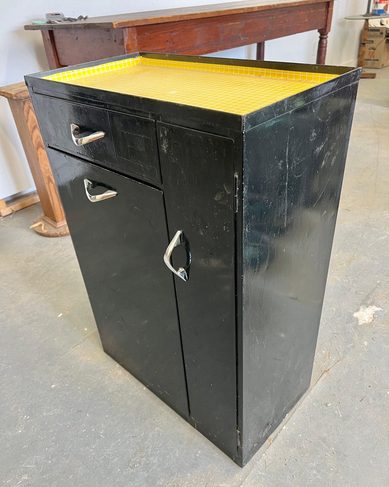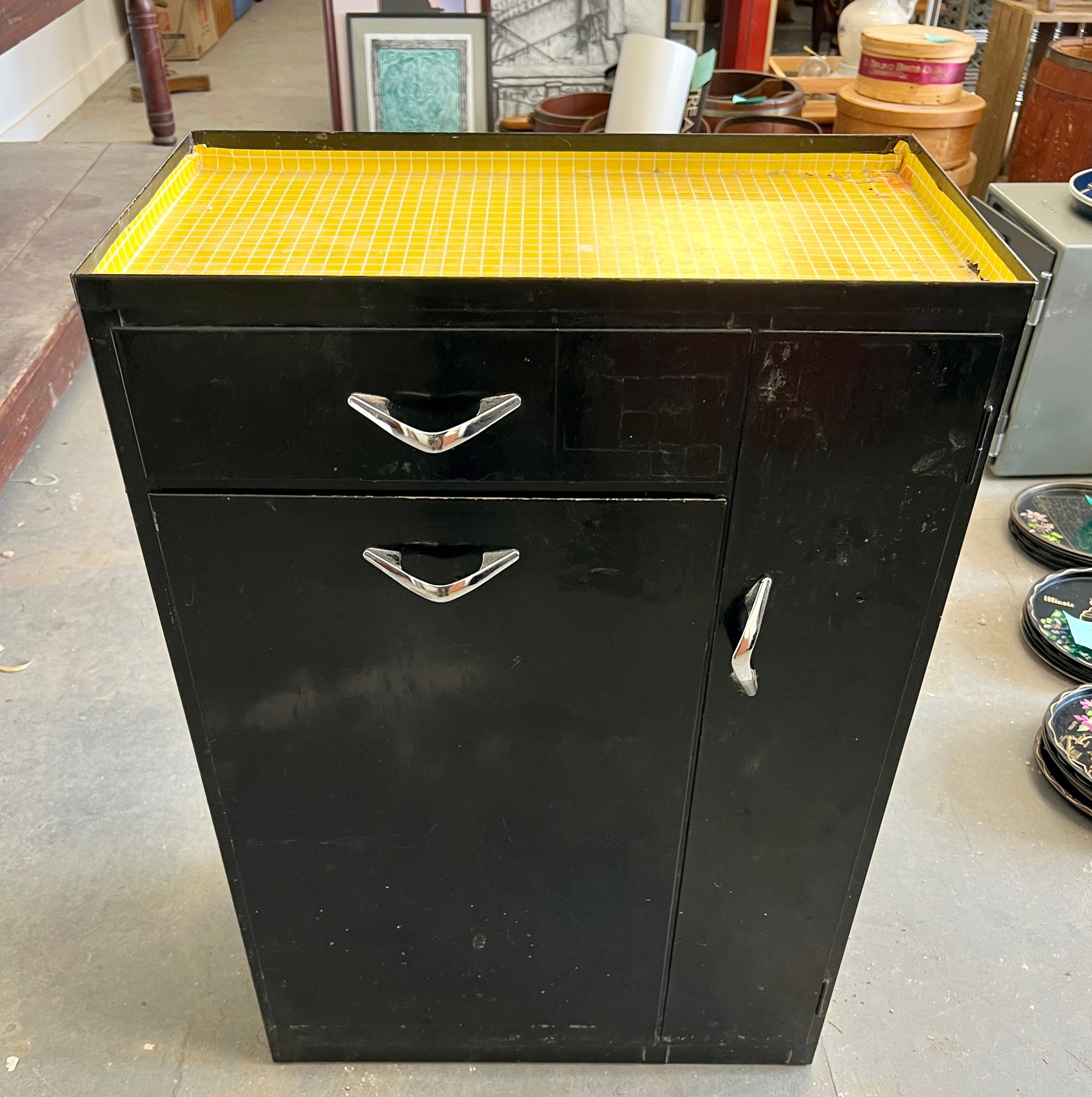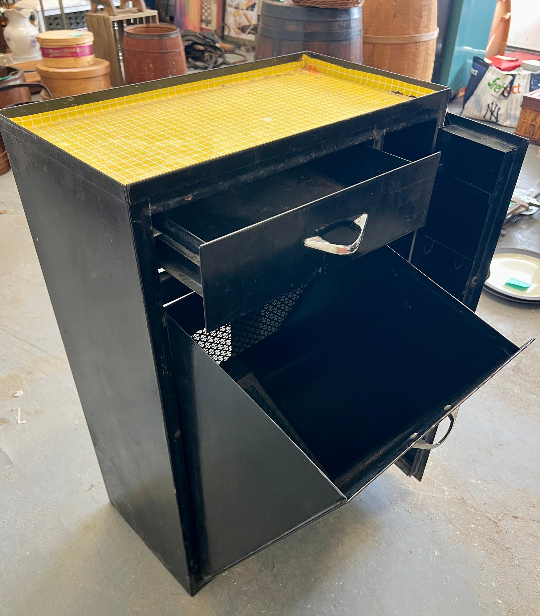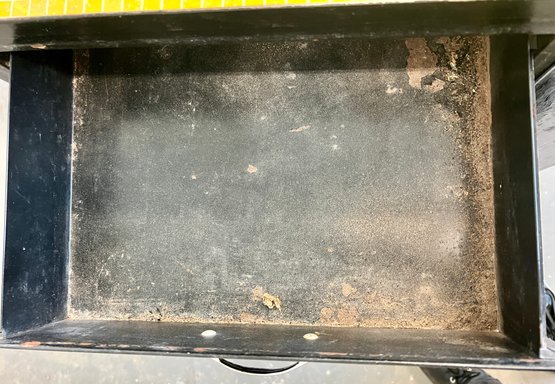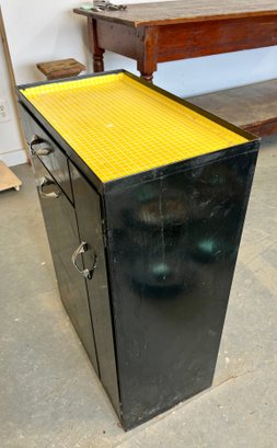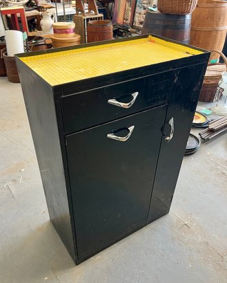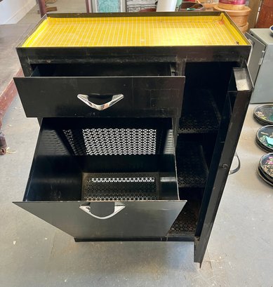 Vintage black metal cabinet with tip out mesh drawer. Metal finish is worn and cracked. Top has been covered in contact paper.