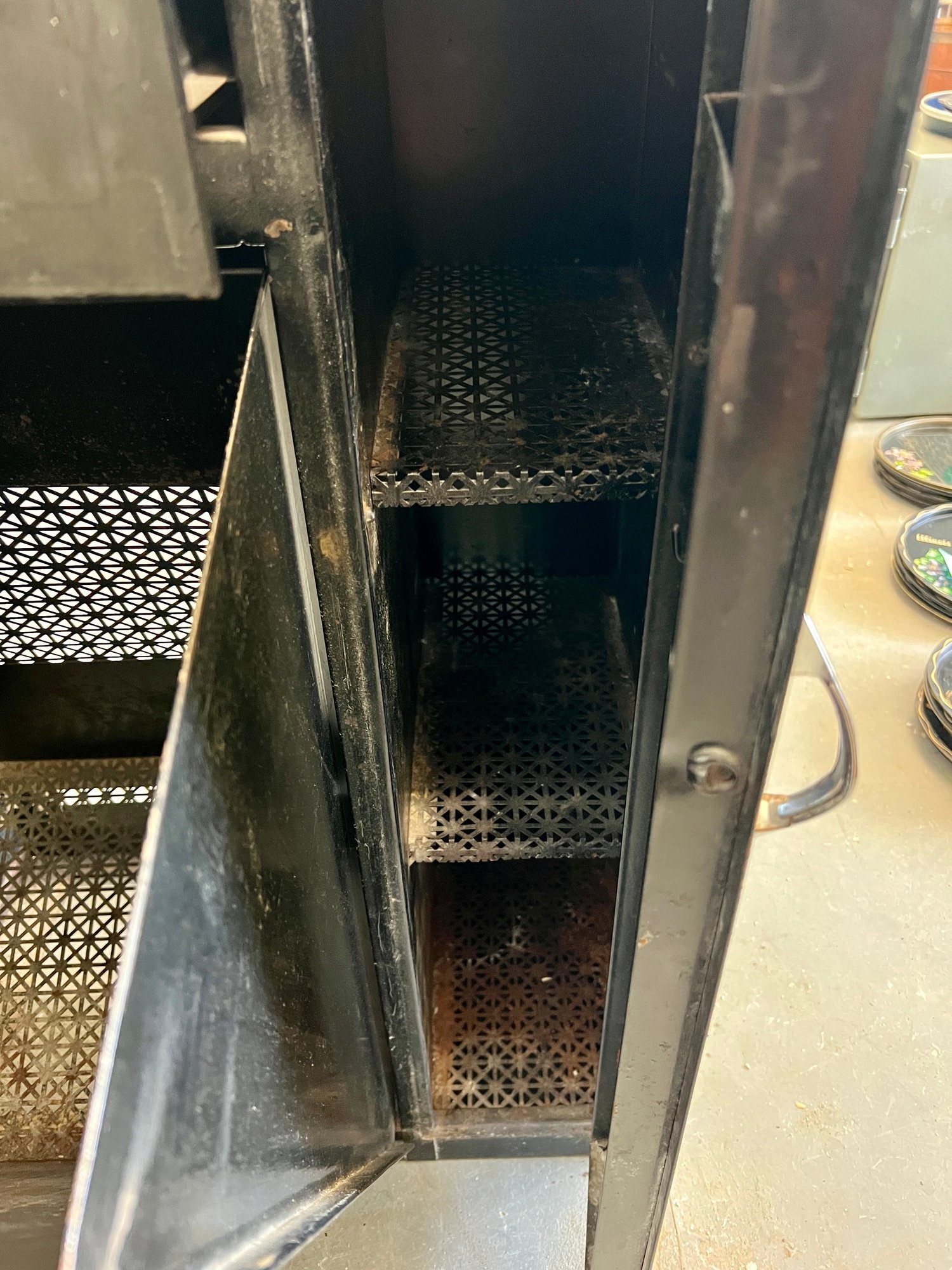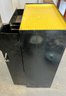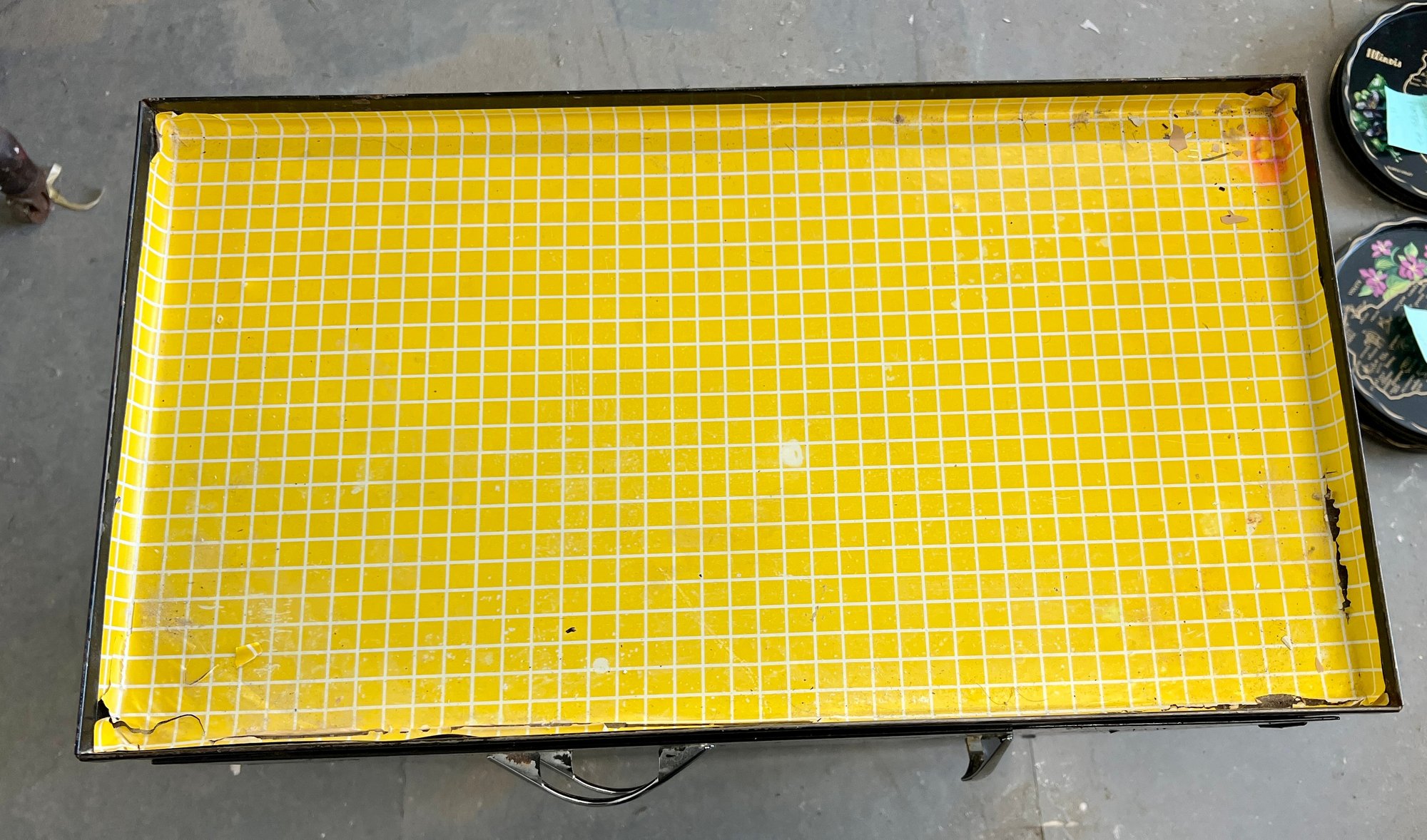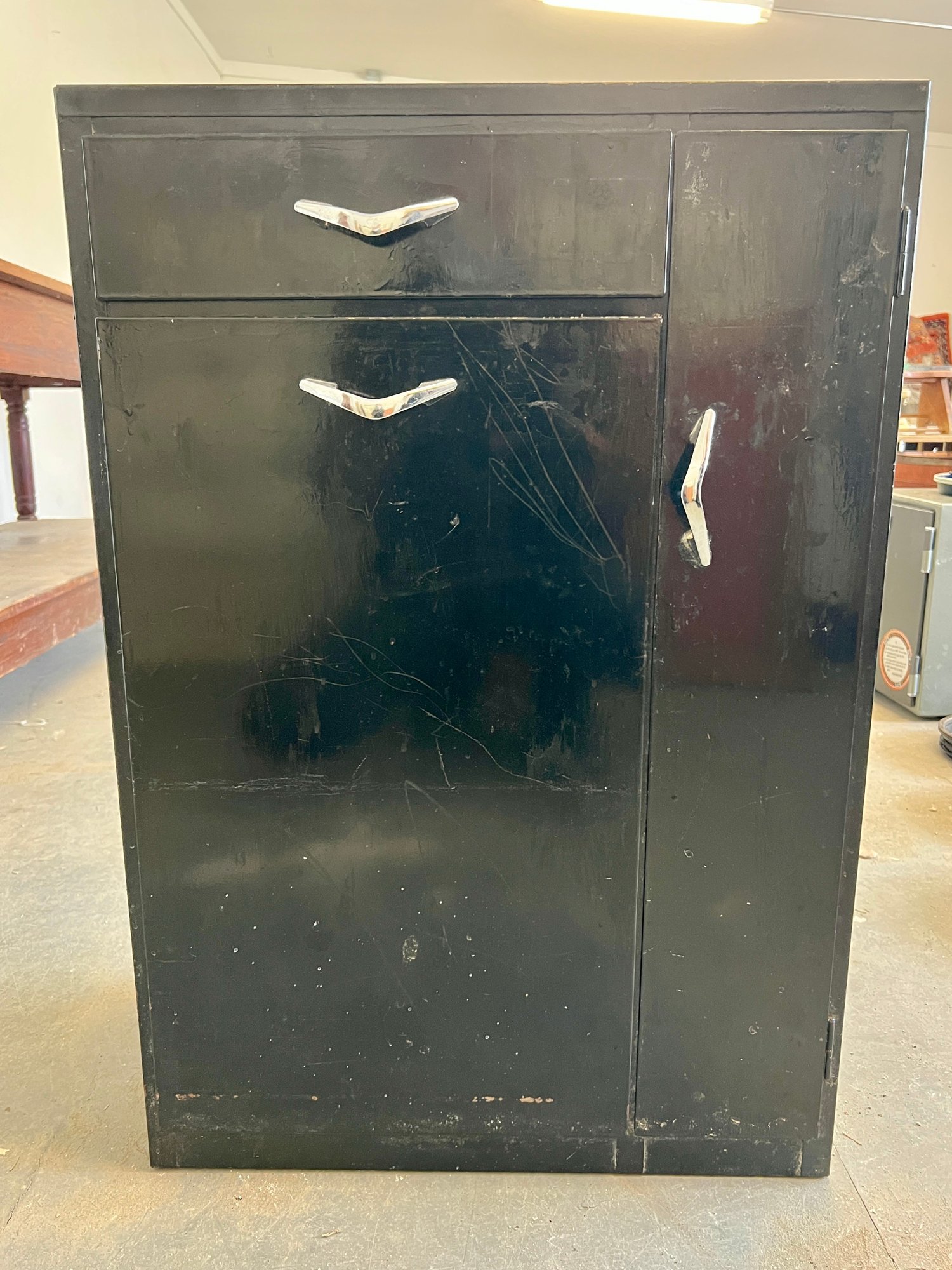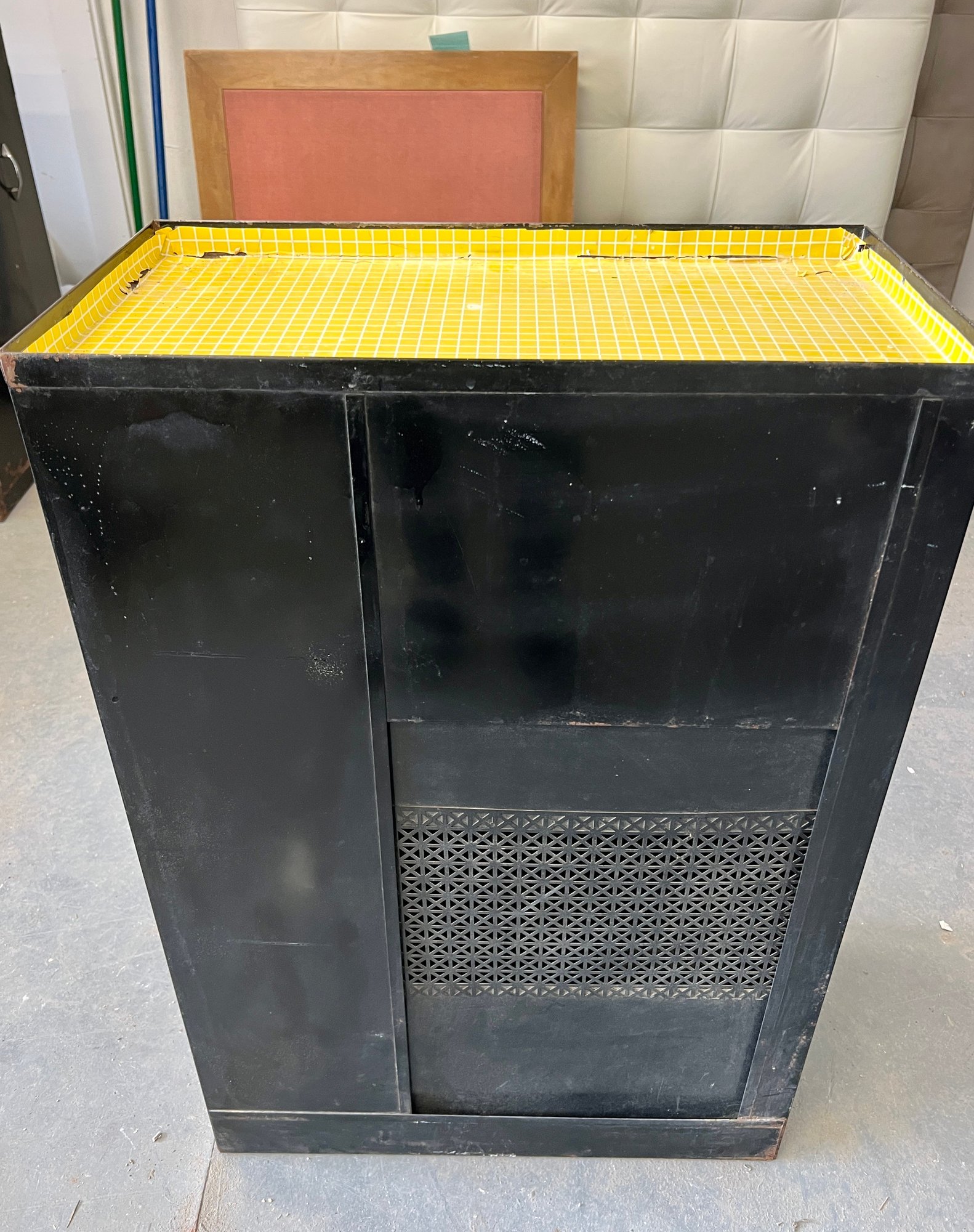 Vintage black metal cabinet with tip out mesh drawer. Metal finish is worn and cracked. Top has been covered in contact paper.