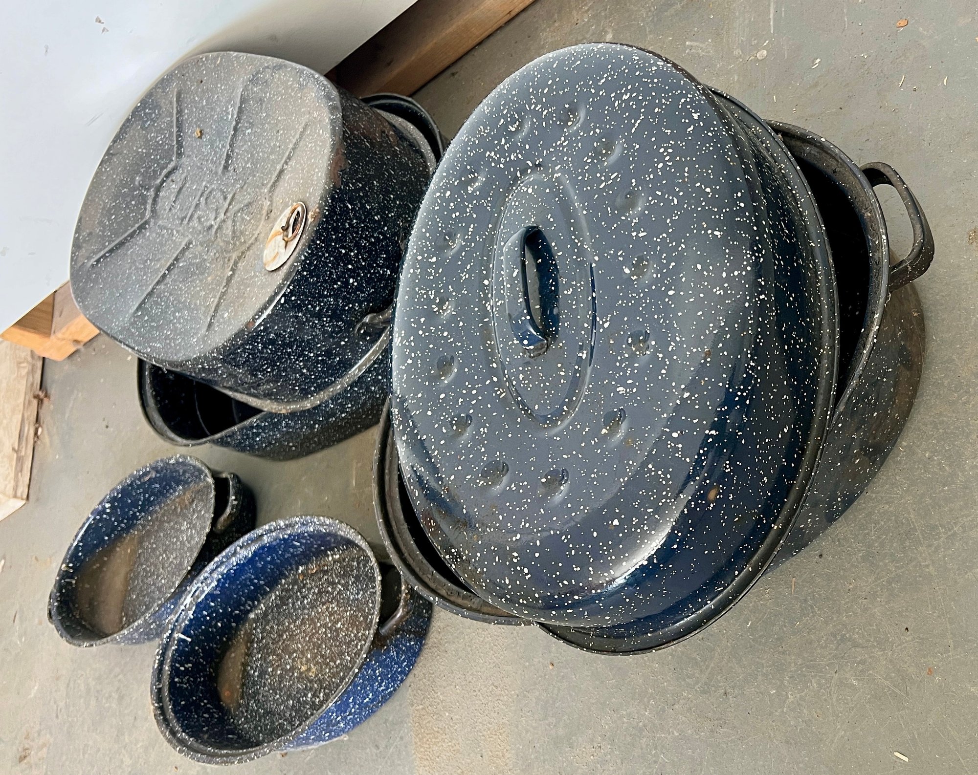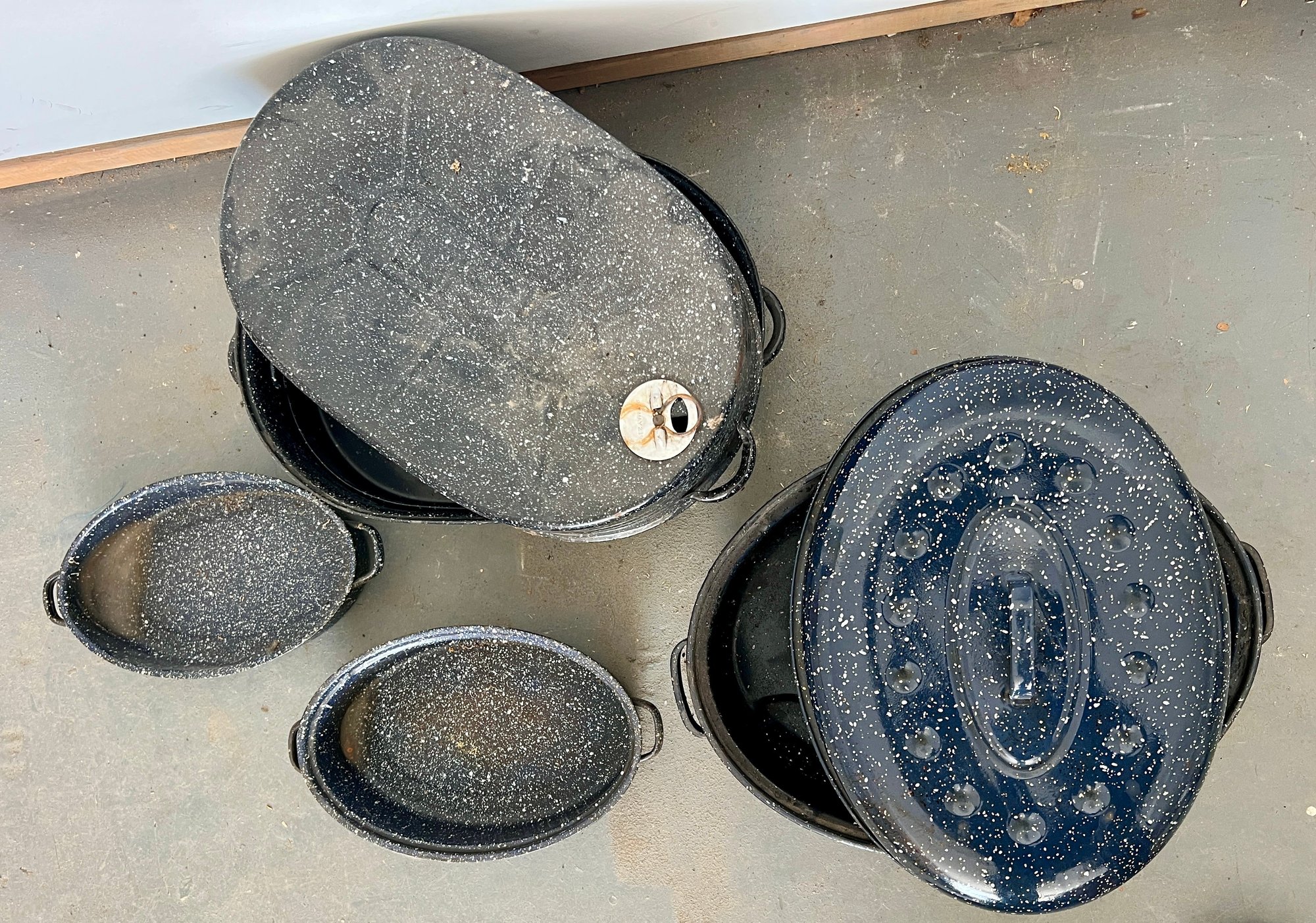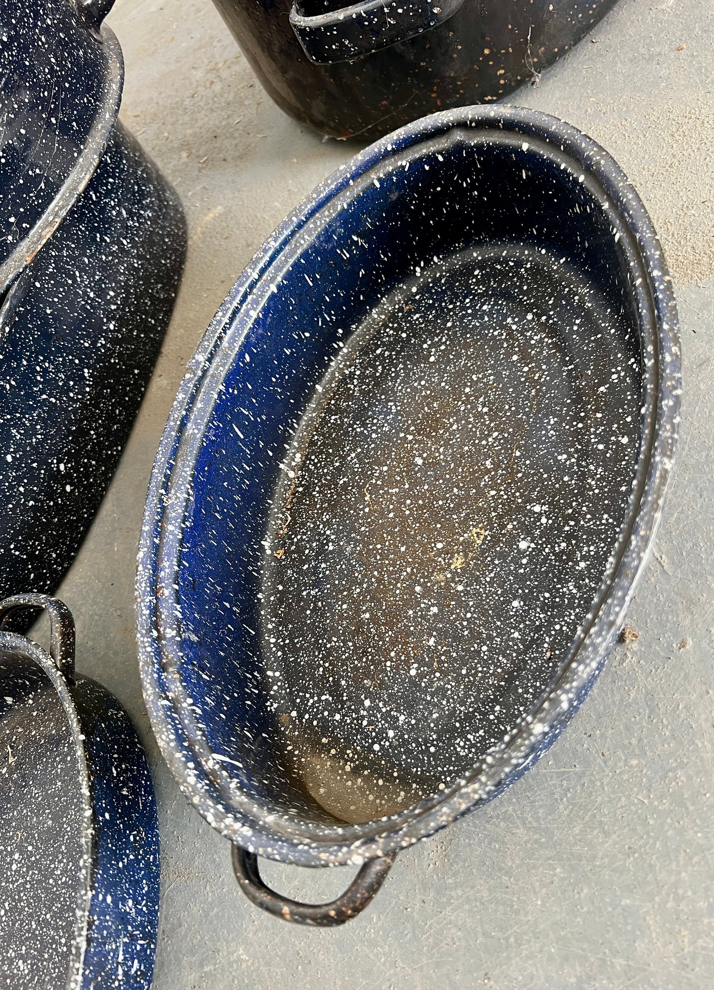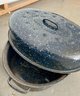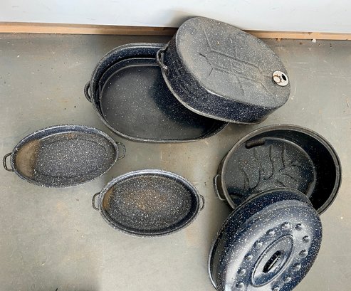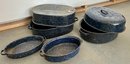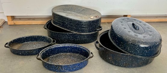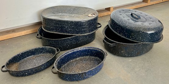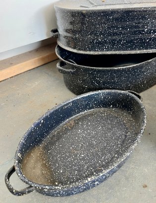 Vintage blue speckled enamel ware roasting pans. Some wear and discoloration are noted on the enamel surfaces.