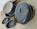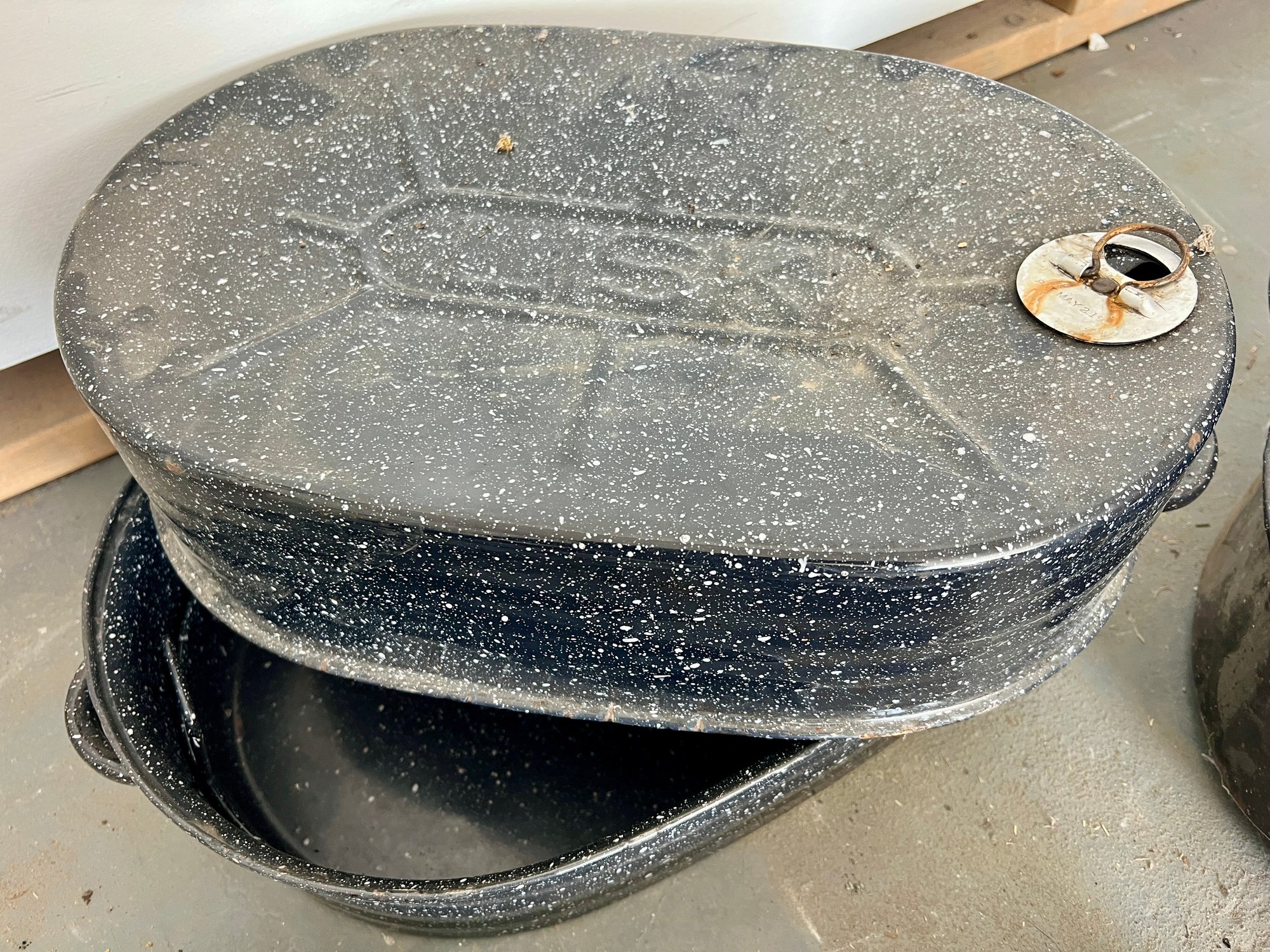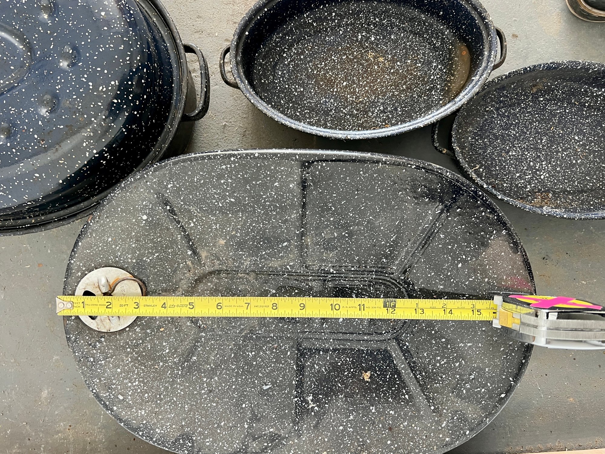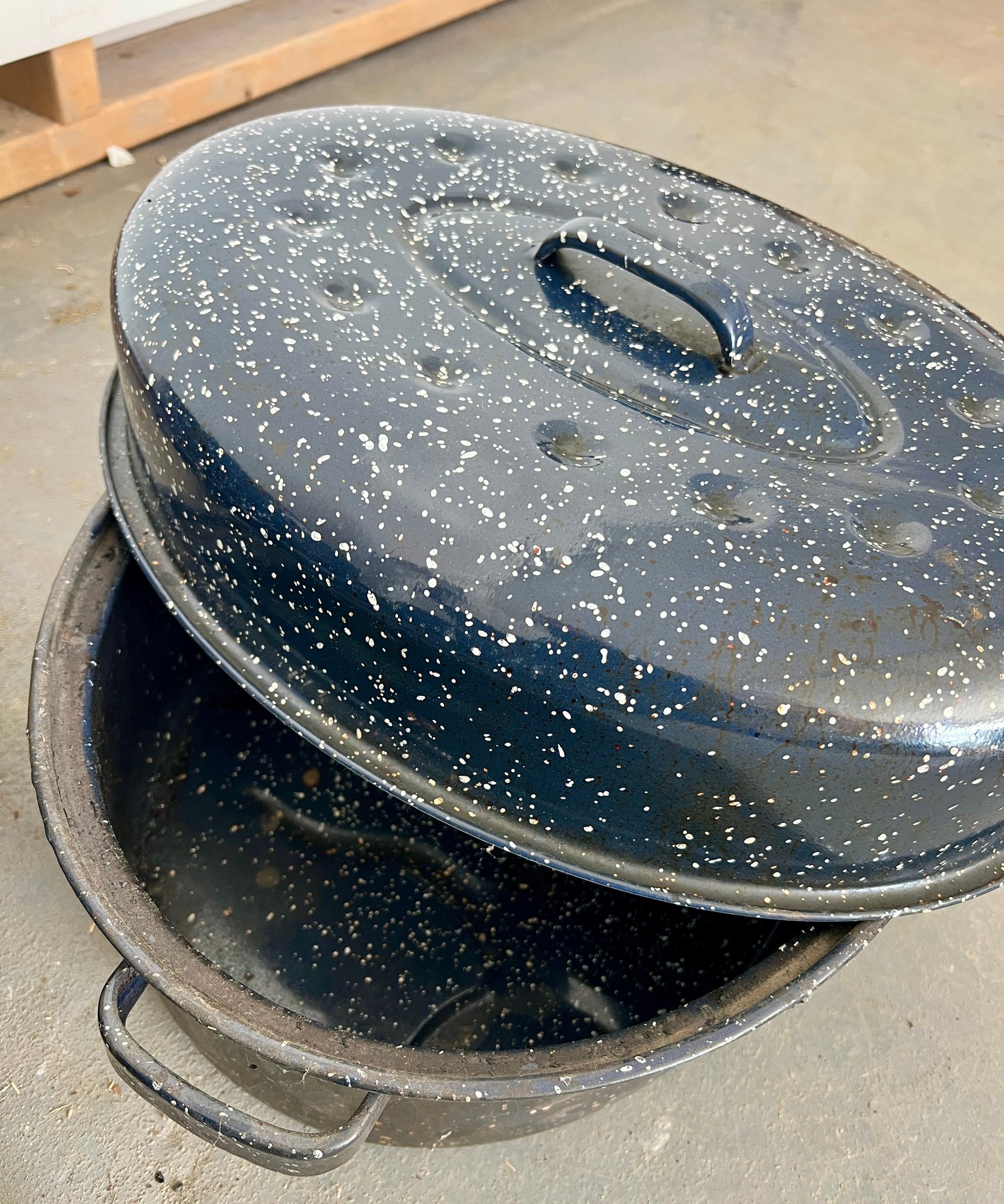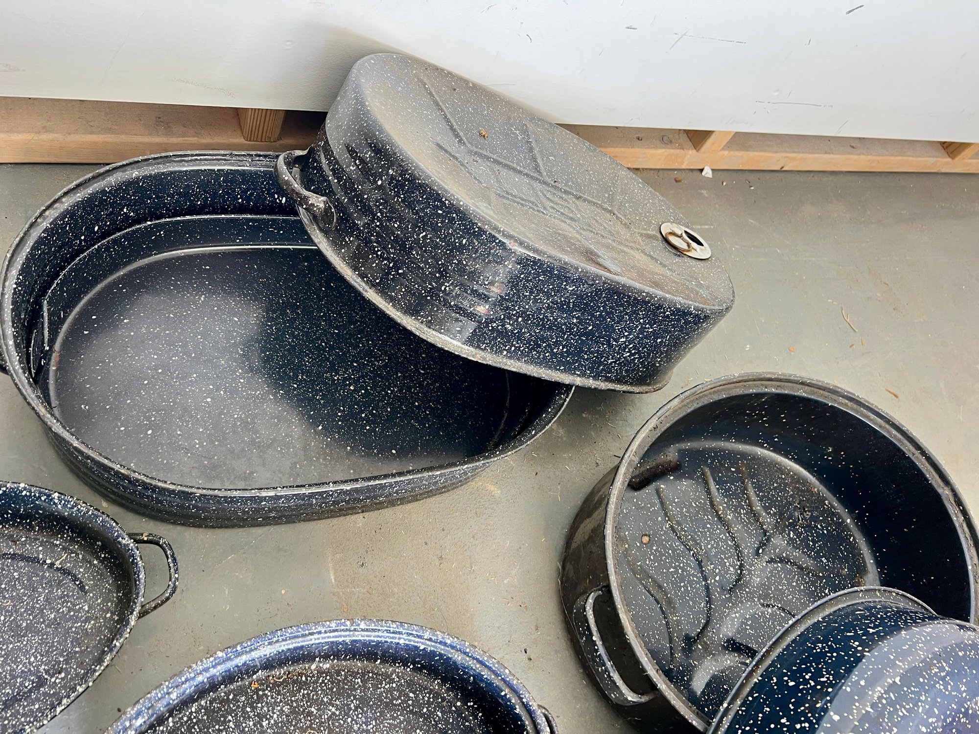 Vintage blue speckled enamel ware roasting pans. Some wear and discoloration are noted on the enamel surfaces.