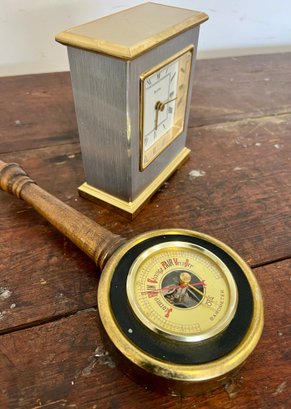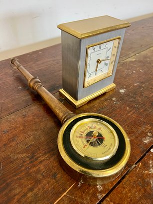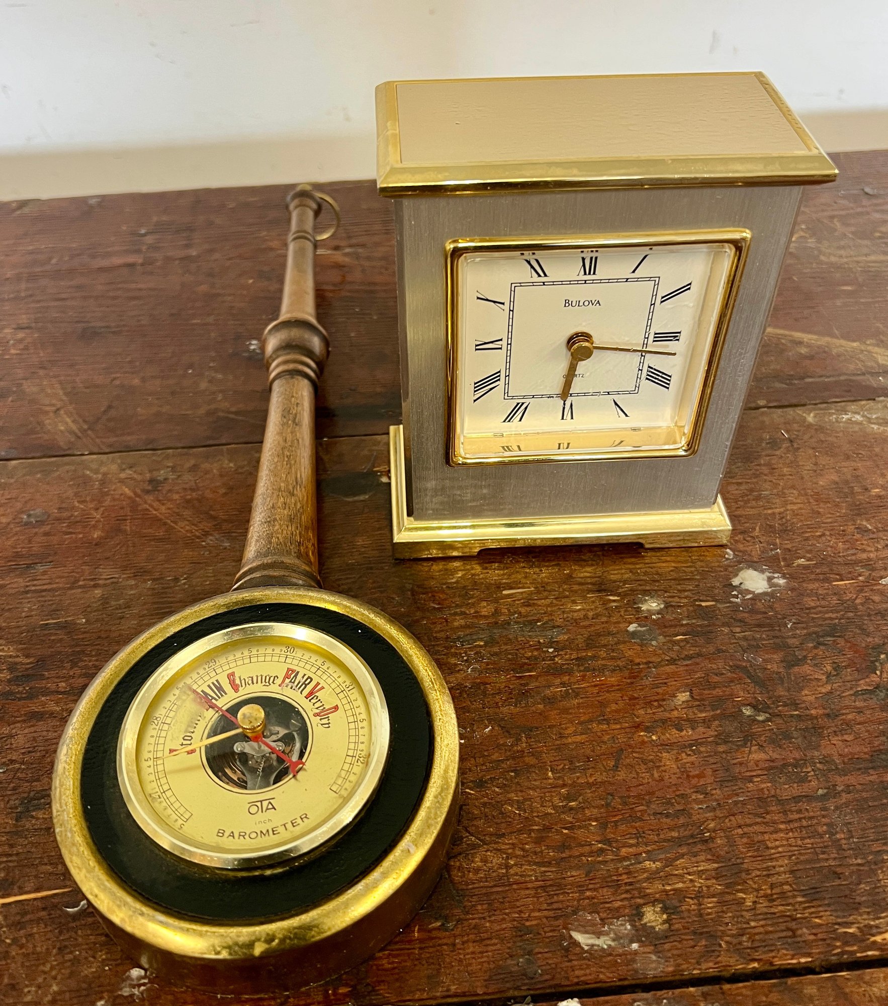 Vintage Bulova quartz clock and wooden OTA barometer. Full functionality of both is unknown.