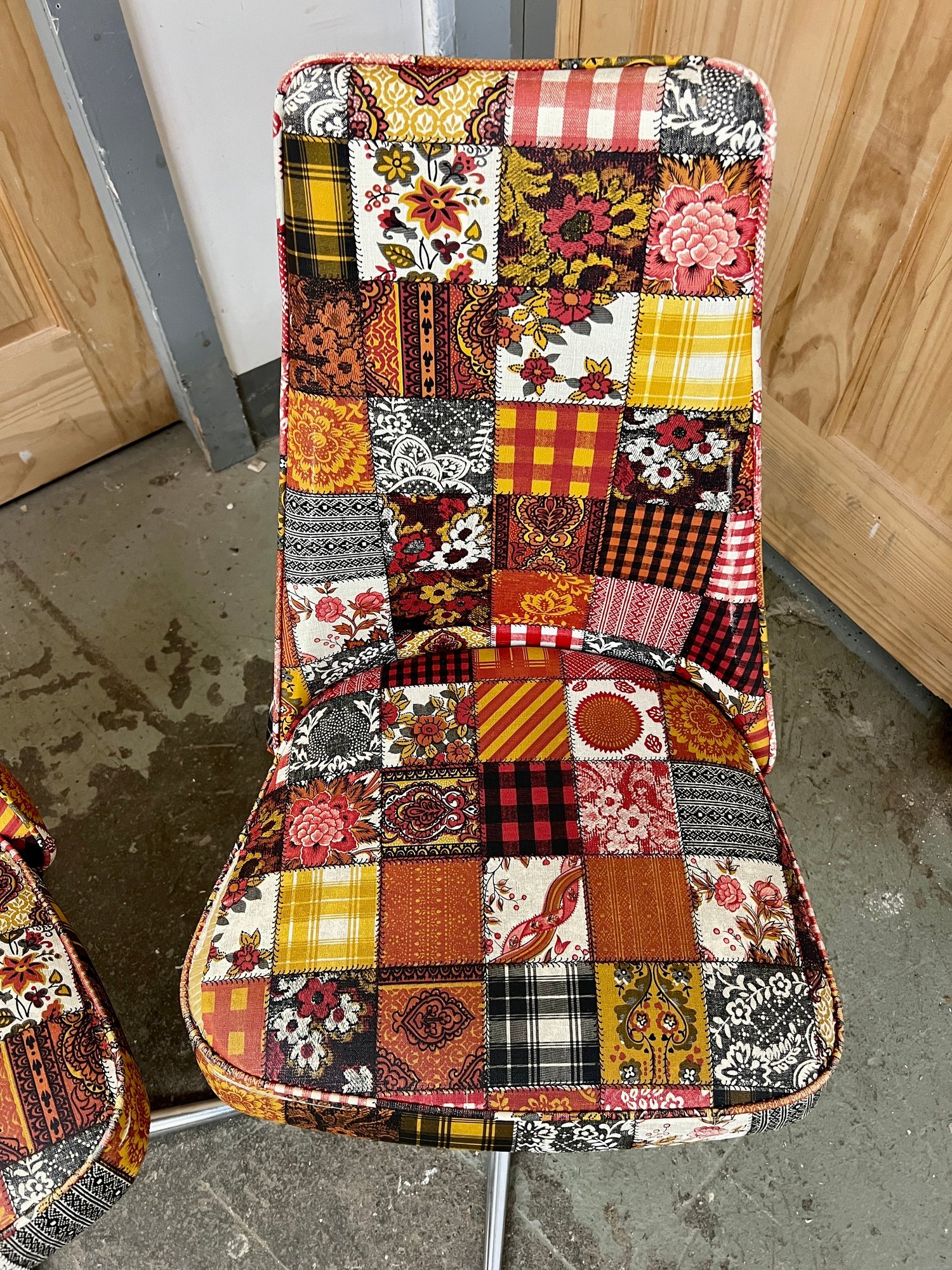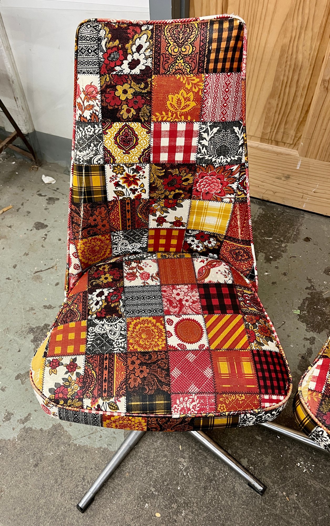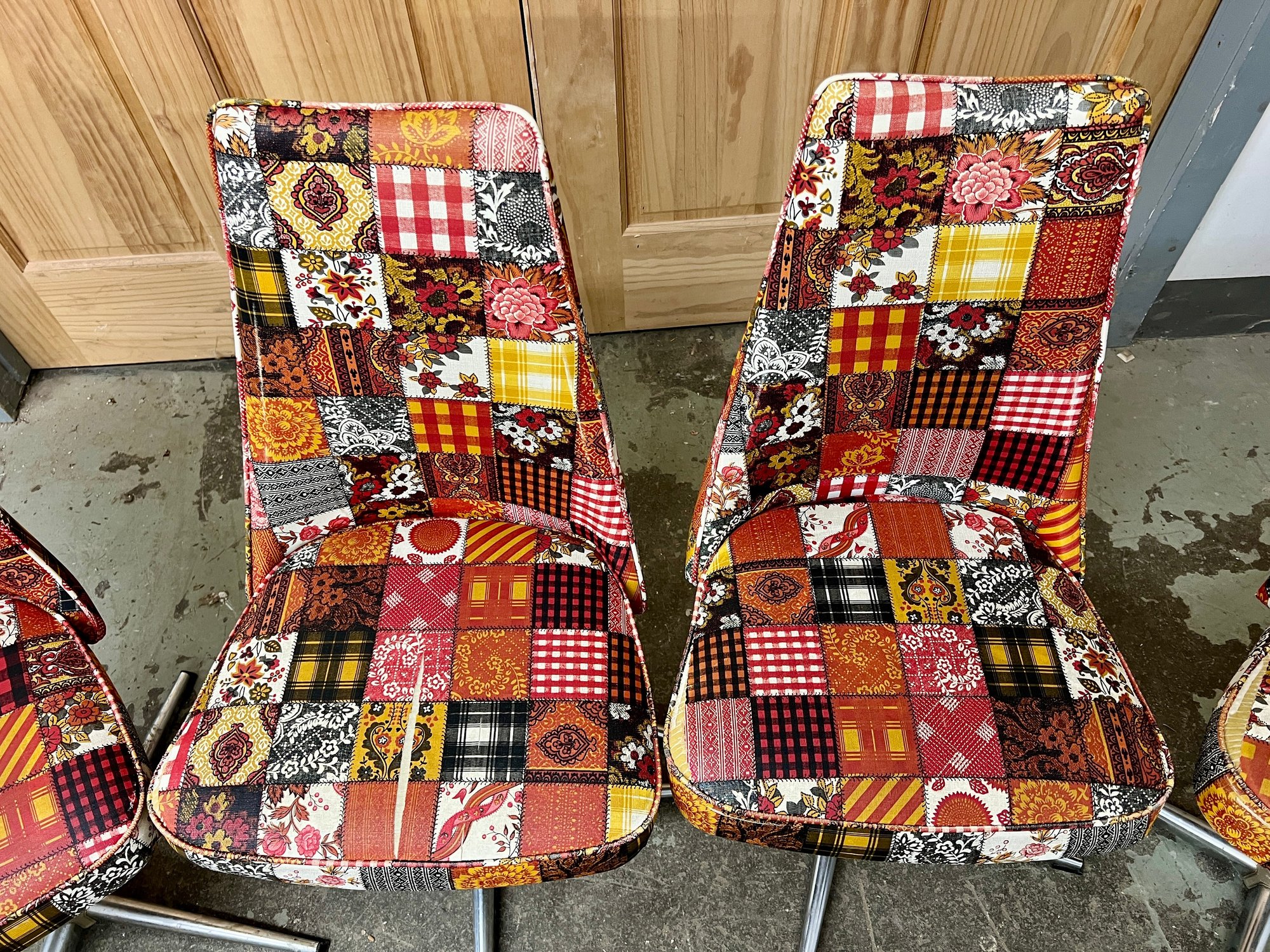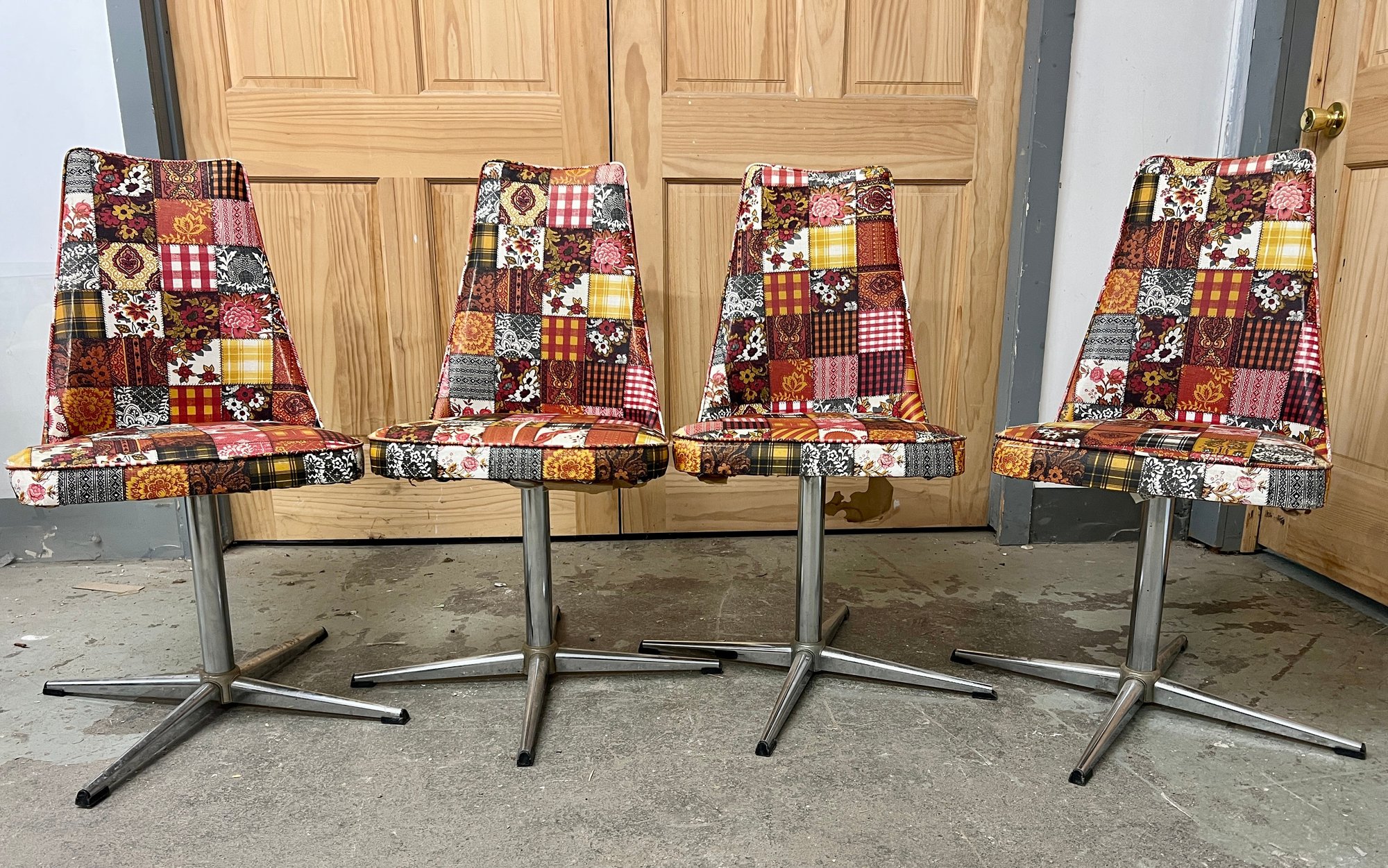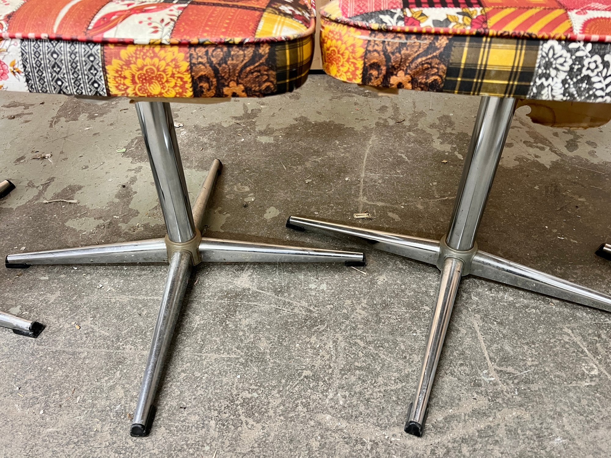 Vintage dining chairs with patchwork floral upholstery and chrome swivel base. The fabric has split on one chair, but there is a replacement seat that could be installed.