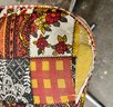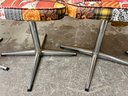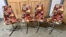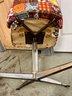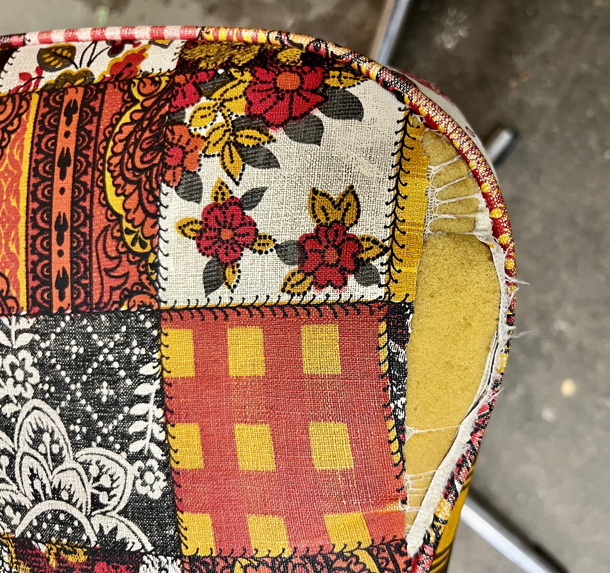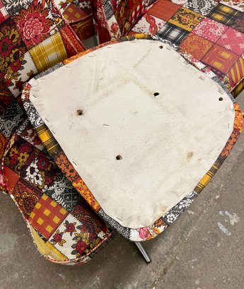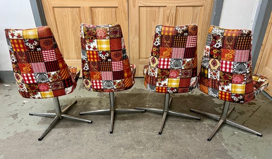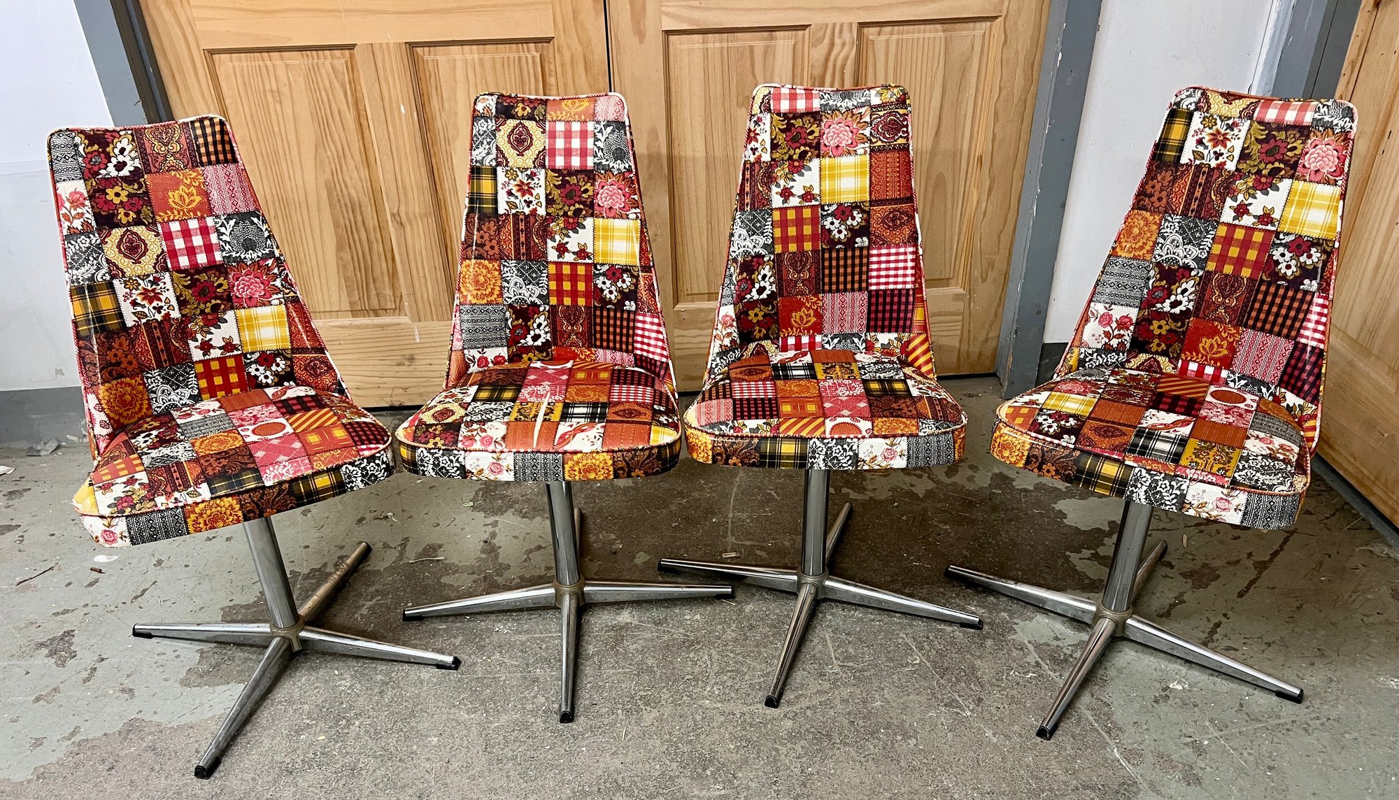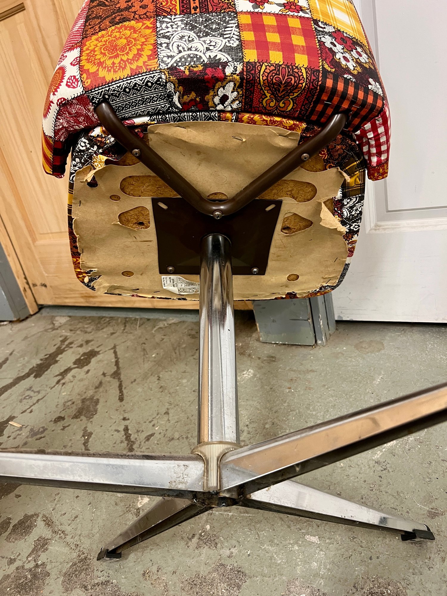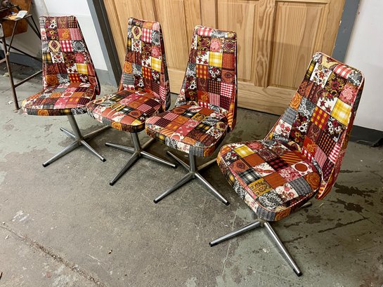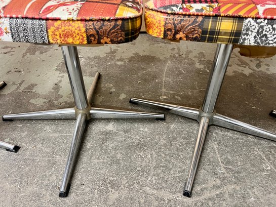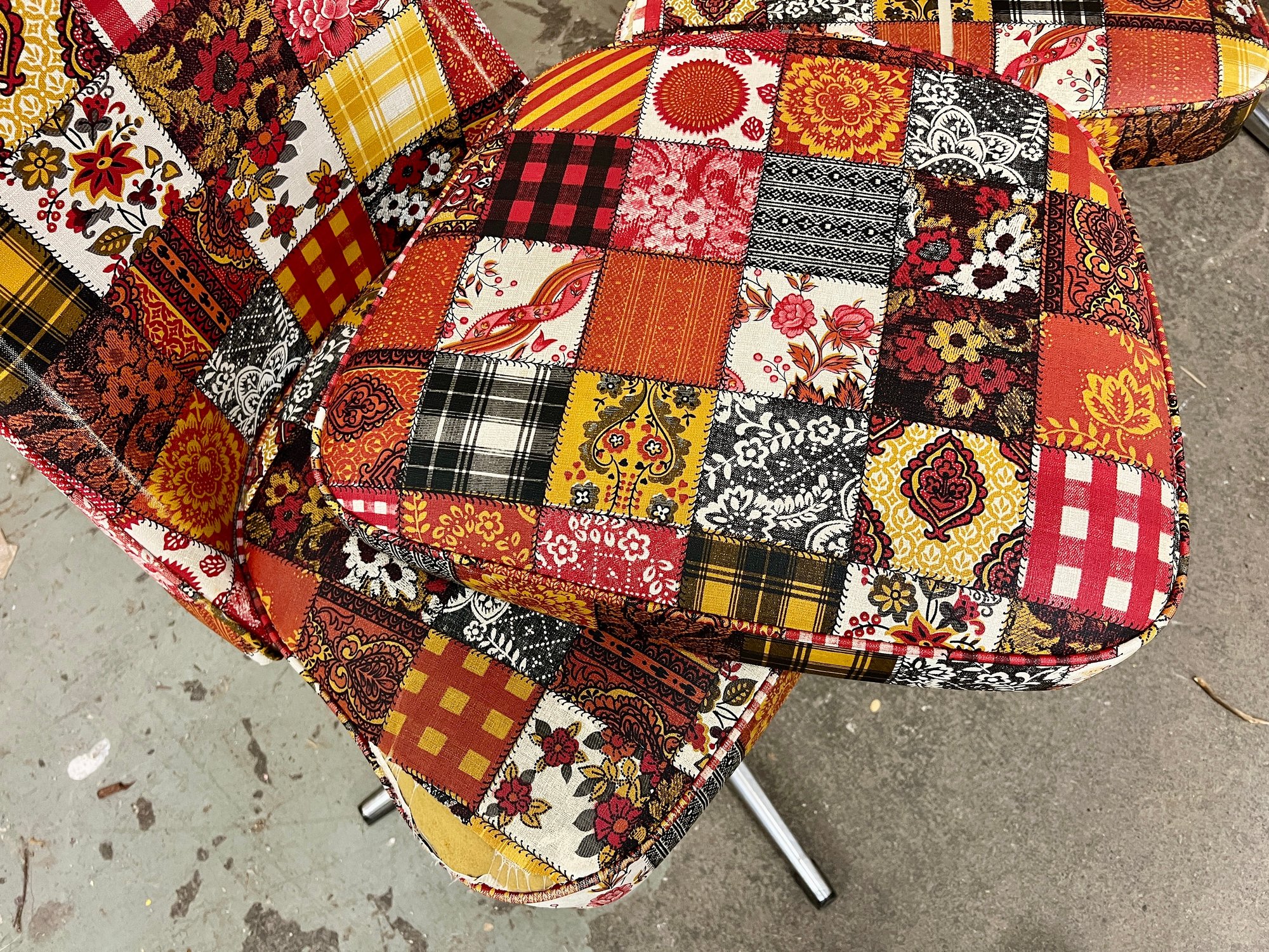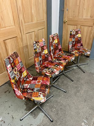 Vintage dining chairs with patchwork floral upholstery and chrome swivel base. The fabric has split on one chair, but there is a replacement seat that could be installed.