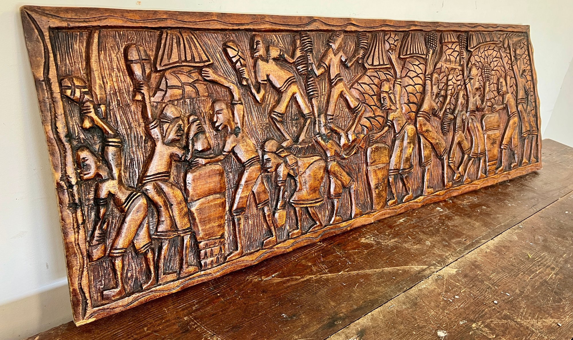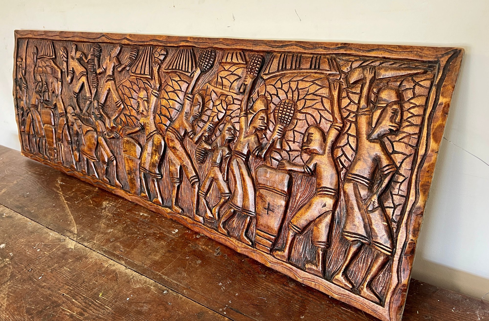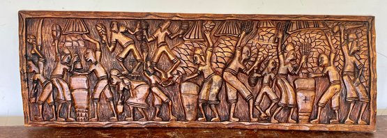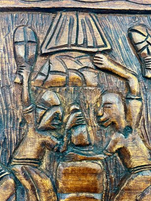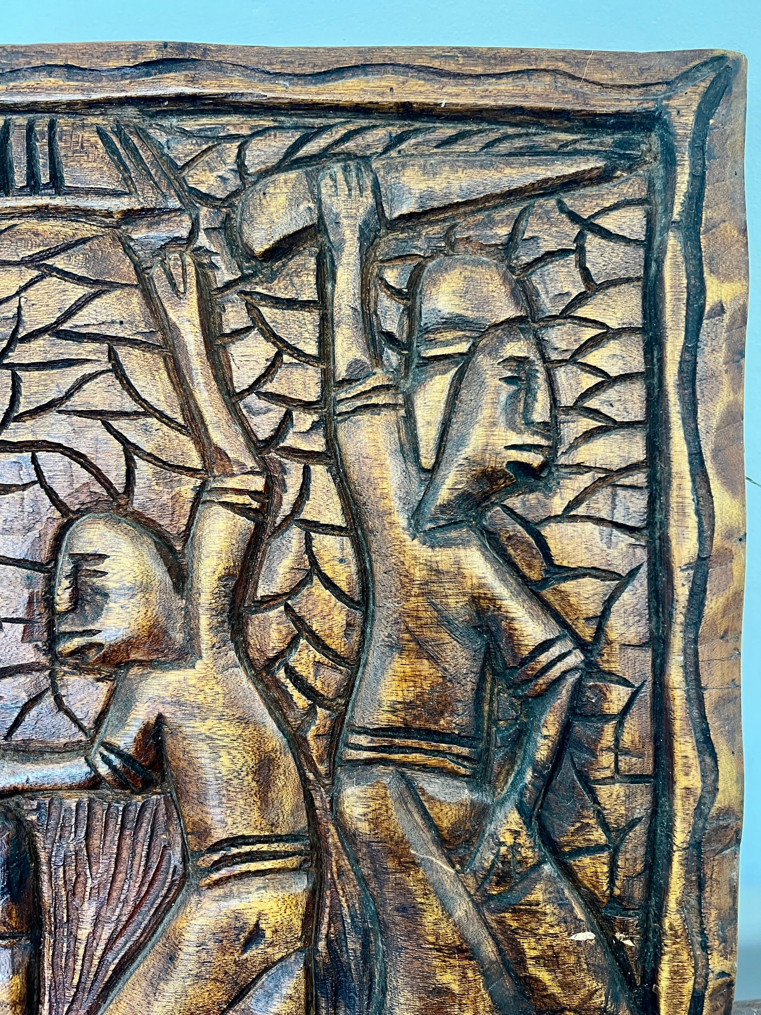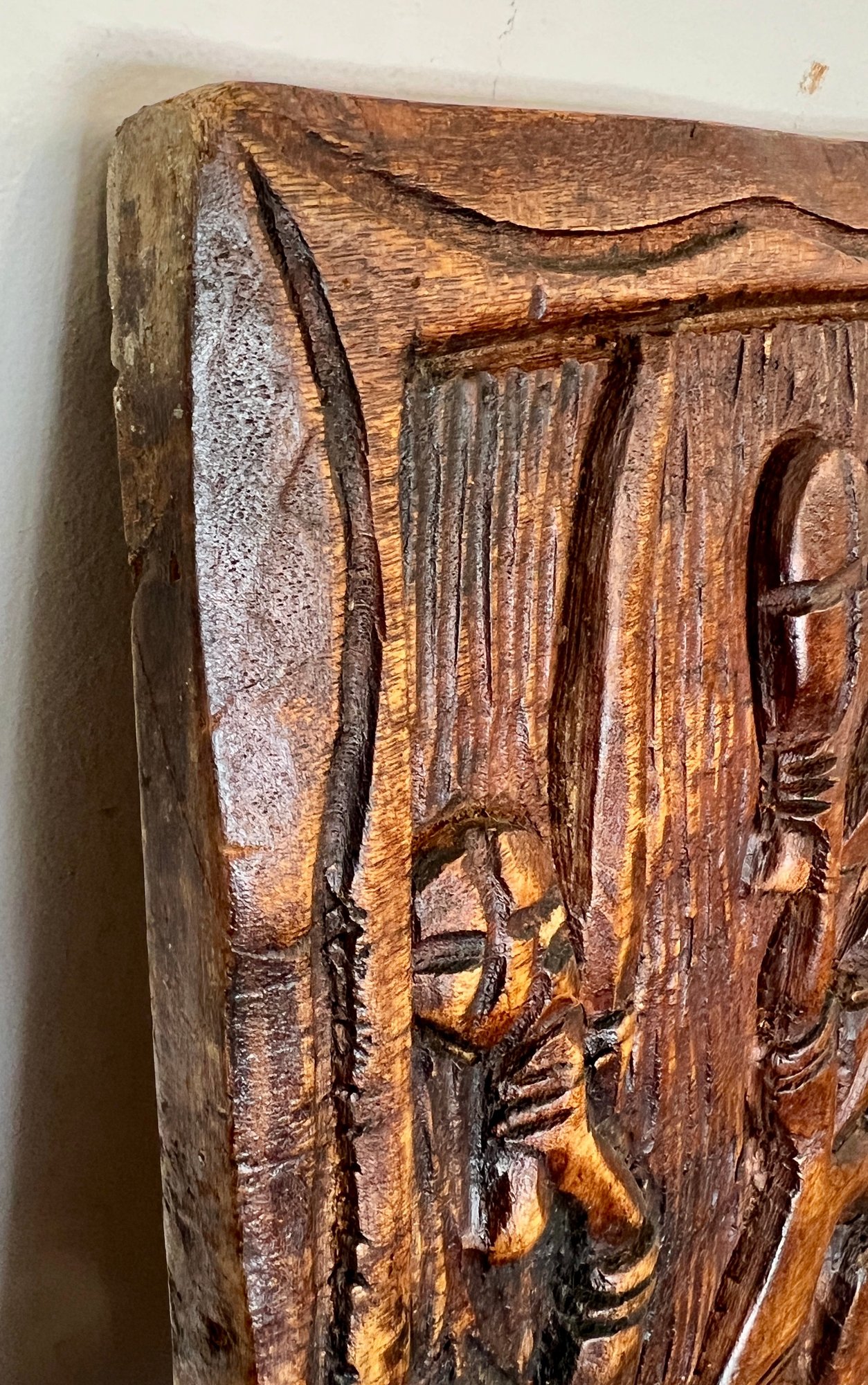 Vintage hand carved wooden relief panel. Panel is a bit warped and does not lay flat.