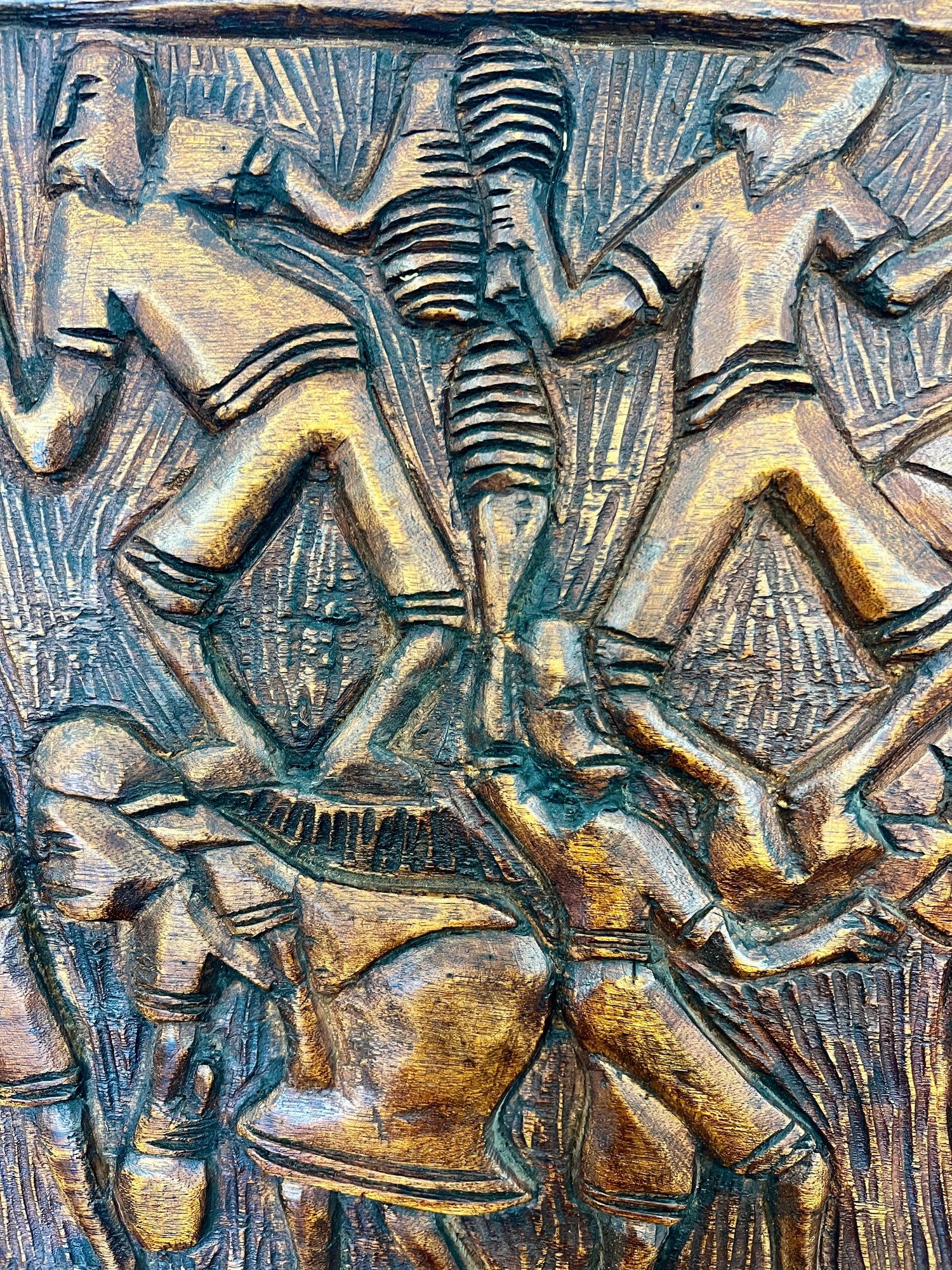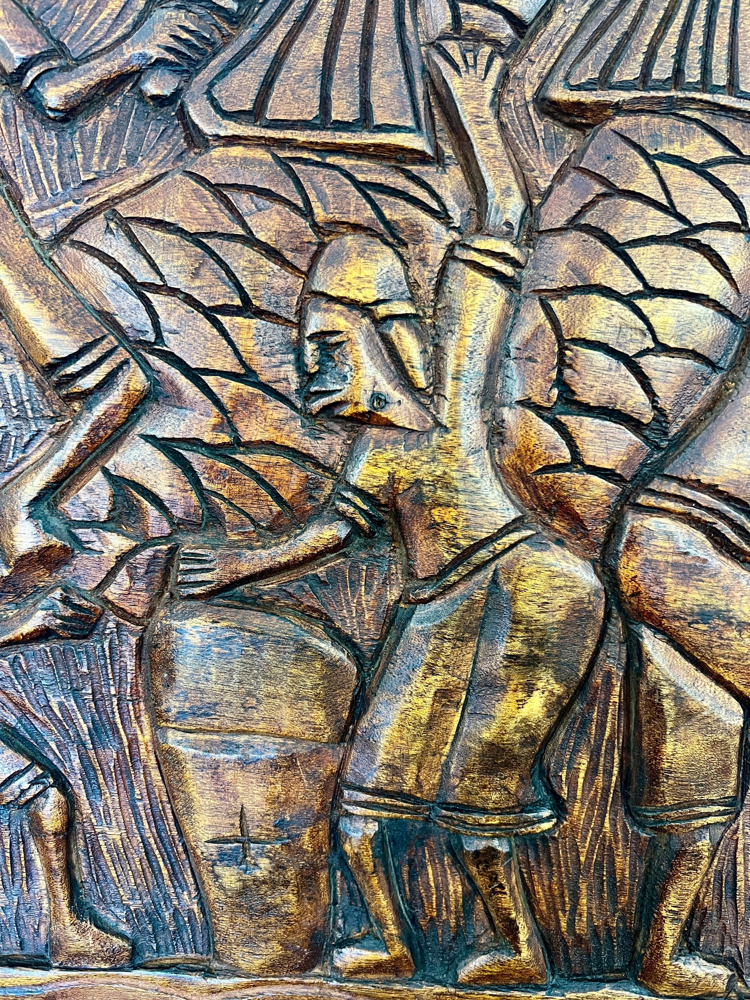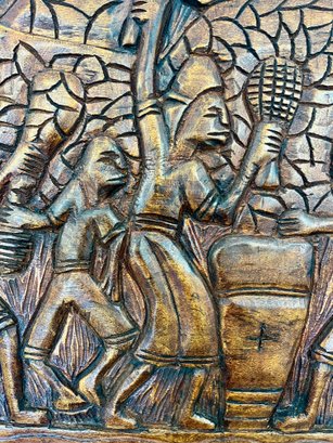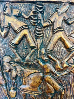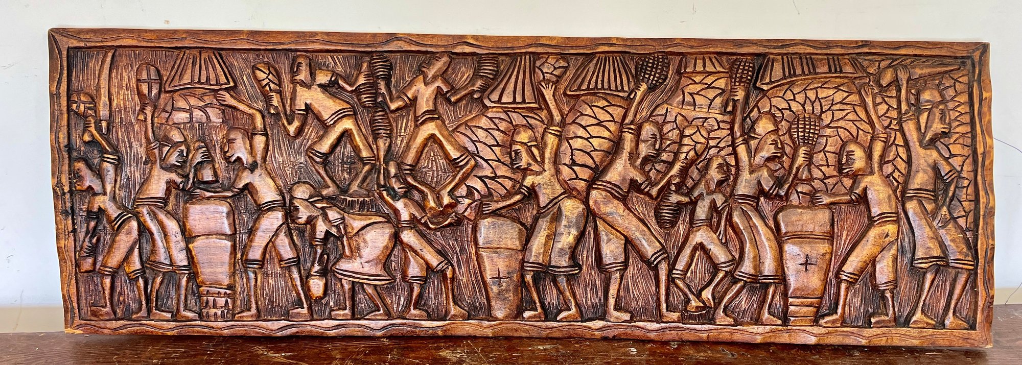 Vintage hand carved wooden relief panel. Panel is a bit warped and does not lay flat.