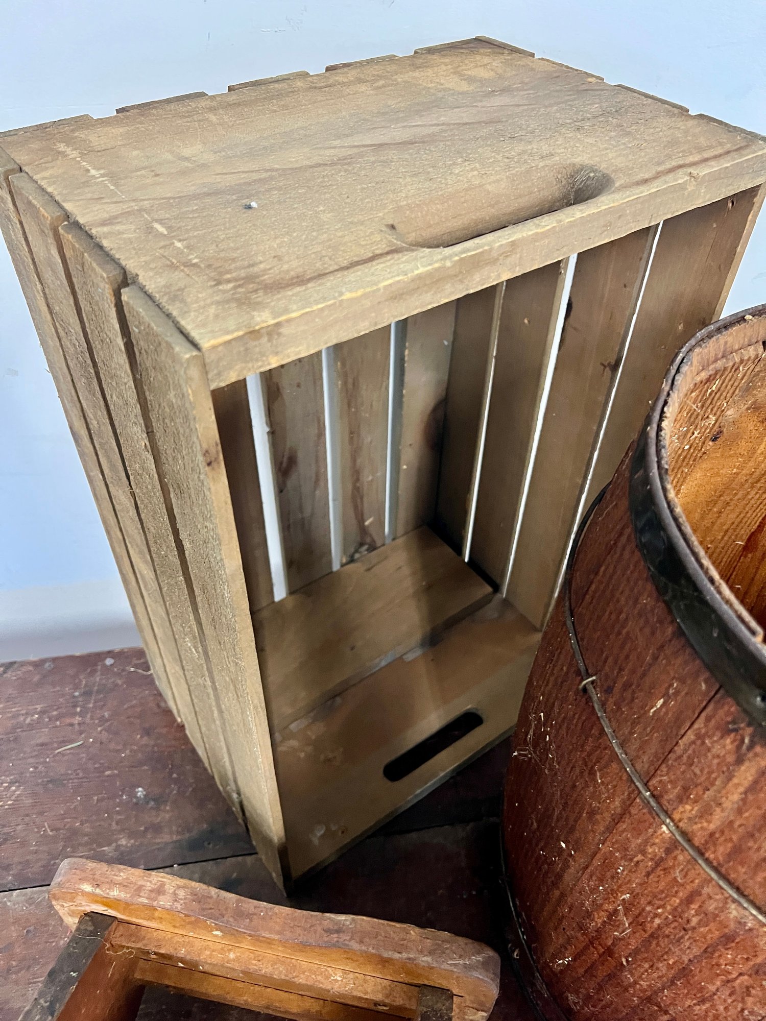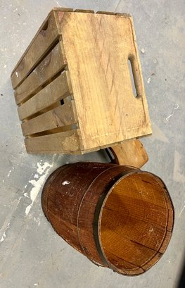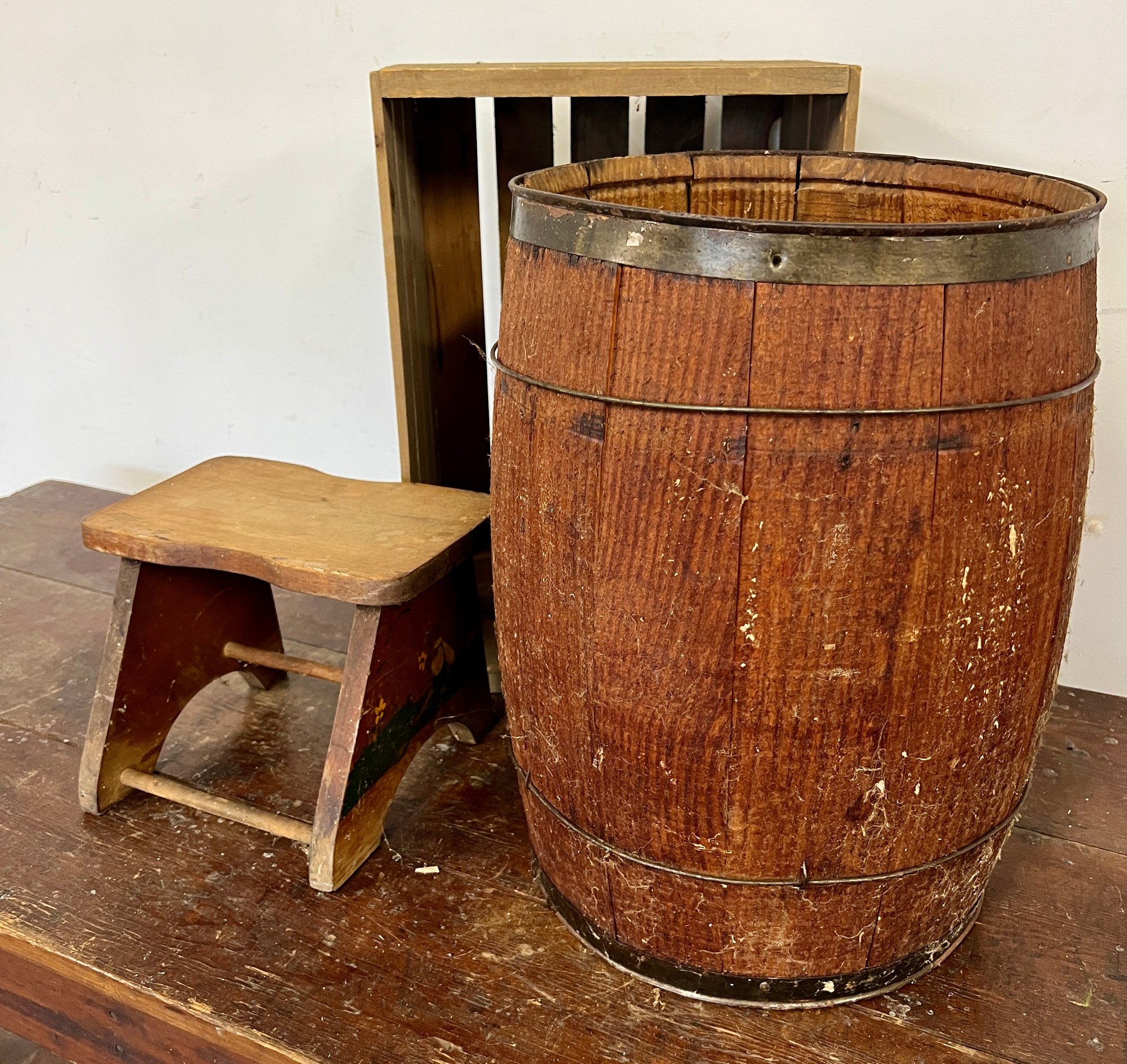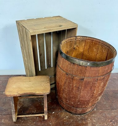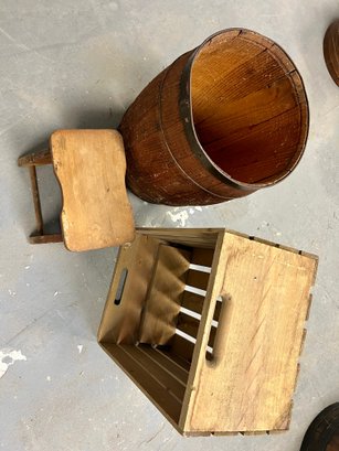 Vintage wooden stool, barrel, and crate. Stool has decorative painting on the sides.