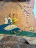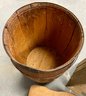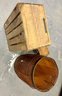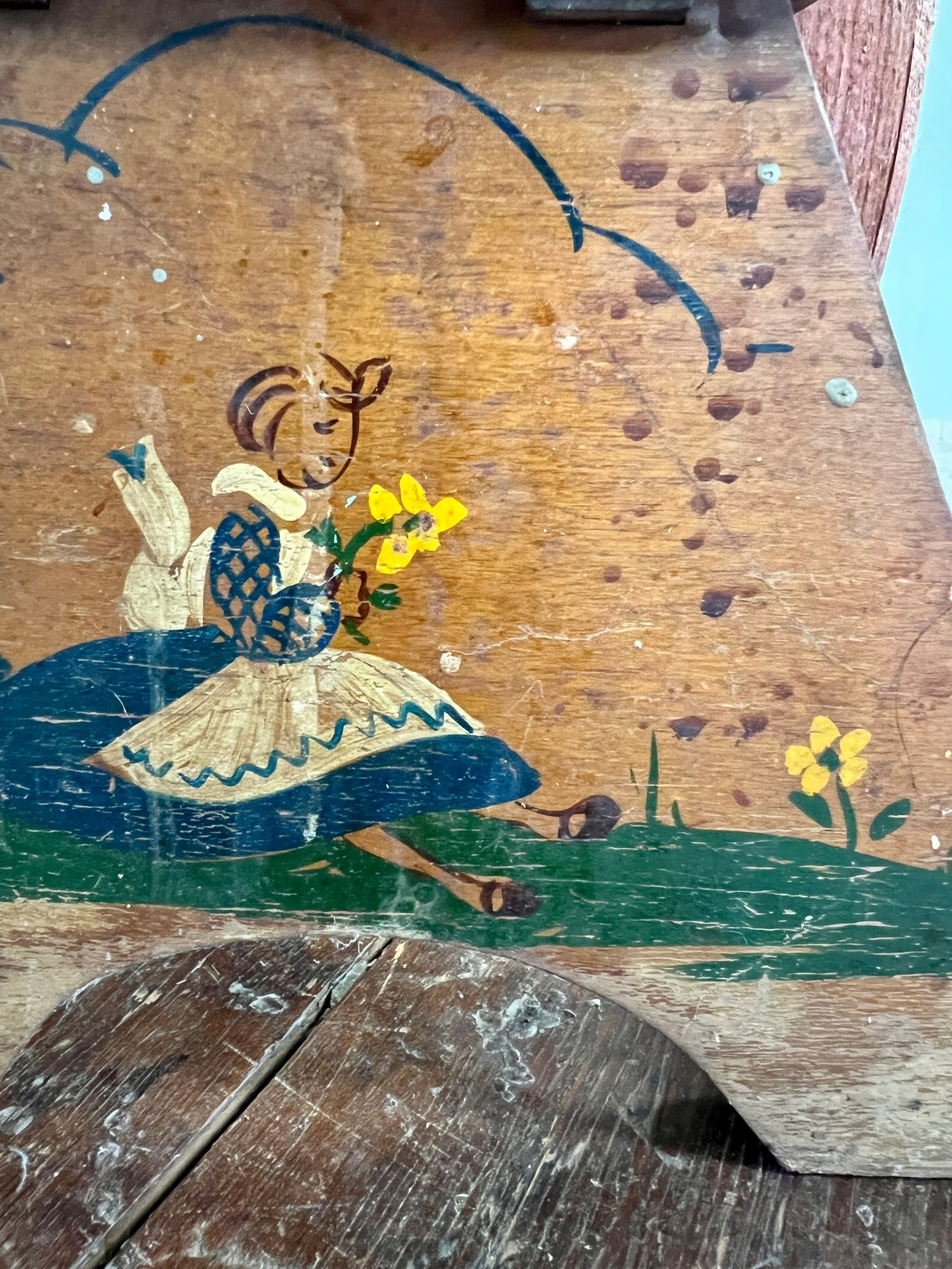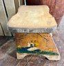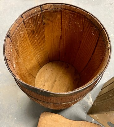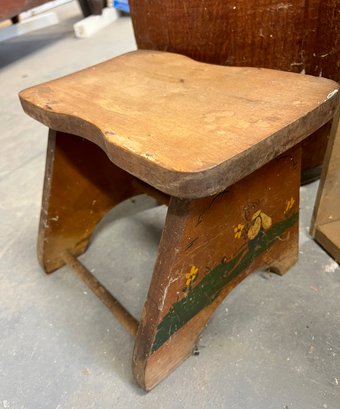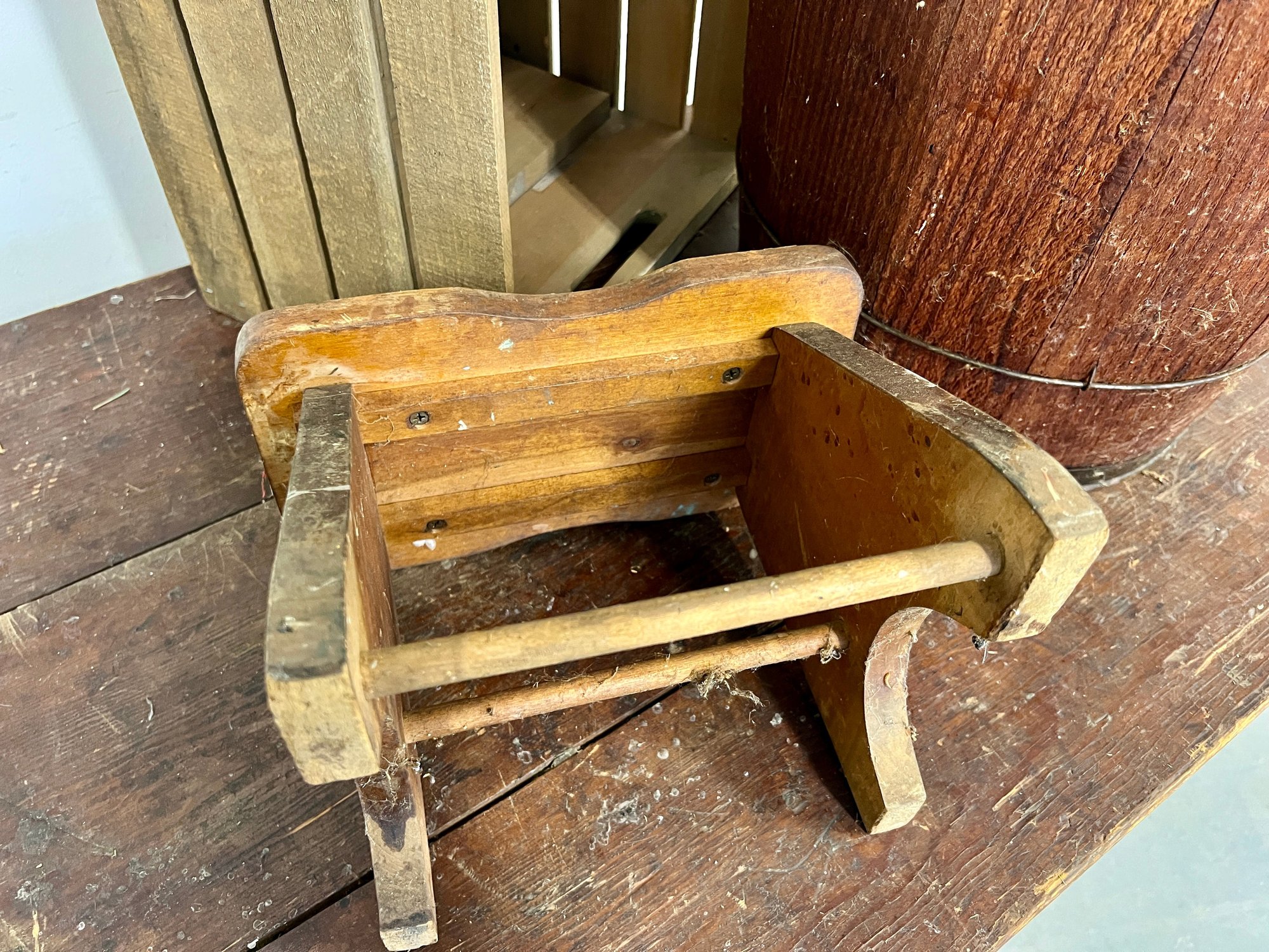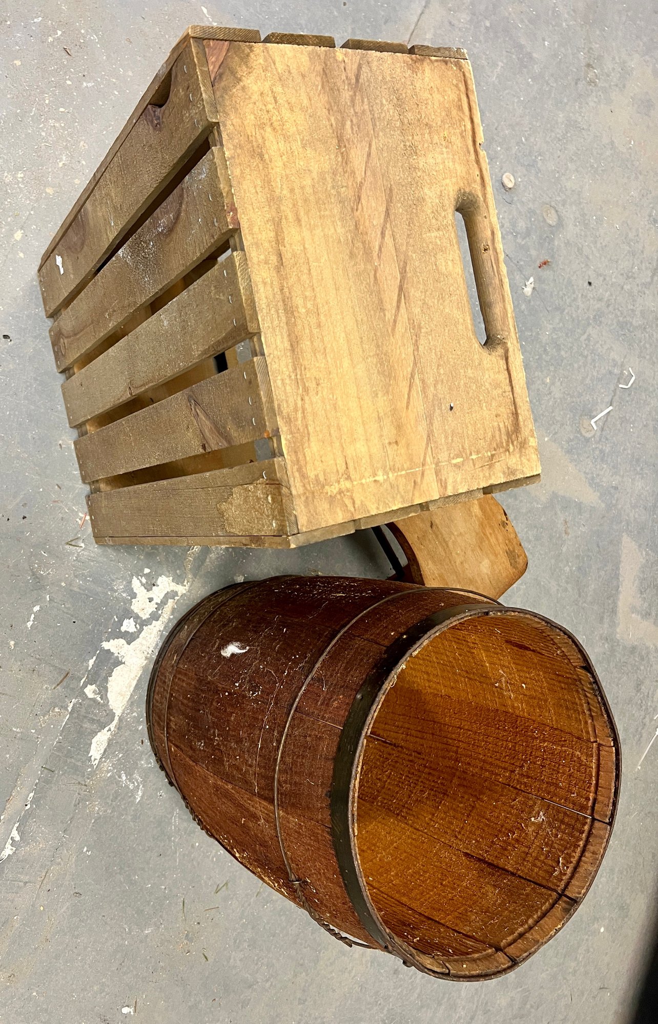 Vintage wooden stool, barrel, and crate. Stool has decorative painting on the sides.