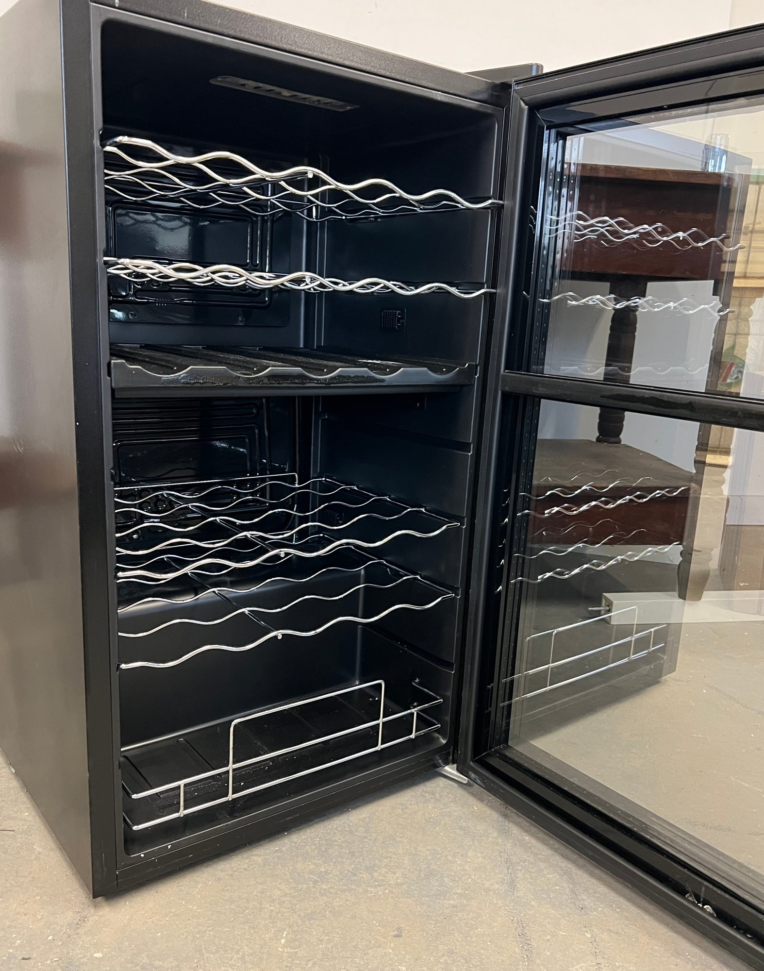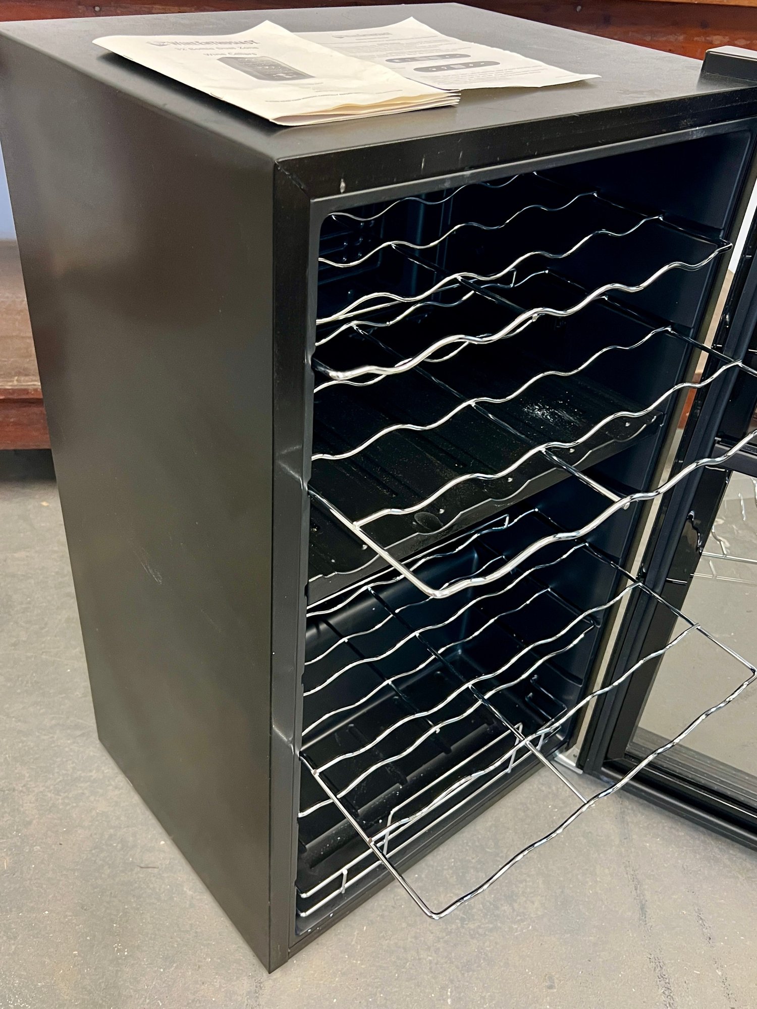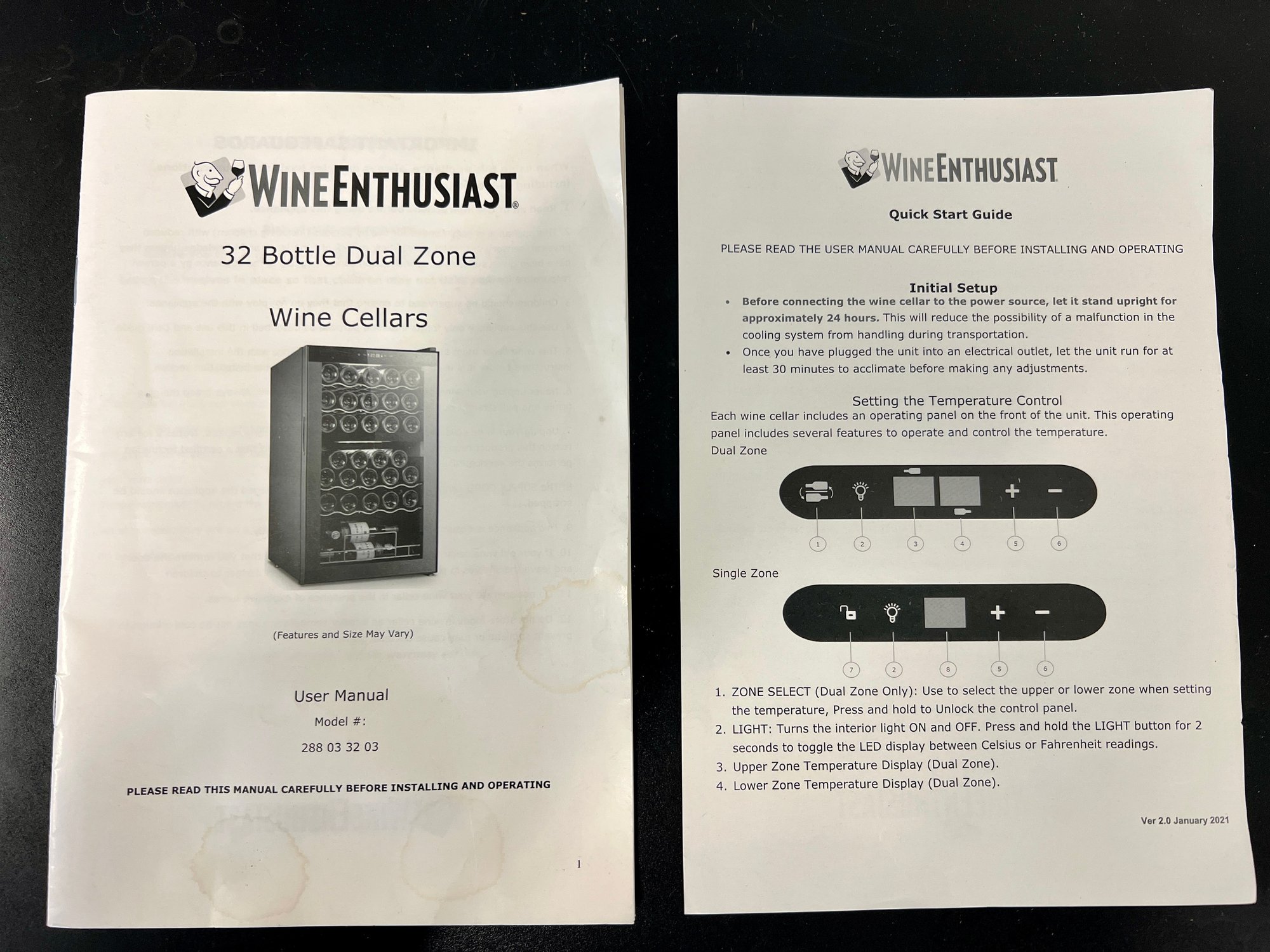 Wine Enthusiast 32 bottle dual zone wine cooler. Lights up when plugged in.