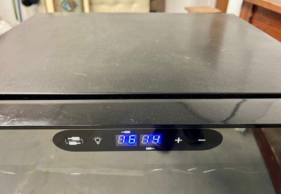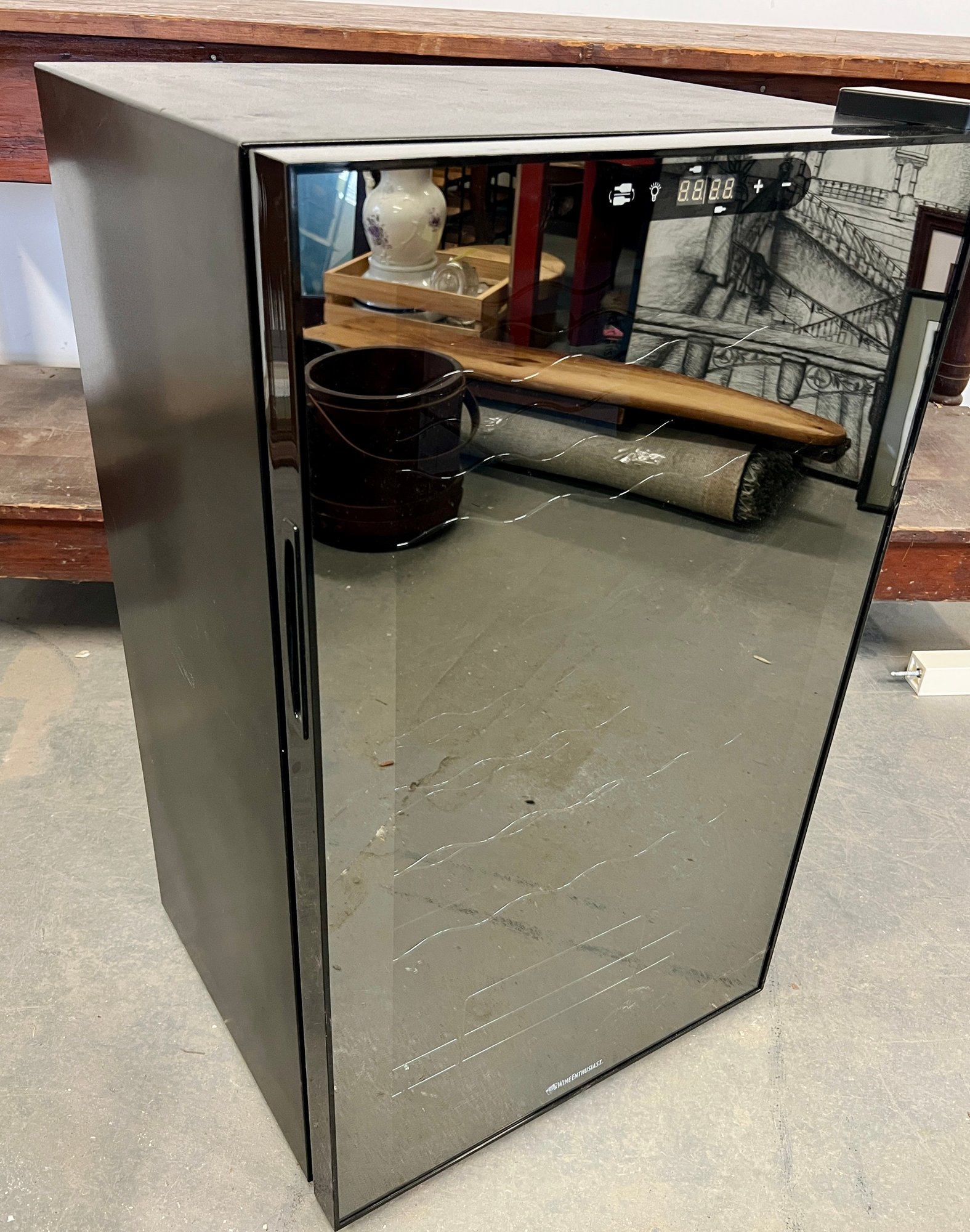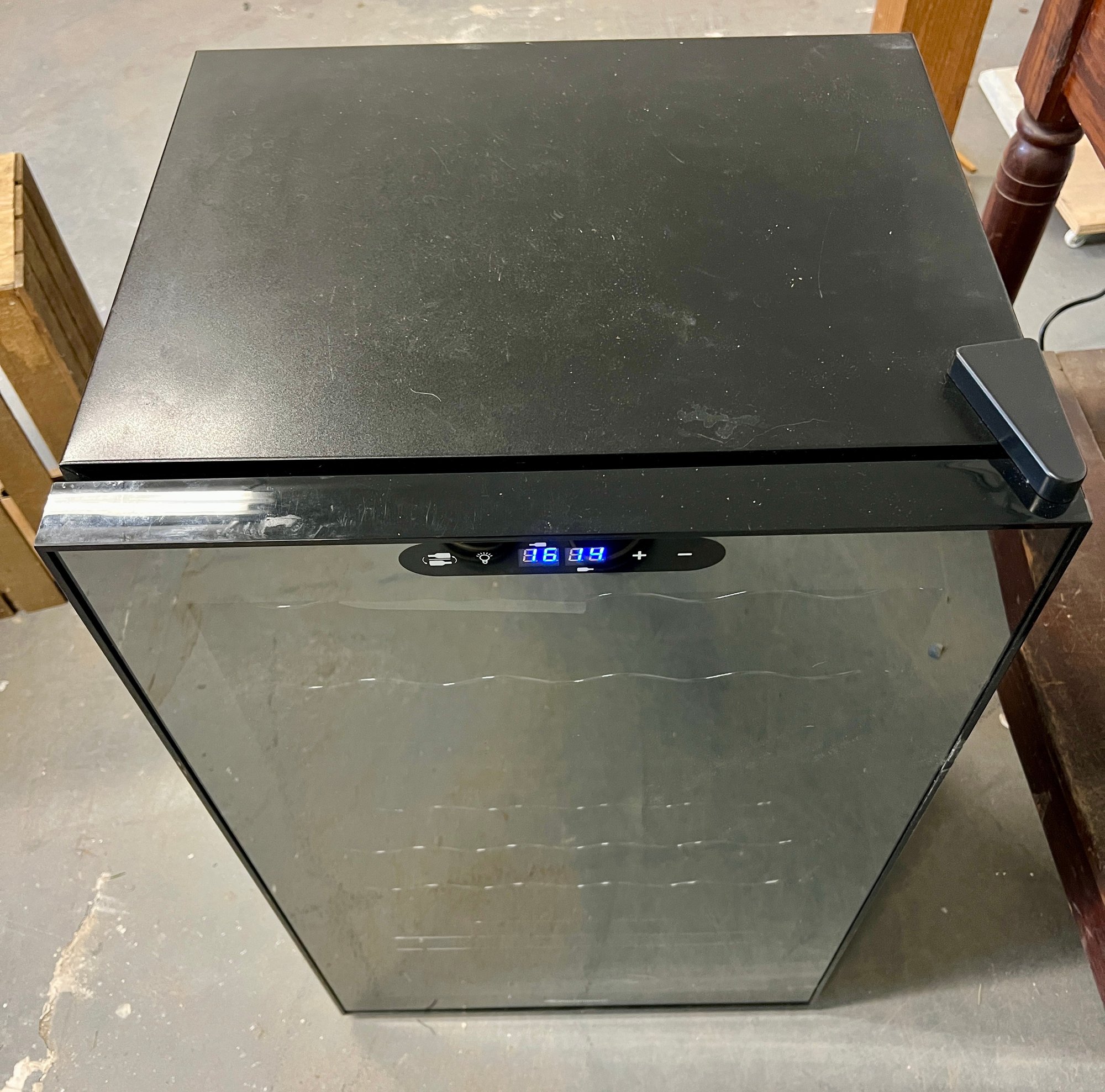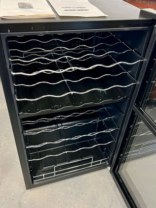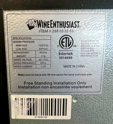 Wine Enthusiast 32 bottle dual zone wine cooler. Lights up when plugged in.