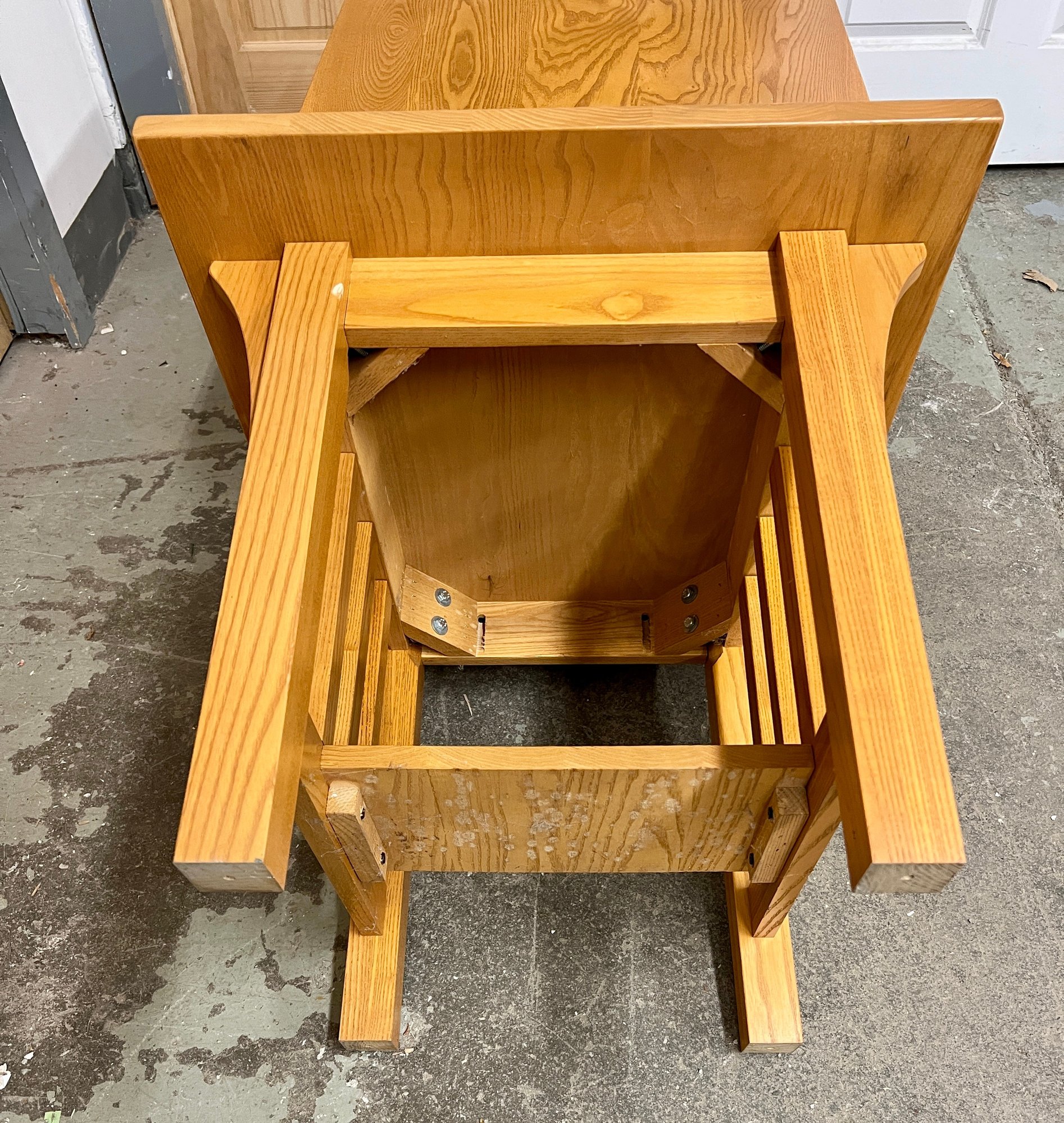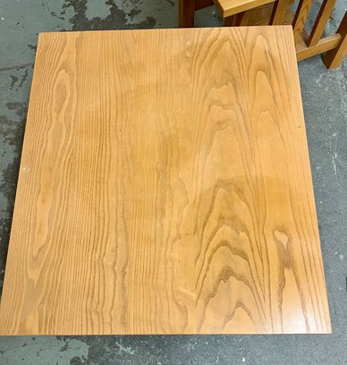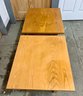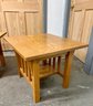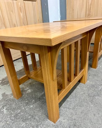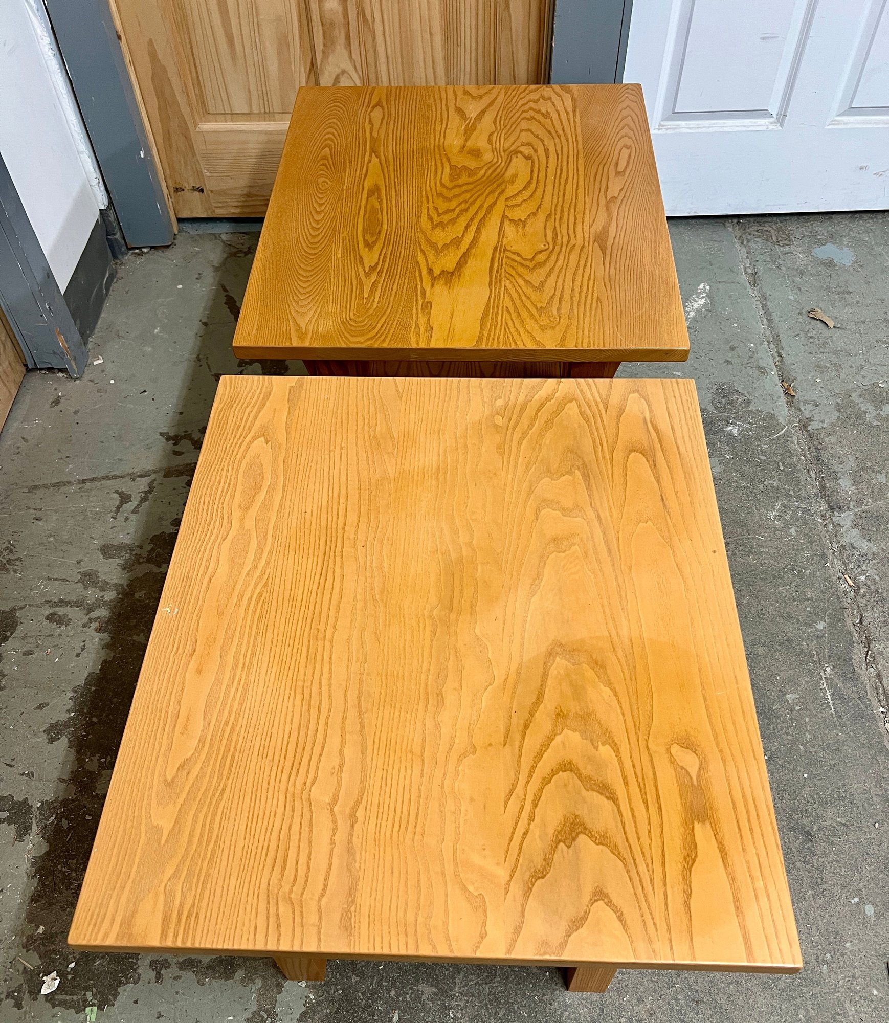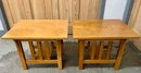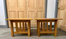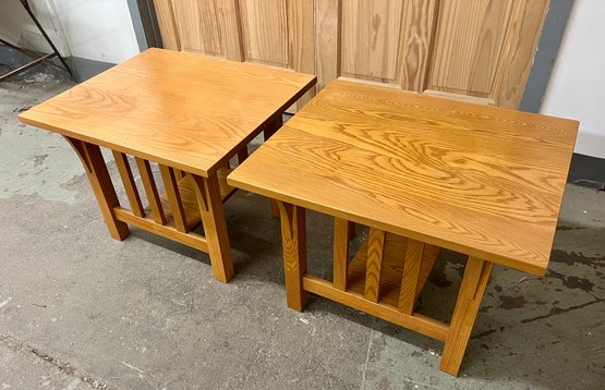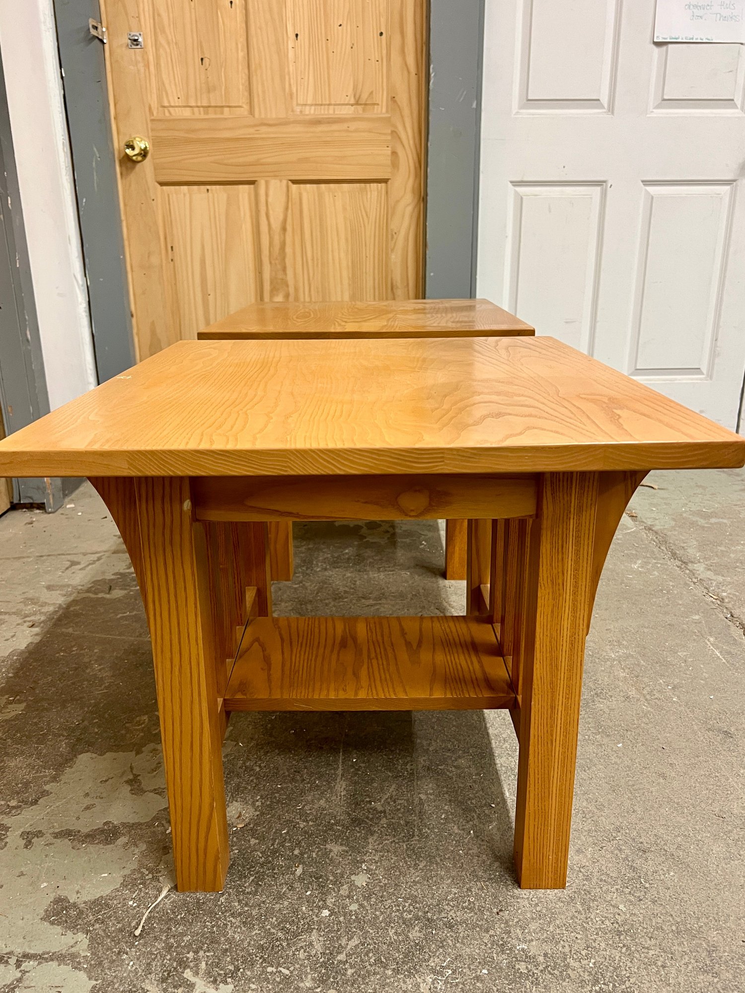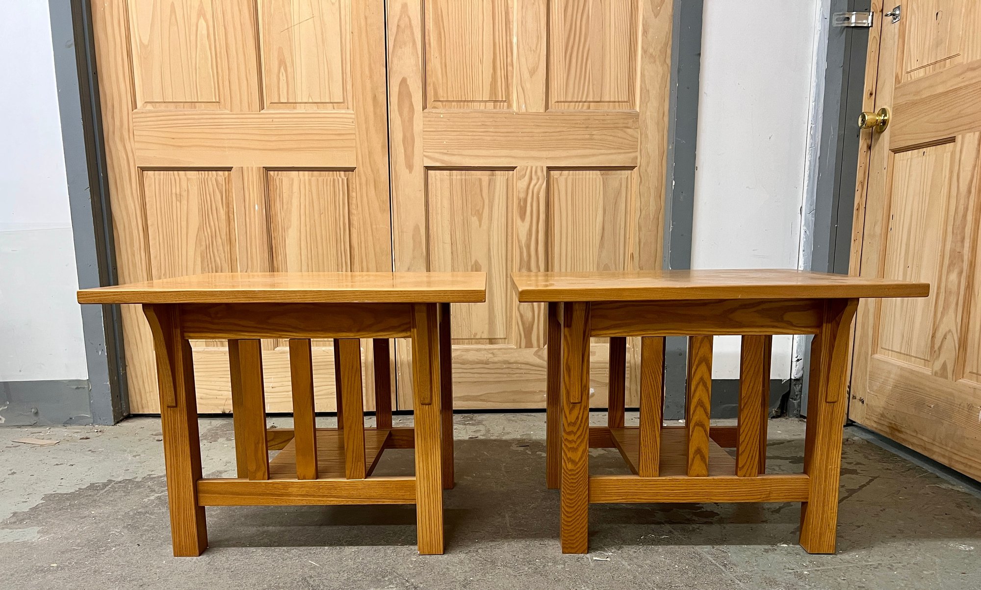 Wooden end tables in mission style. These tables are very solid and rather heavy. There are circular fade spots on the top surface of one table.