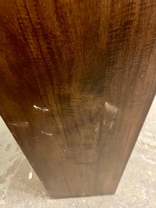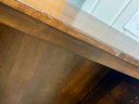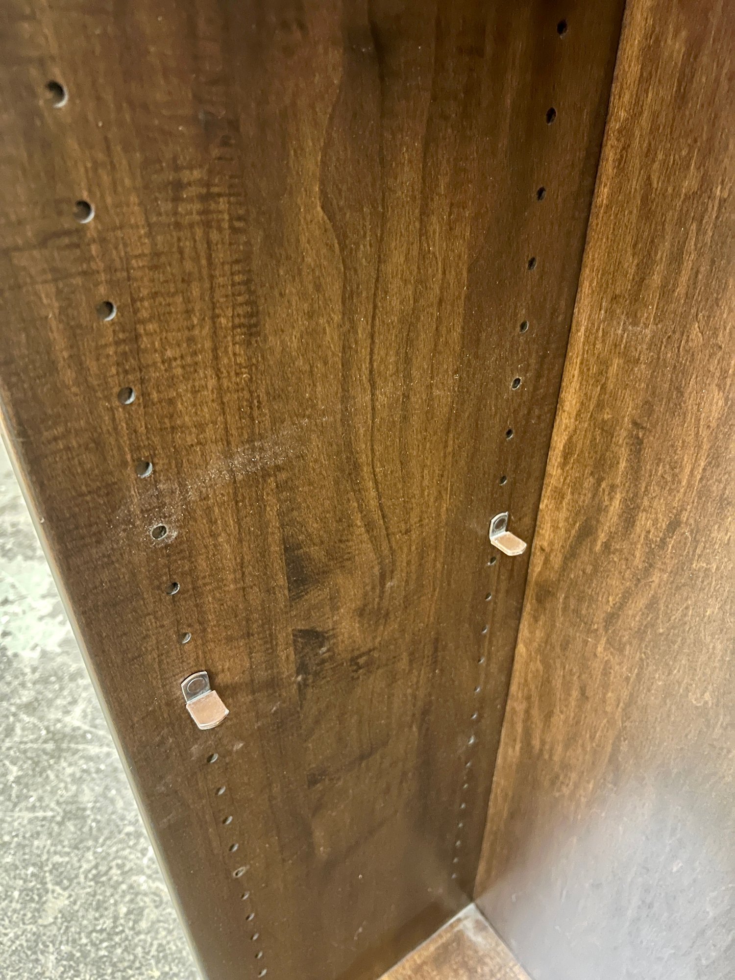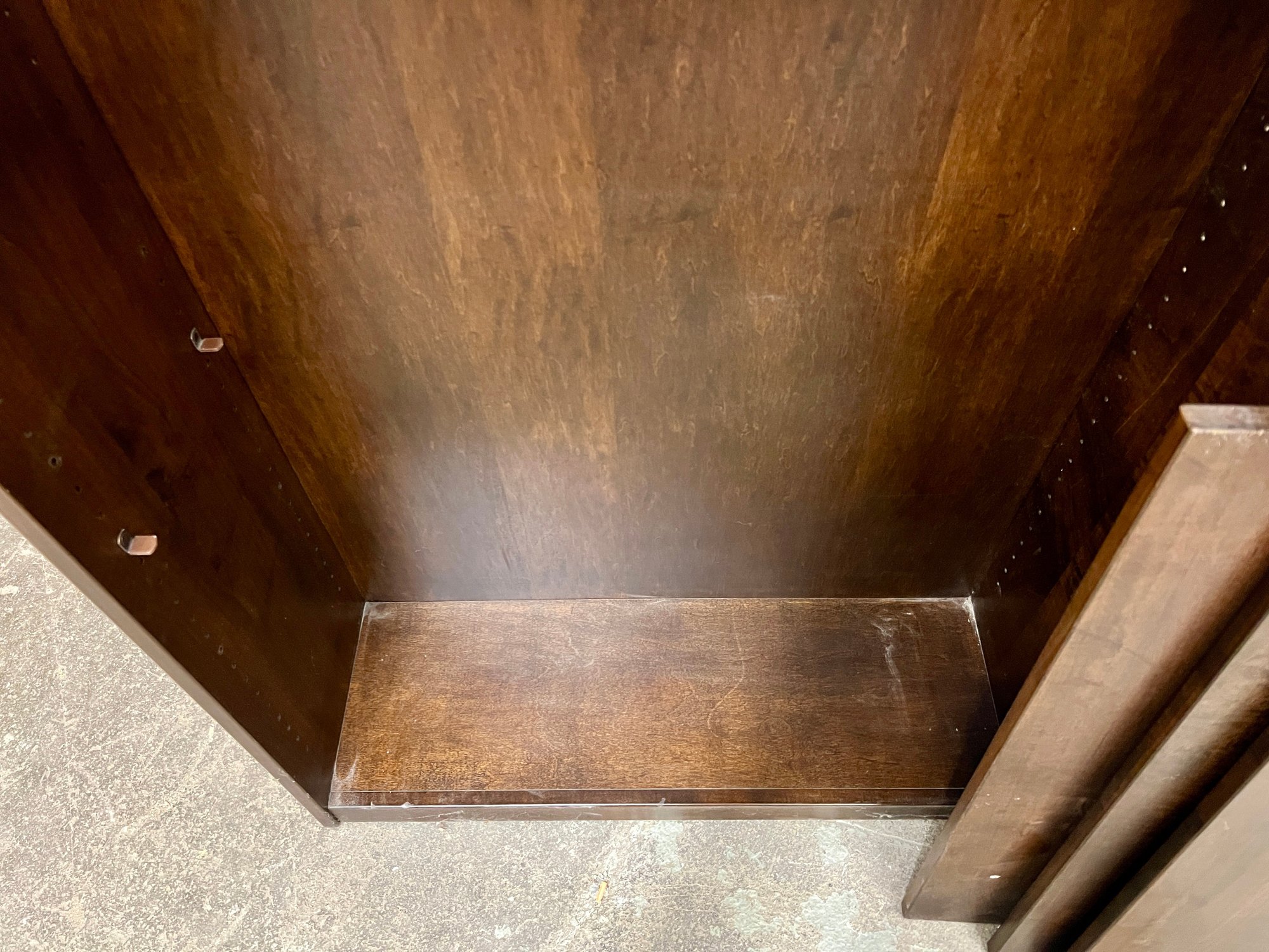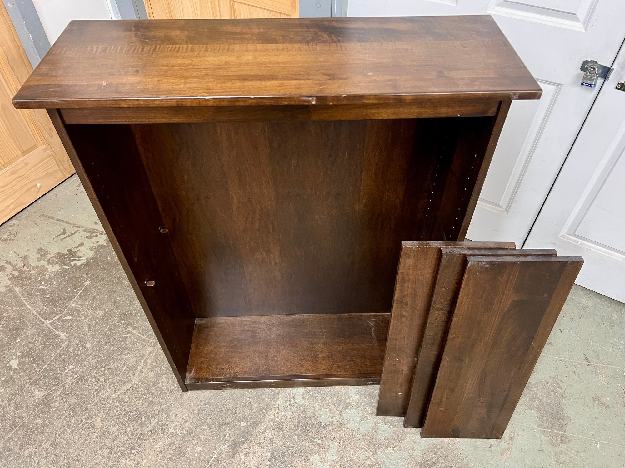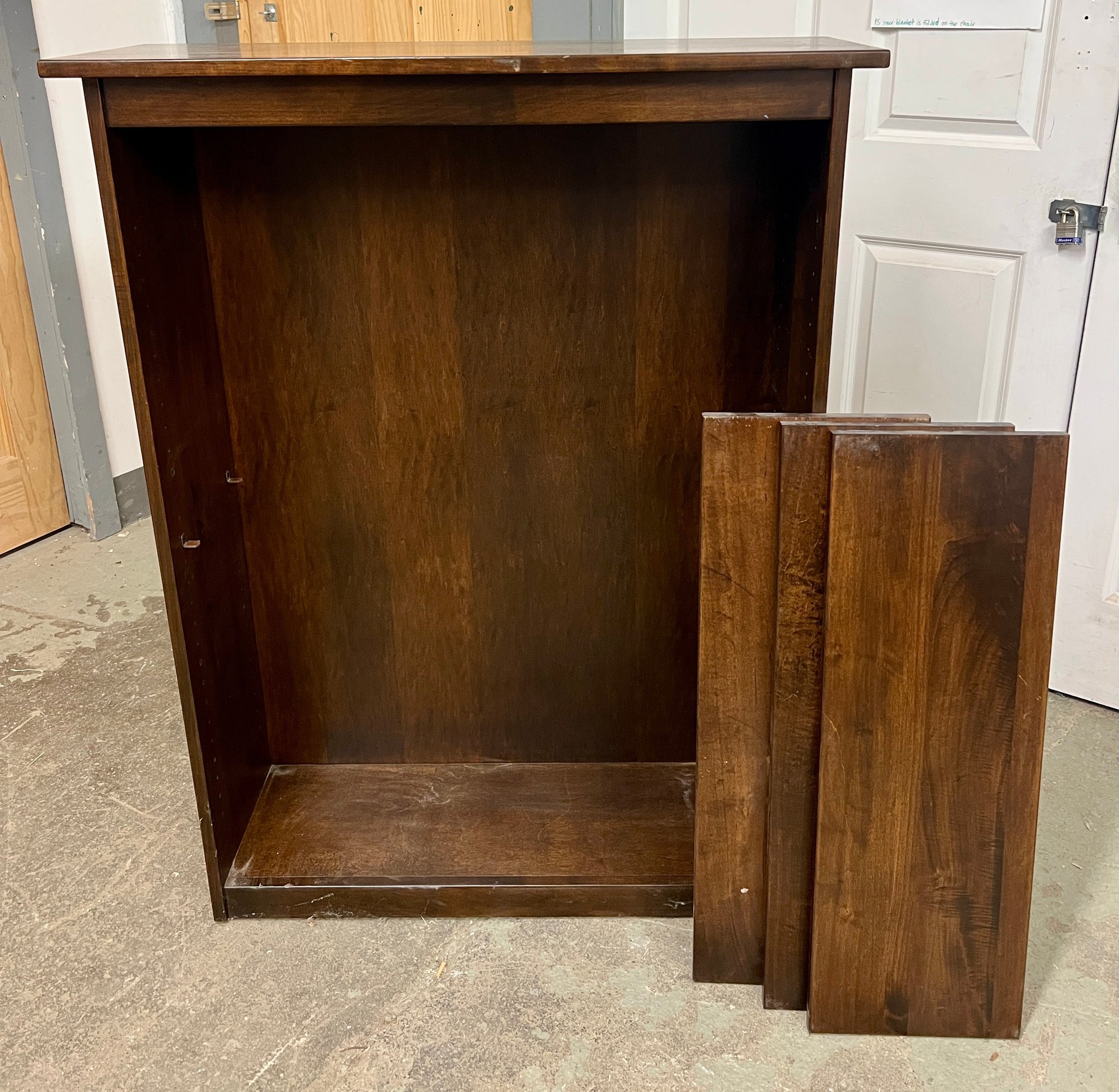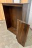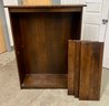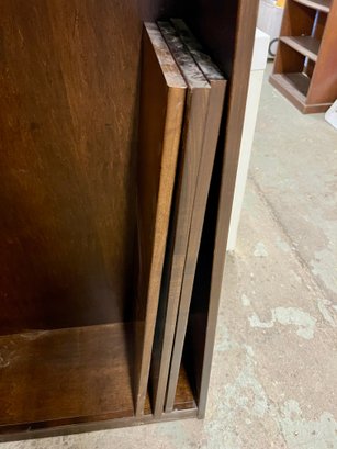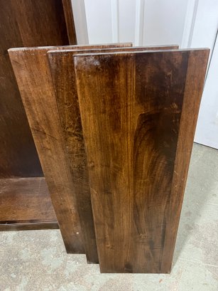 Wooden shelving unit with movable shelves. There are only two support pegs to hold the shelves. Ten additional pegs would be needed to support all three shelves. Some nicks and scuffs are noted on the wood finish.