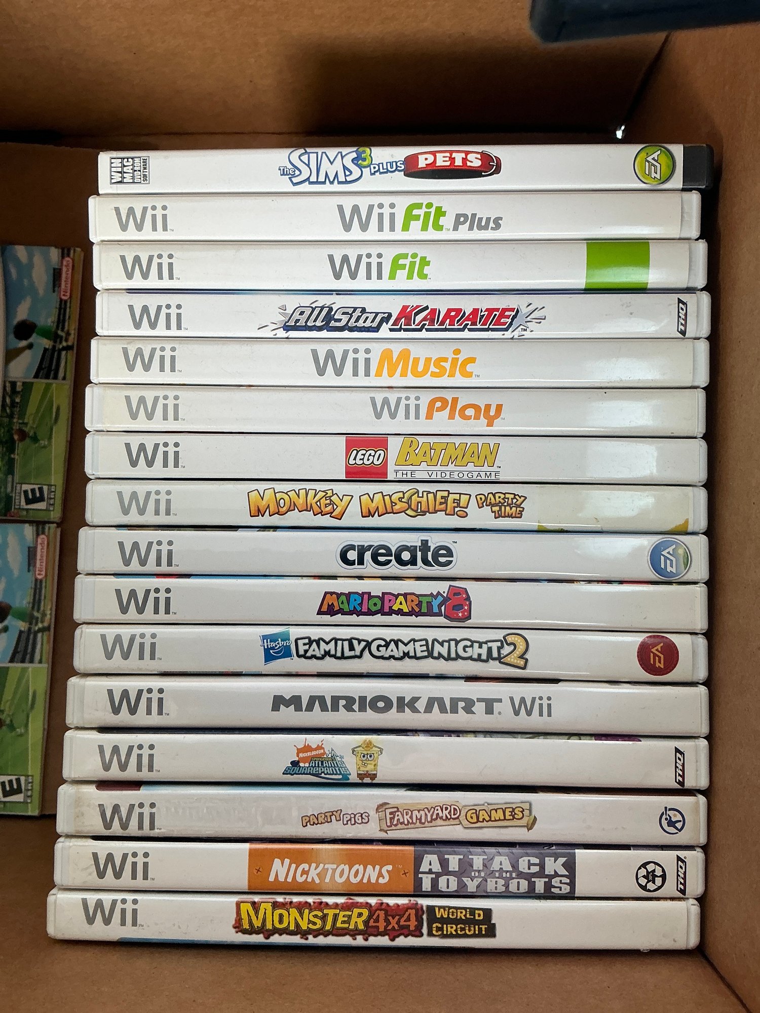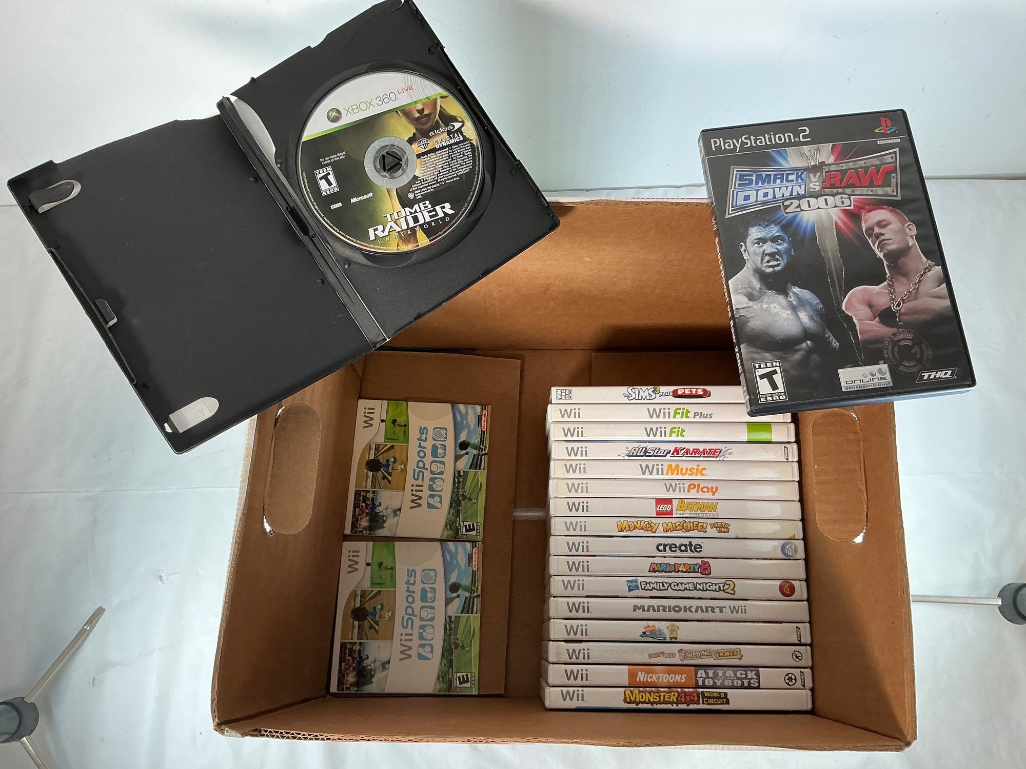 17 Wii Games, Sims 3 Computer Game, Xbox 360 Tomb Rader, PS2 Smack Down Vs Raw, 2 Wii Sports Booklets