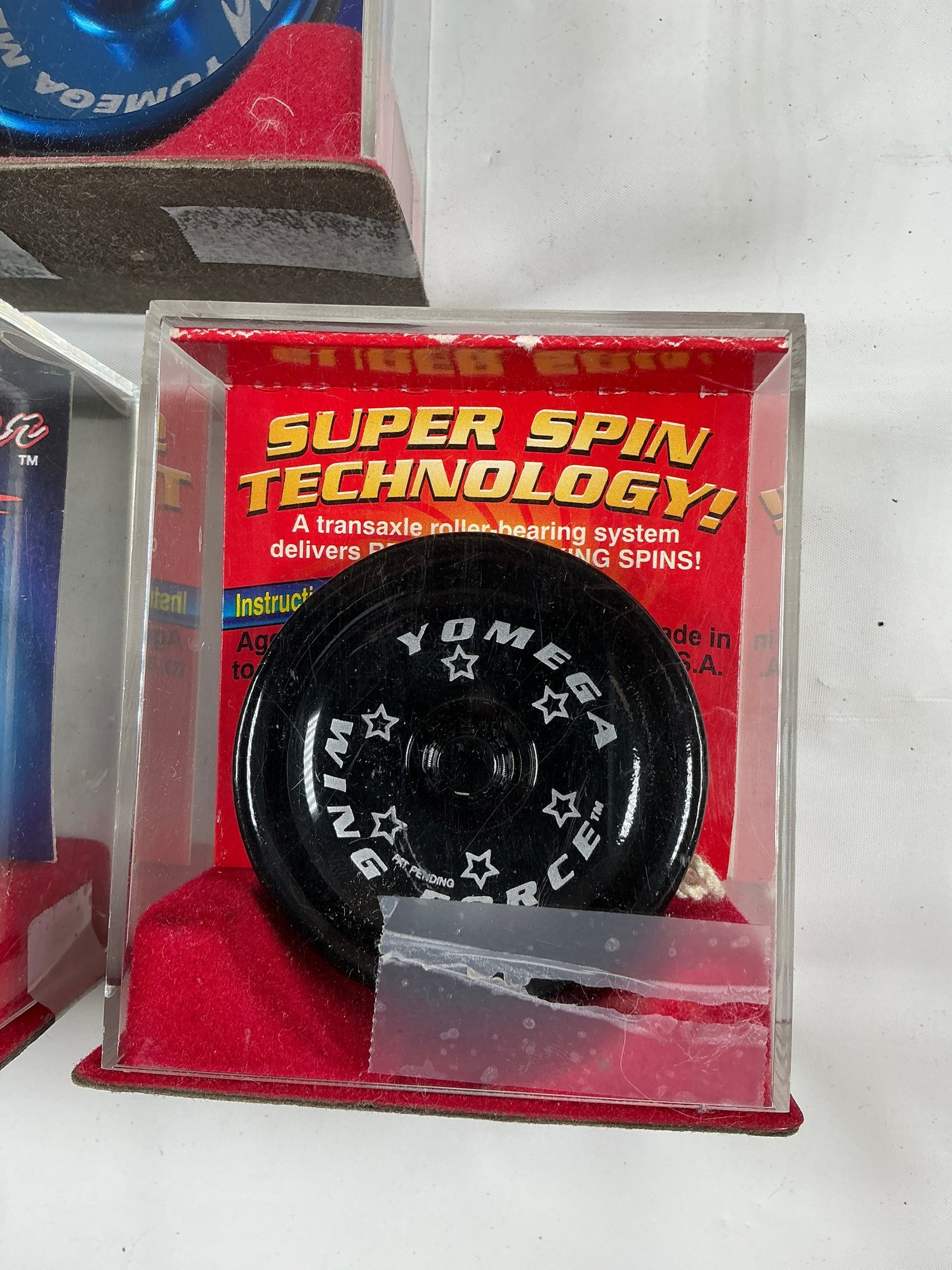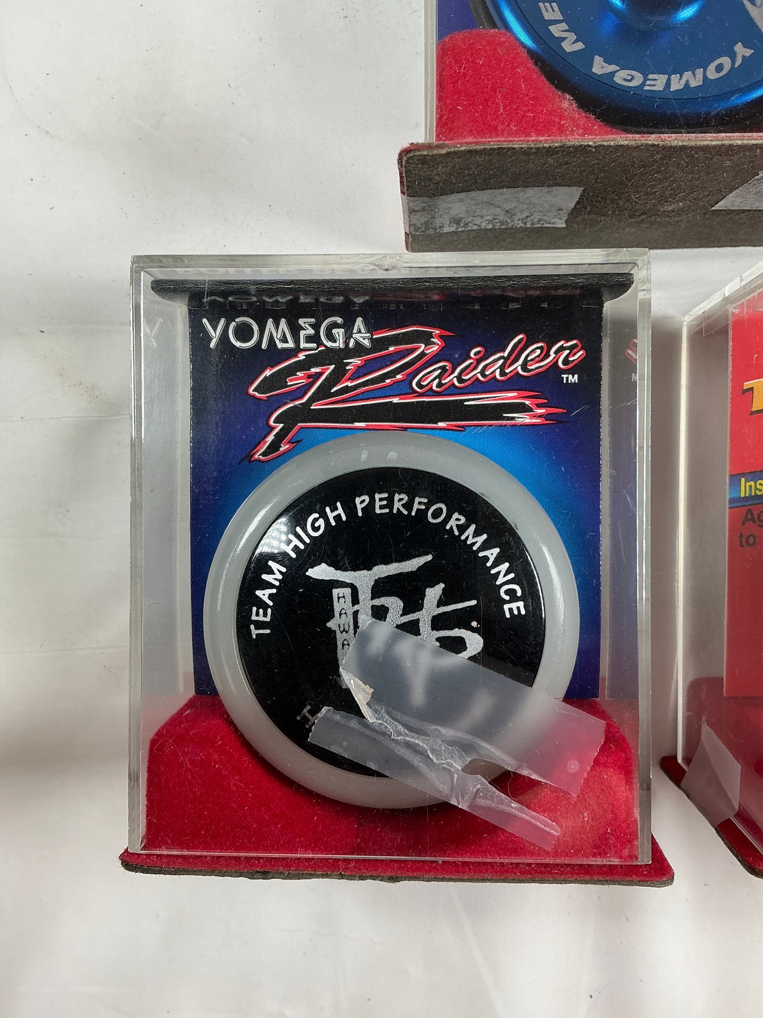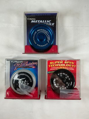 Three Yomega Metallic Missile Yo-yos In Boxes - Metallic Missile, Yomega Raider, Yomega Wing Force