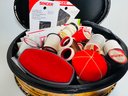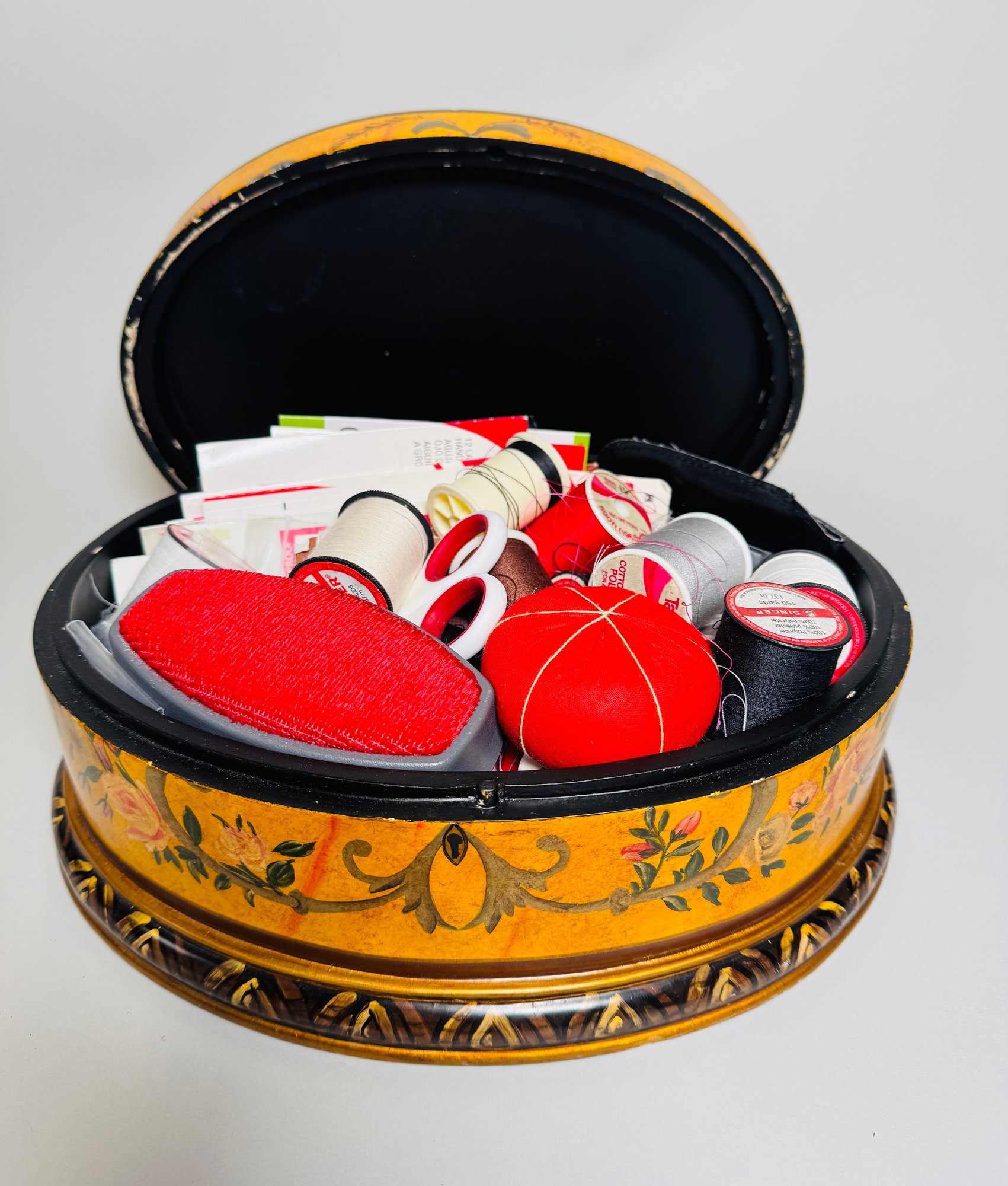Includes thread, needles, measuring tape, etc., H: 5 1/4 x w: 11 1/2 x d: 8 1/2 inches