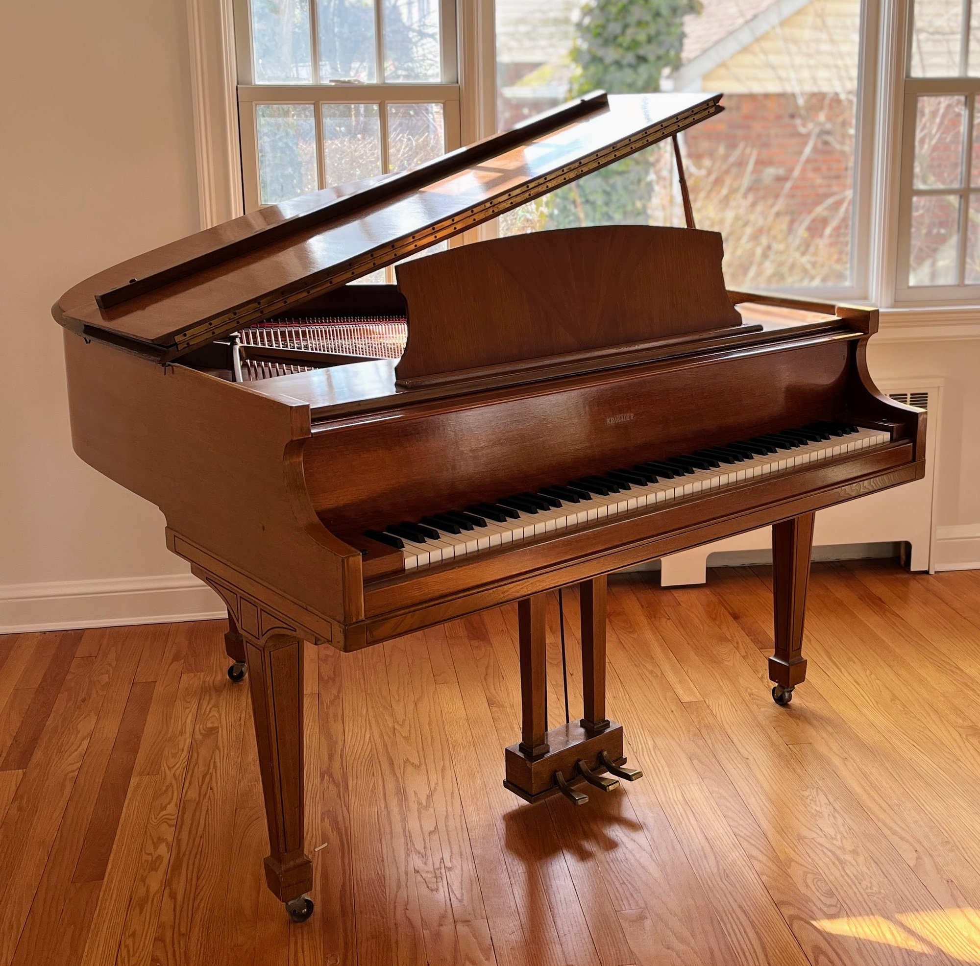 CONDITION: Sun fading and crackling to the case. This piano was refurbished in 2018. Including: Cracked soundboard was repaired and refinished. Some cracks appear to have re-opened. Felt was replaced. New Bass strings. New table strings. All new tuning pins. Overhauled piano action. Needs tuning. Invoice for service is in images.