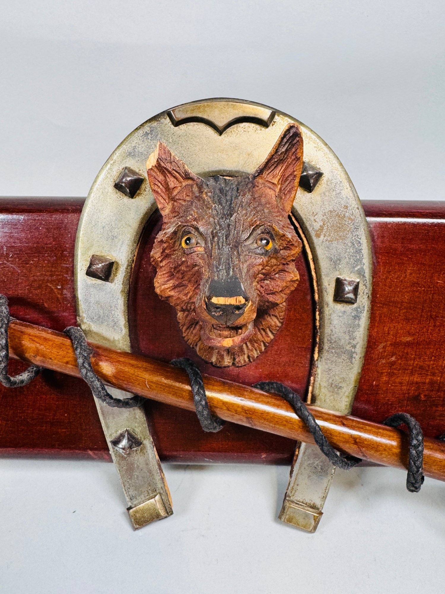 CONDITION: Wood carved fox head has chipped ear and is loosely mounted, coat hooks need cleaning