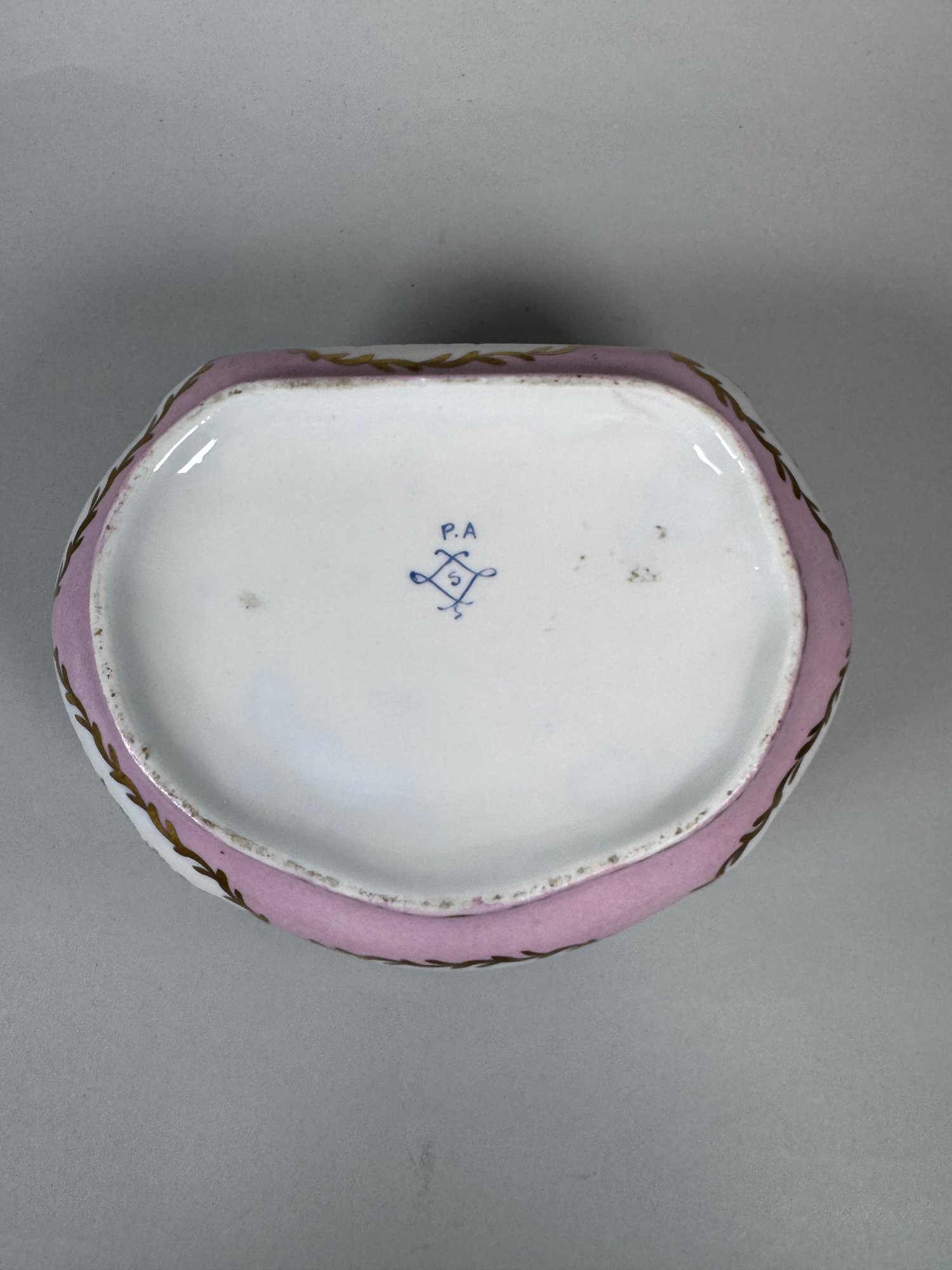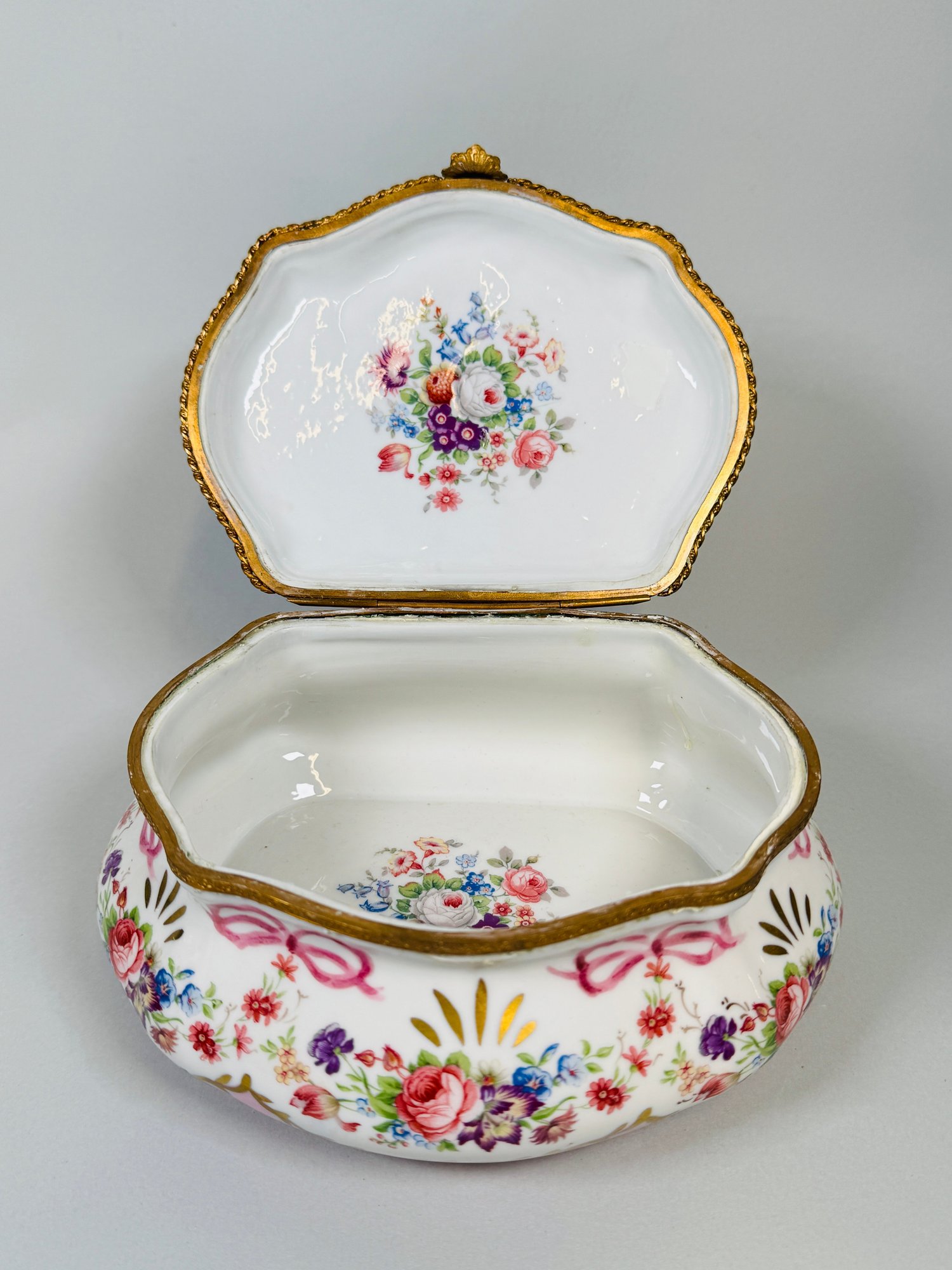 Transfer printed with hand painted details and gilt brass mounts, h: 3 1/2 x w: 7 1/2 x d: 6 inches