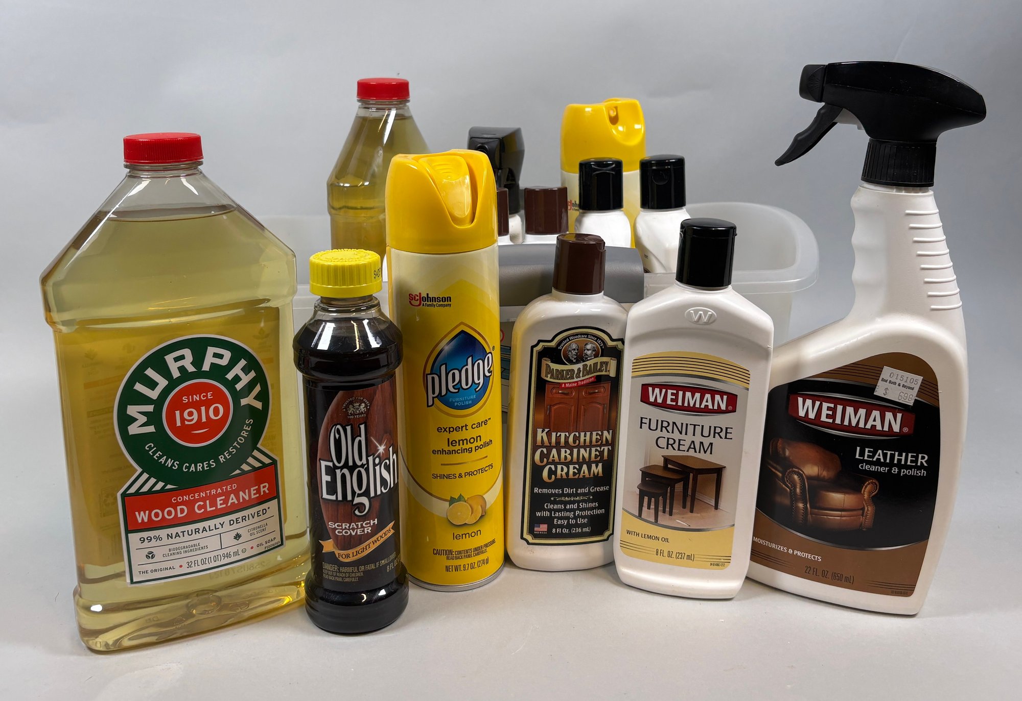 4 Parker & Bailey kitchen cabinet cream, 3 Weiman furniture cream, 2 Murphy Oil wood cleaner, 2 Pledge aerosol furniture Polish, 2 spray Weiman leather cleaner/polish, 1 old English scratch cover liquid. 14 items total