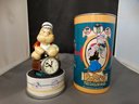 5" high painted and glossed Popeye figurine holding a can of spinach. 3/8" diameter silver luster metal case. Popeye dial with animated arms. Original leather band with all papers and certificate of authenticity included. New in canister, 3.5" in diameter and 6" high, #8436/1500.