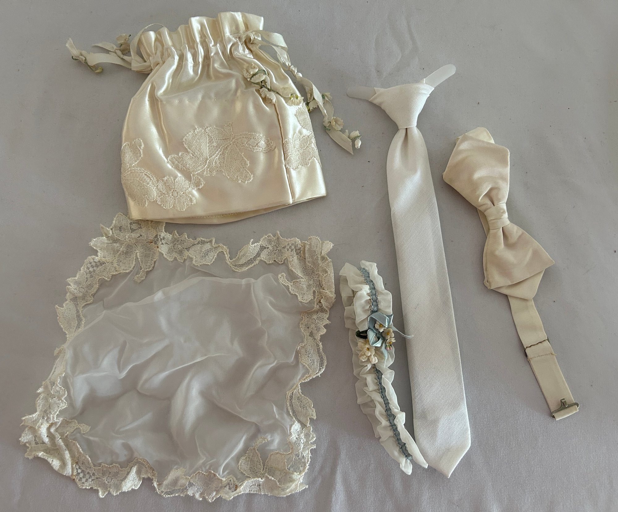Antique Wedding Accessories: Satin Bag, Garter, Boy's Tie, Bowtie And Lace Handkerchief