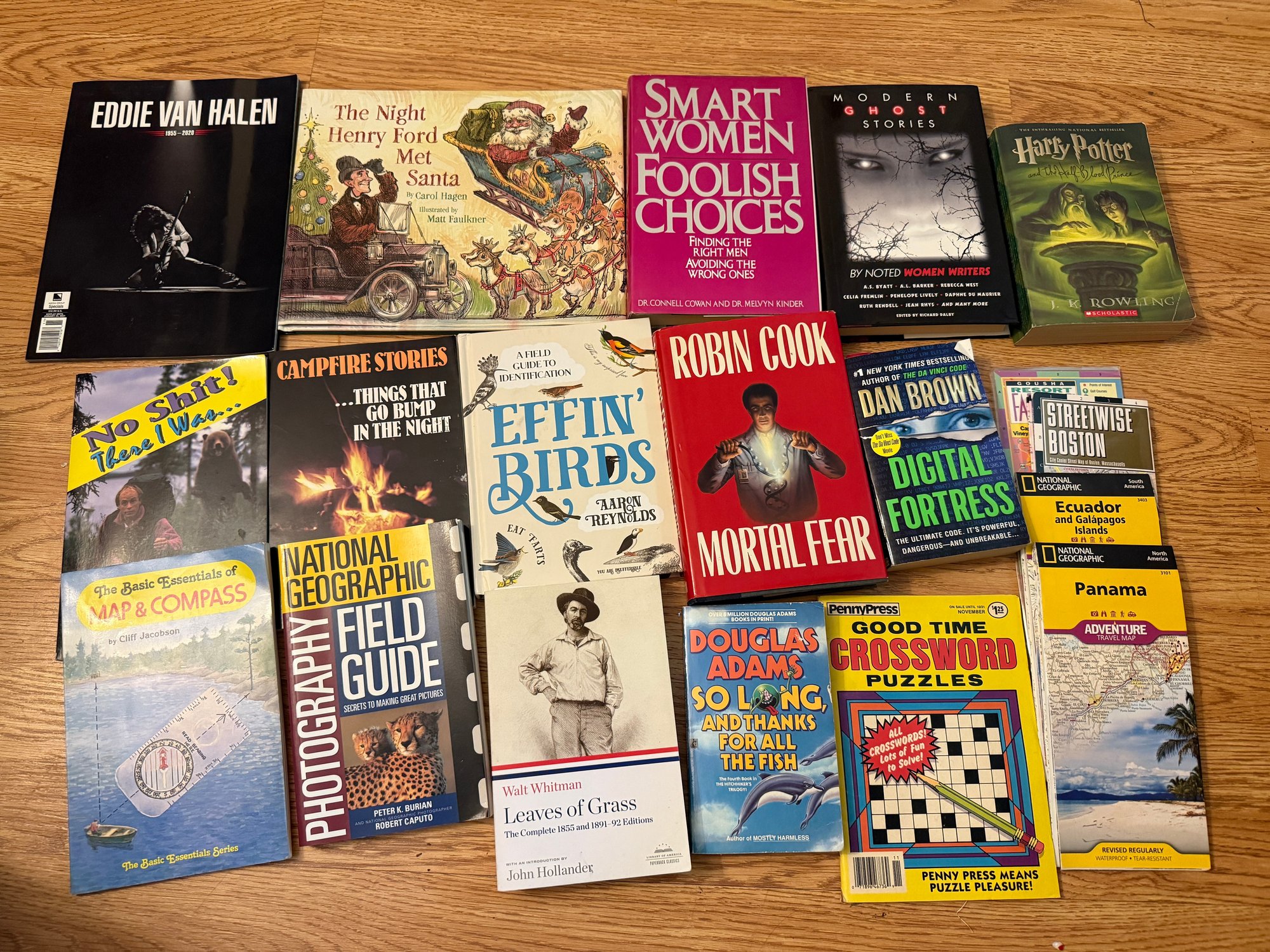 Book Collection Eddie Van Halen, Harry Potter, Effin Birds, National Geographic Field Guide, Maps, Crosswords